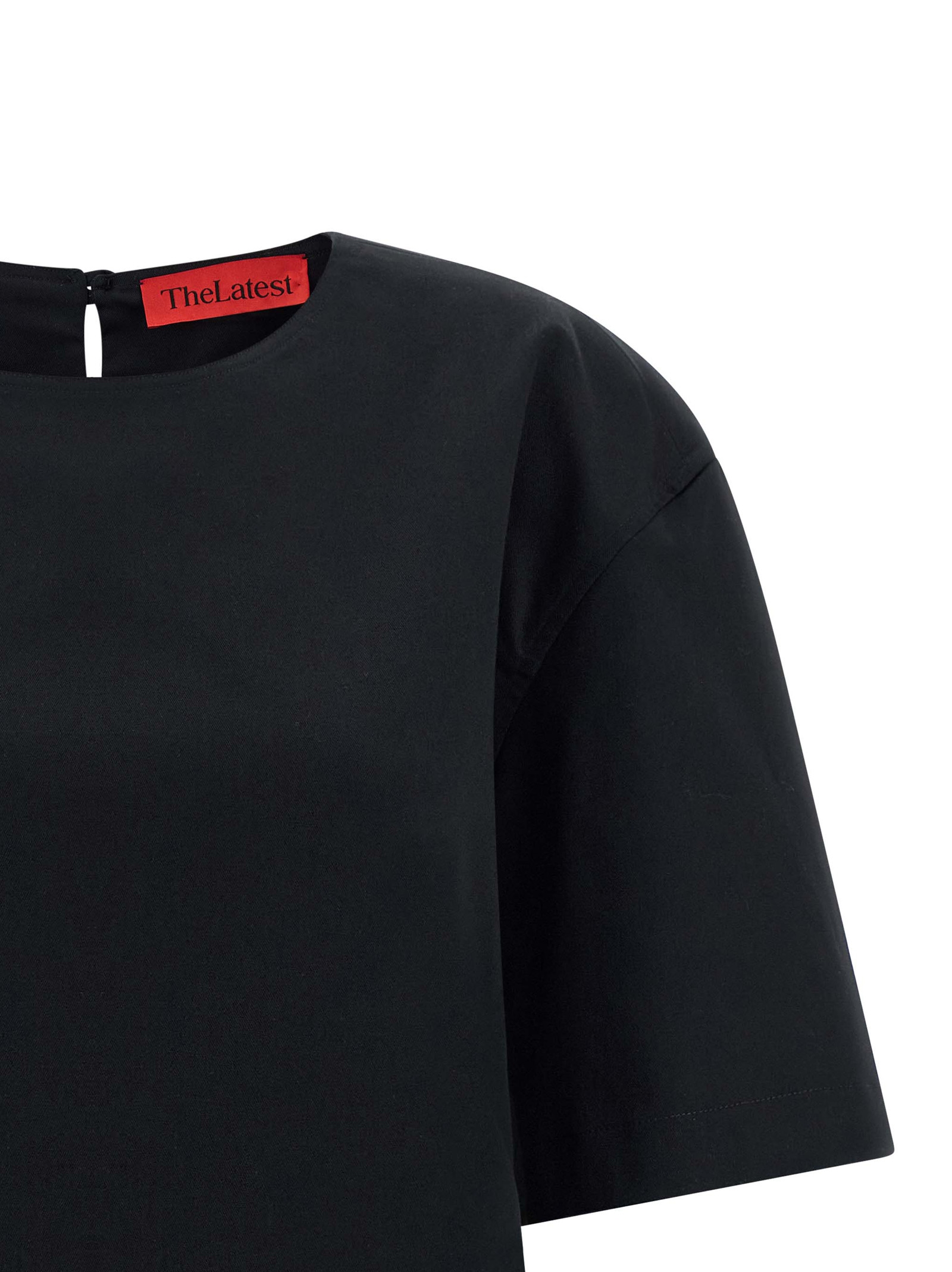 ‘Dean’ rigid cotton gabardine crewneck t-shirt with back button closure, teardrop cut-out detail and short sleeves.