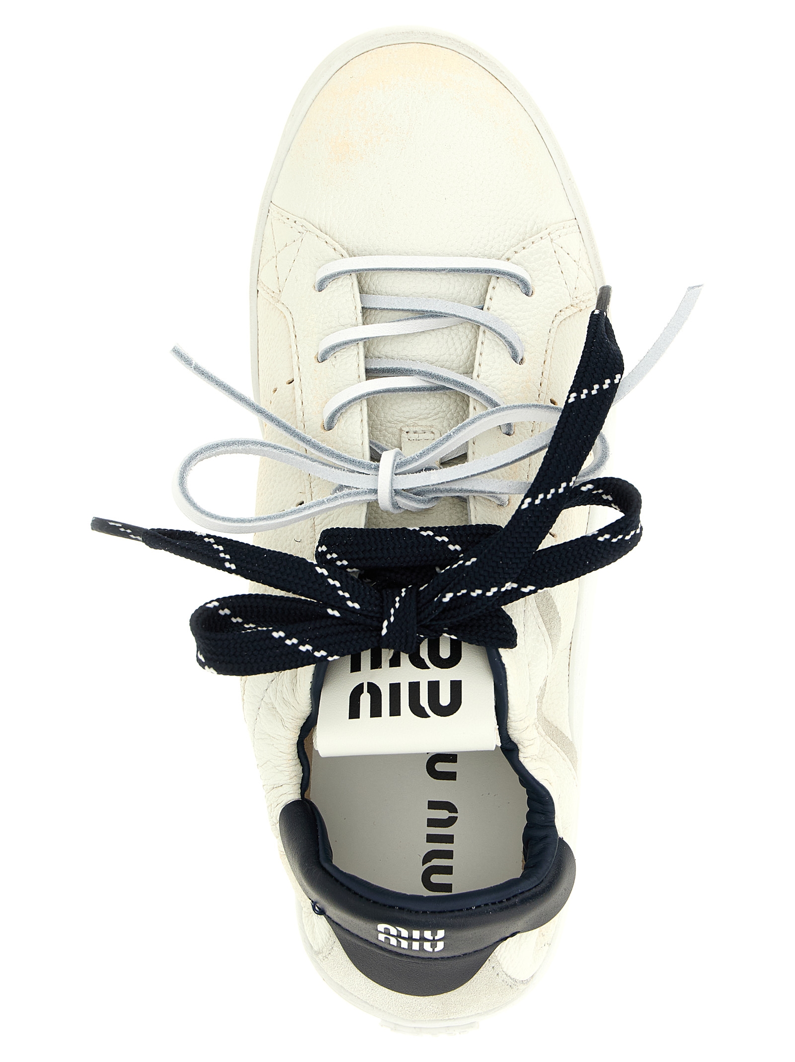 Hammered calf leather sneakers with deco’ lived-in treatment, punctured upper, contrast heel, embossed logo on tongue and heel, lace-up closure, removable leather-covered insole, rubber sole.