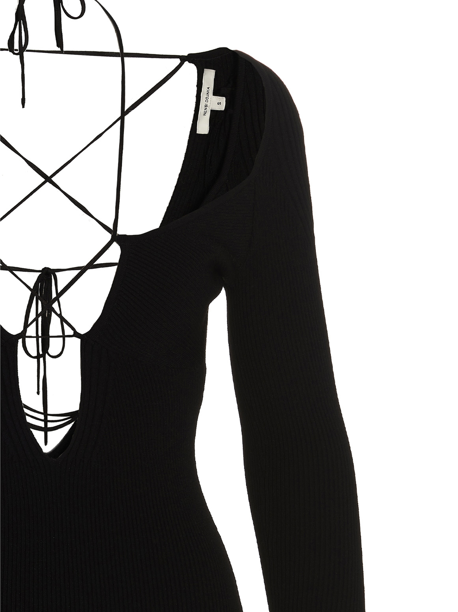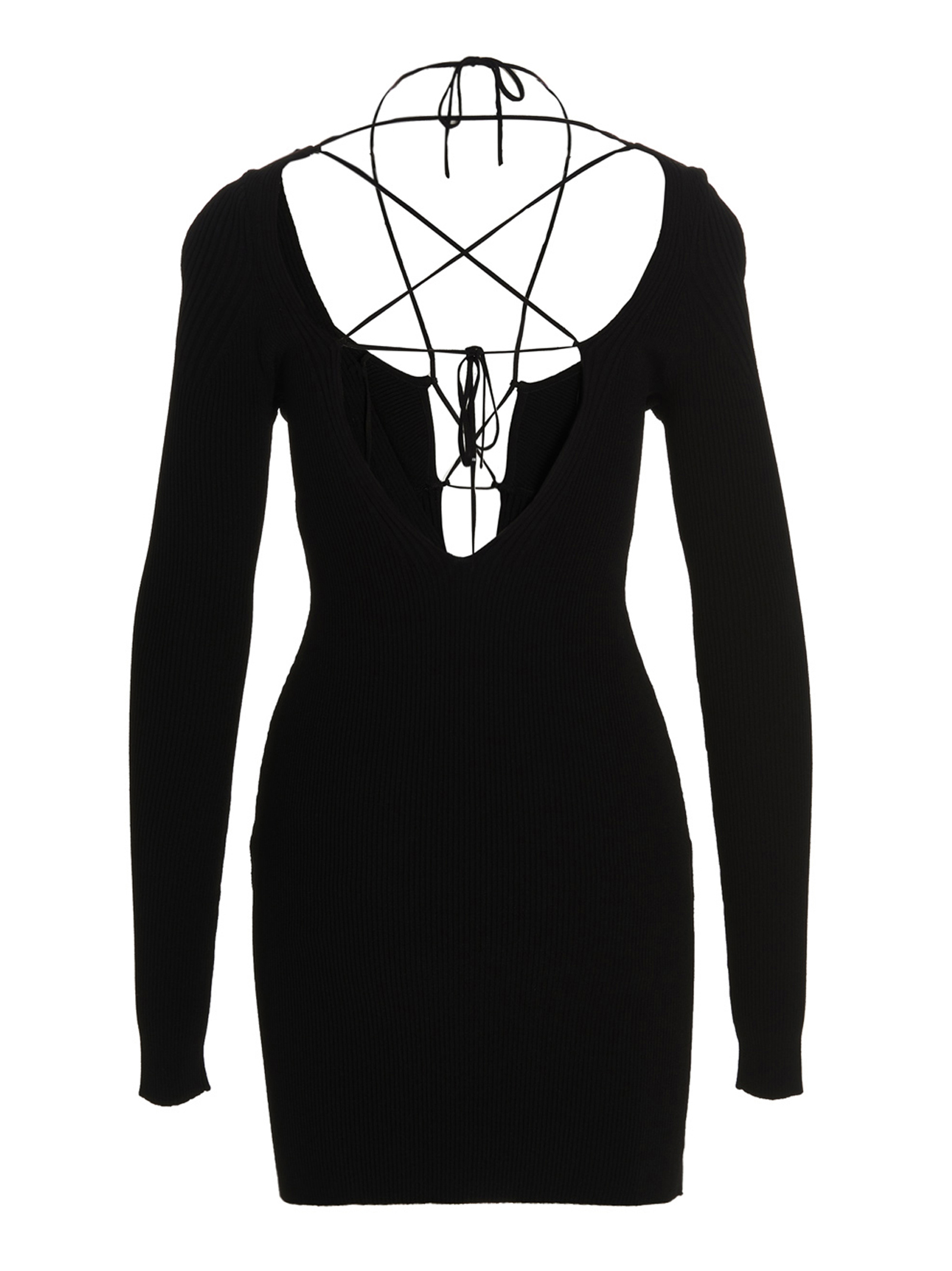 Ribbed viscose minidress with plunging neckline at the front and back and a lace-up detail. Long sleeves style.ed model.