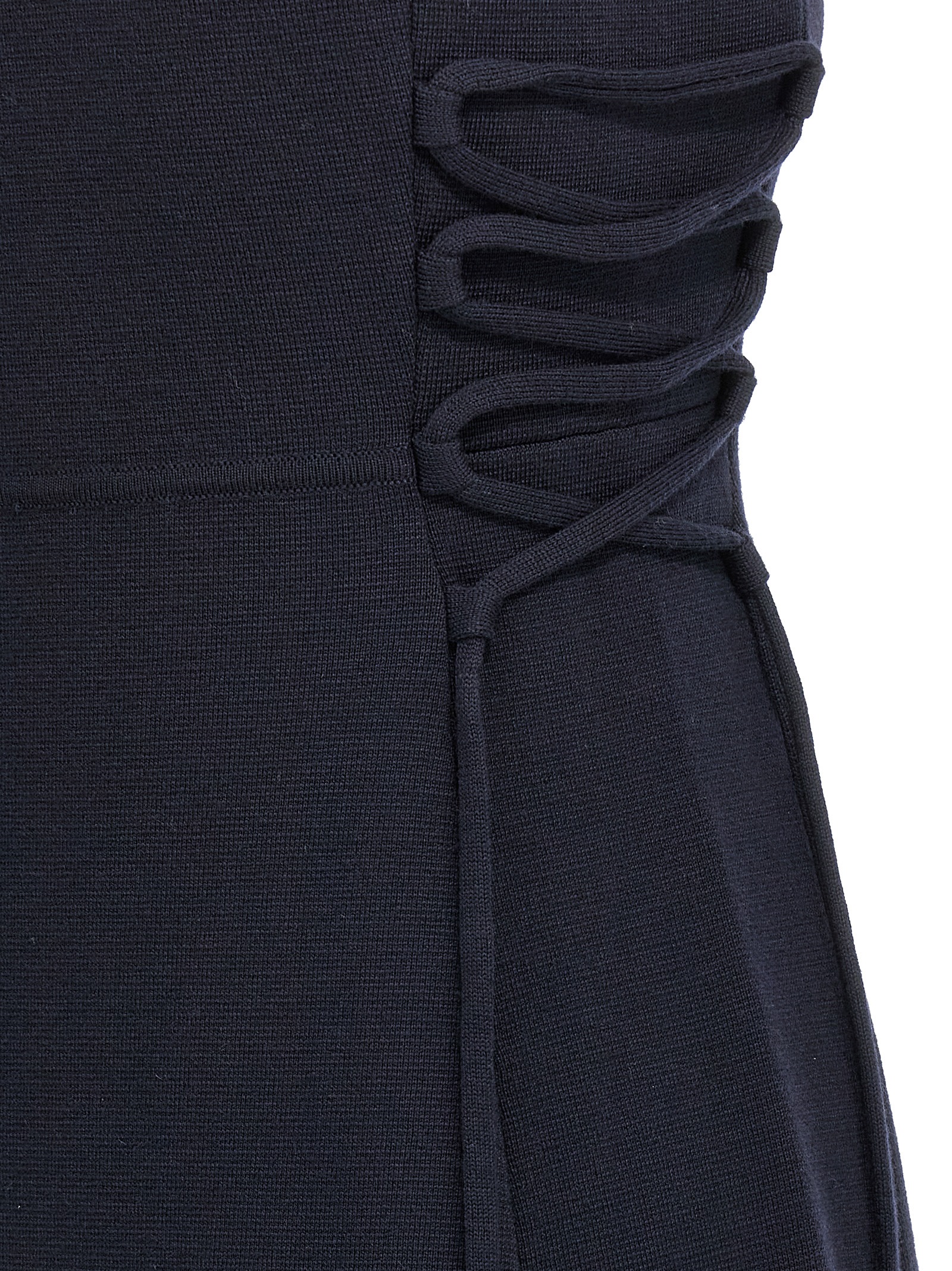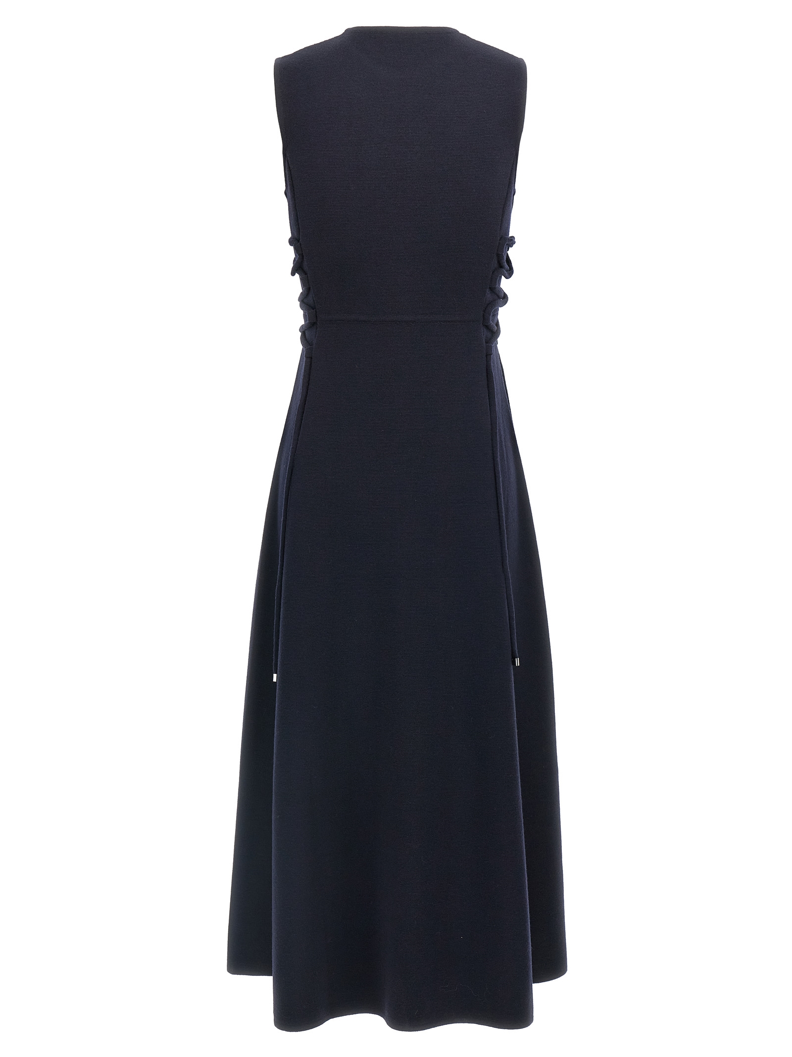 ‘Delfi’ midi dress in pure wool yarn worked in fabric stitch, flared skirt, side drawstring, crew neck, sleeveless.