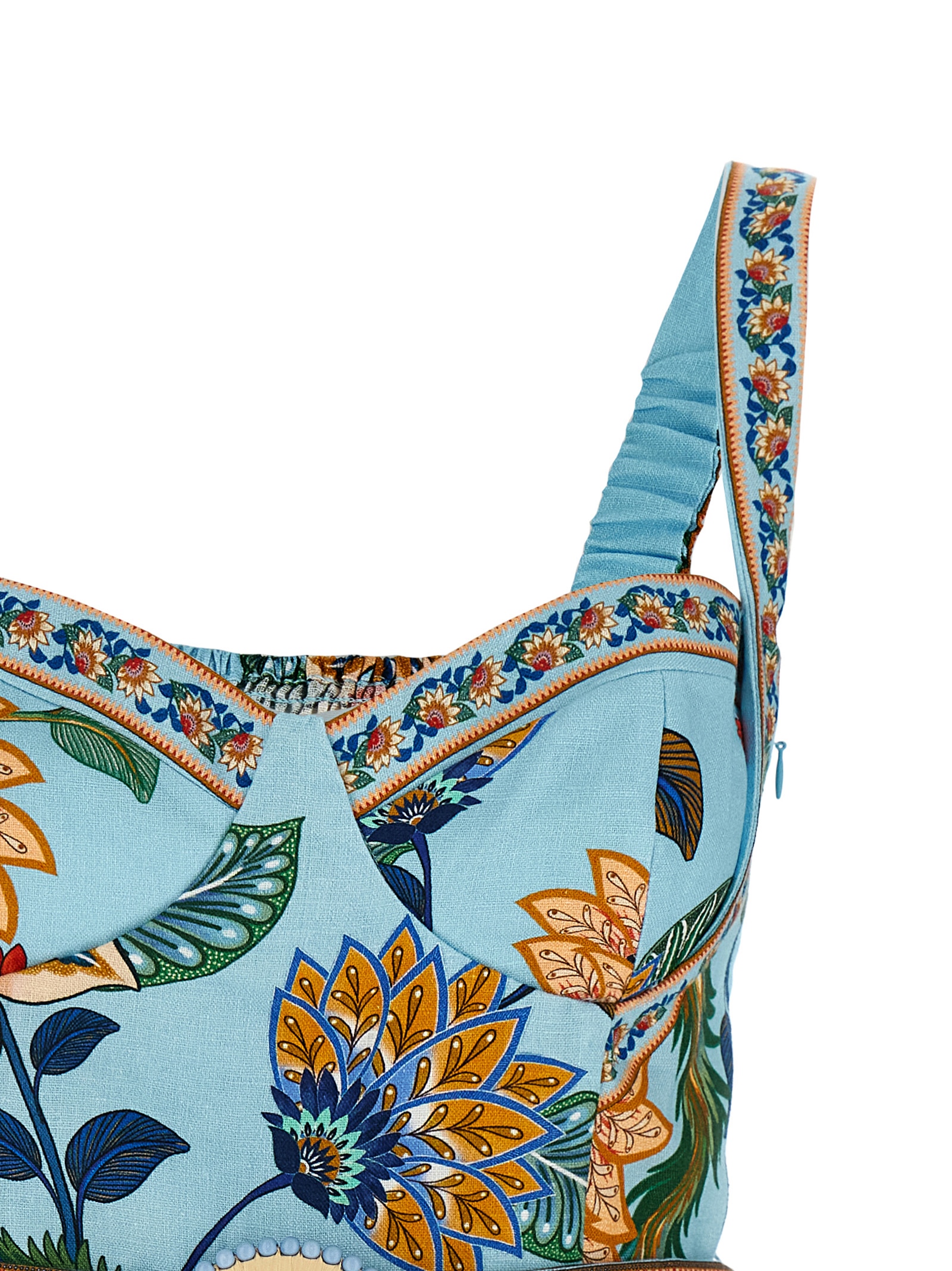 Euroflax™ Premium linen jumpsuit Delhi floral pattern, bodice upper part, sweetheart neckline, wide shoulder straps with back elastic insert, sleeveless, side zip closure, back smock stitch, front and back clamp shorts, high waist, American pockets, turn-up on the leg bottom, matching removable belt.
