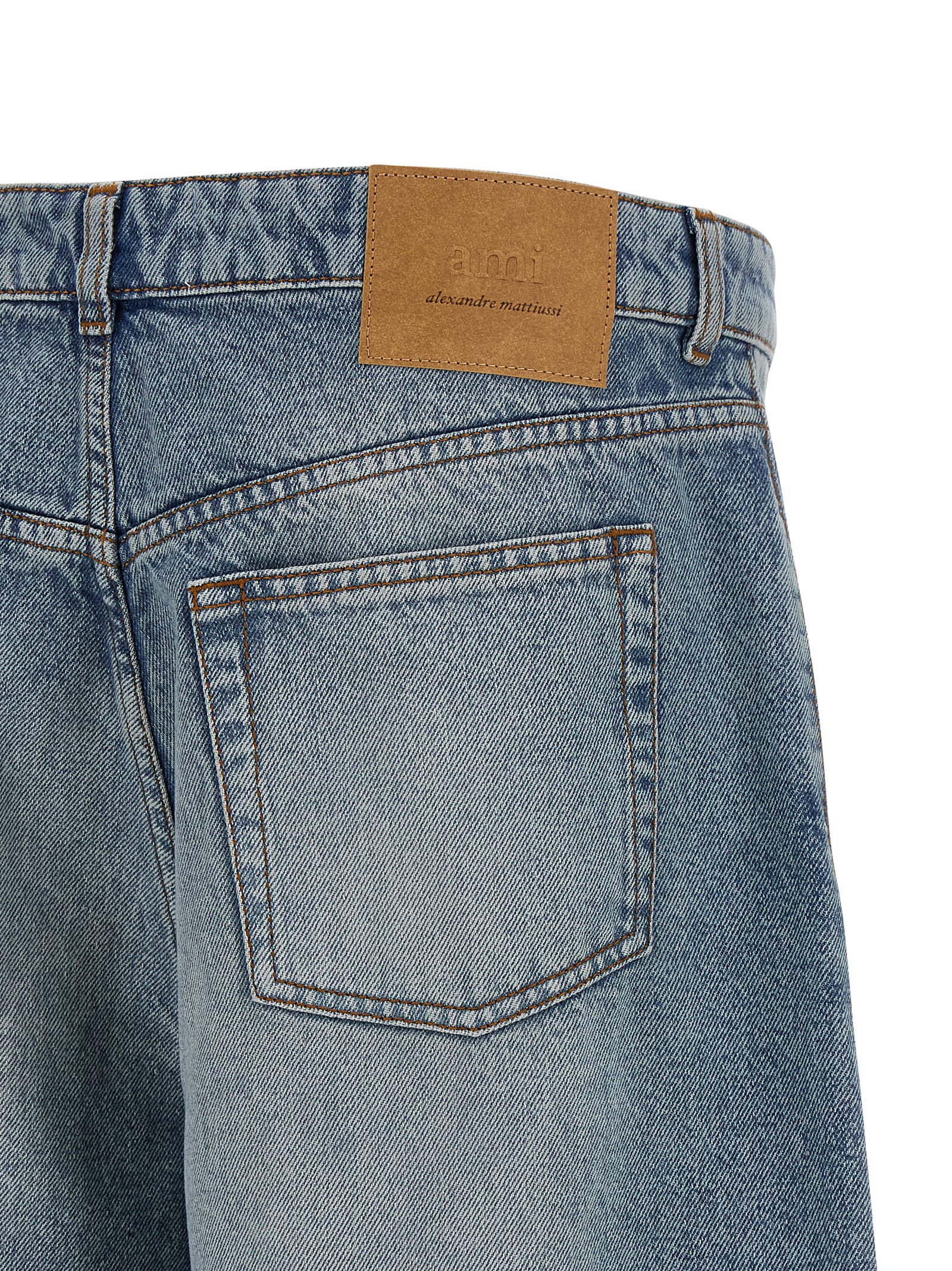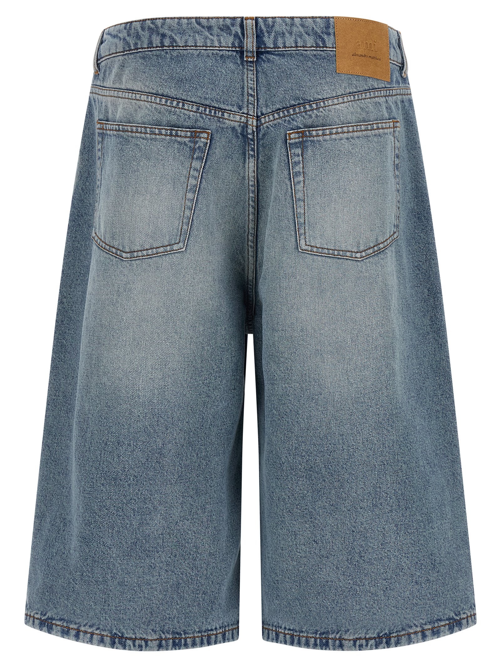 Stone-washed cotton denim bermuda shorts with contrast stitching, flared wide leg, front button closure, five pockets, and leather logo label at the back.