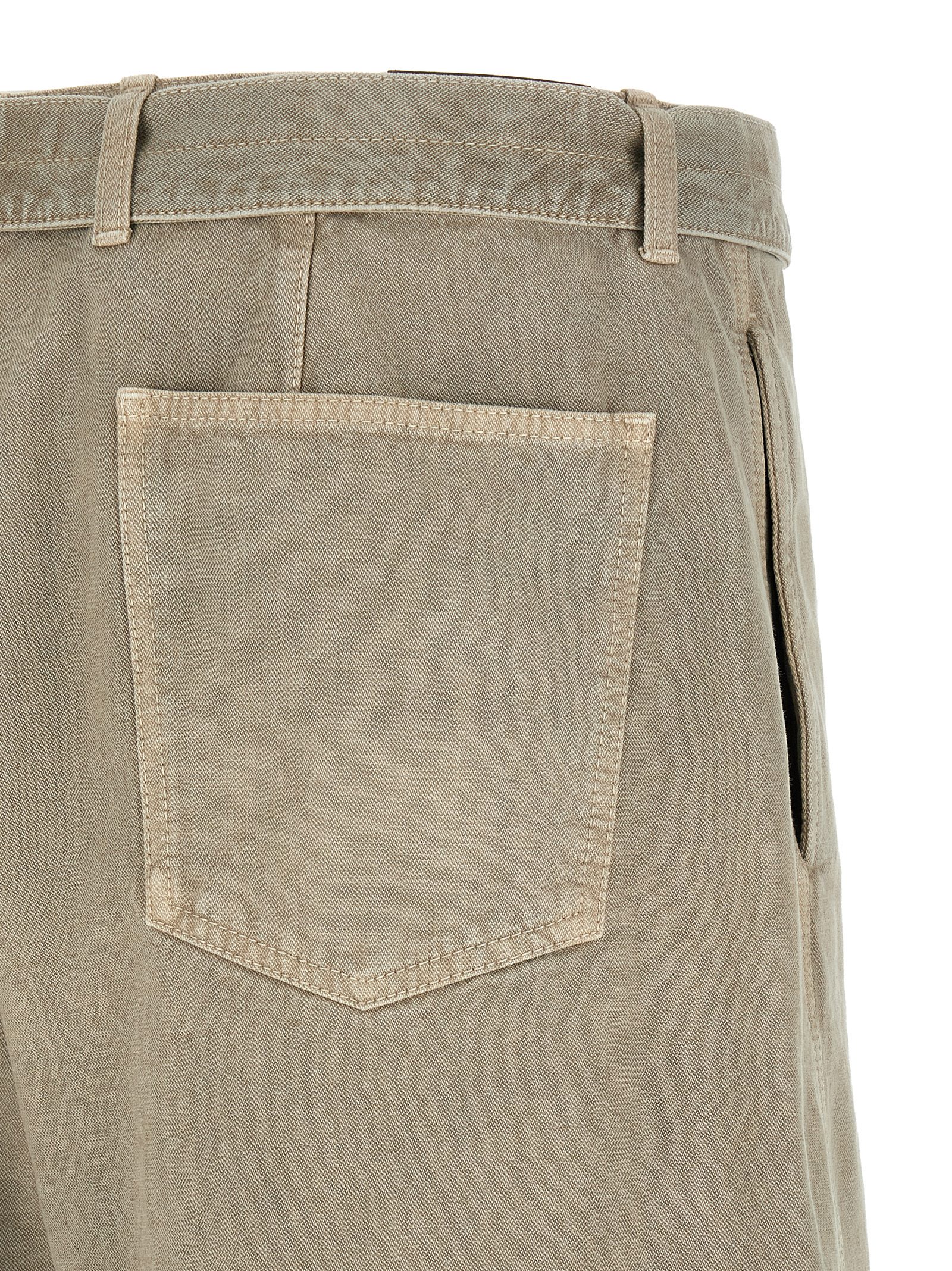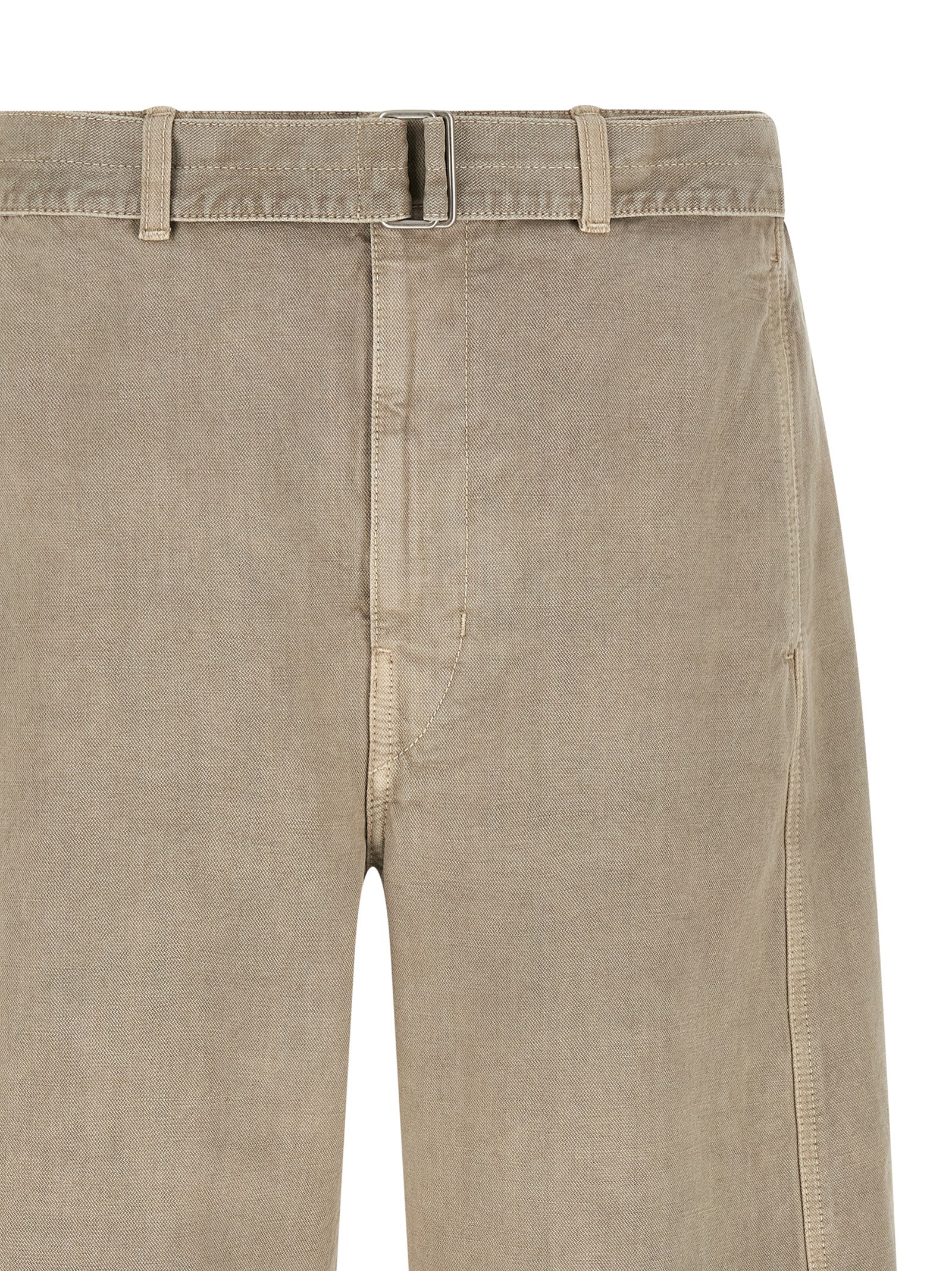 Garment-dyed cotton denim bermuda shorts with flared wide leg, hook and button zip closure, front French pockets, back welt pockets, removable matching belt.
