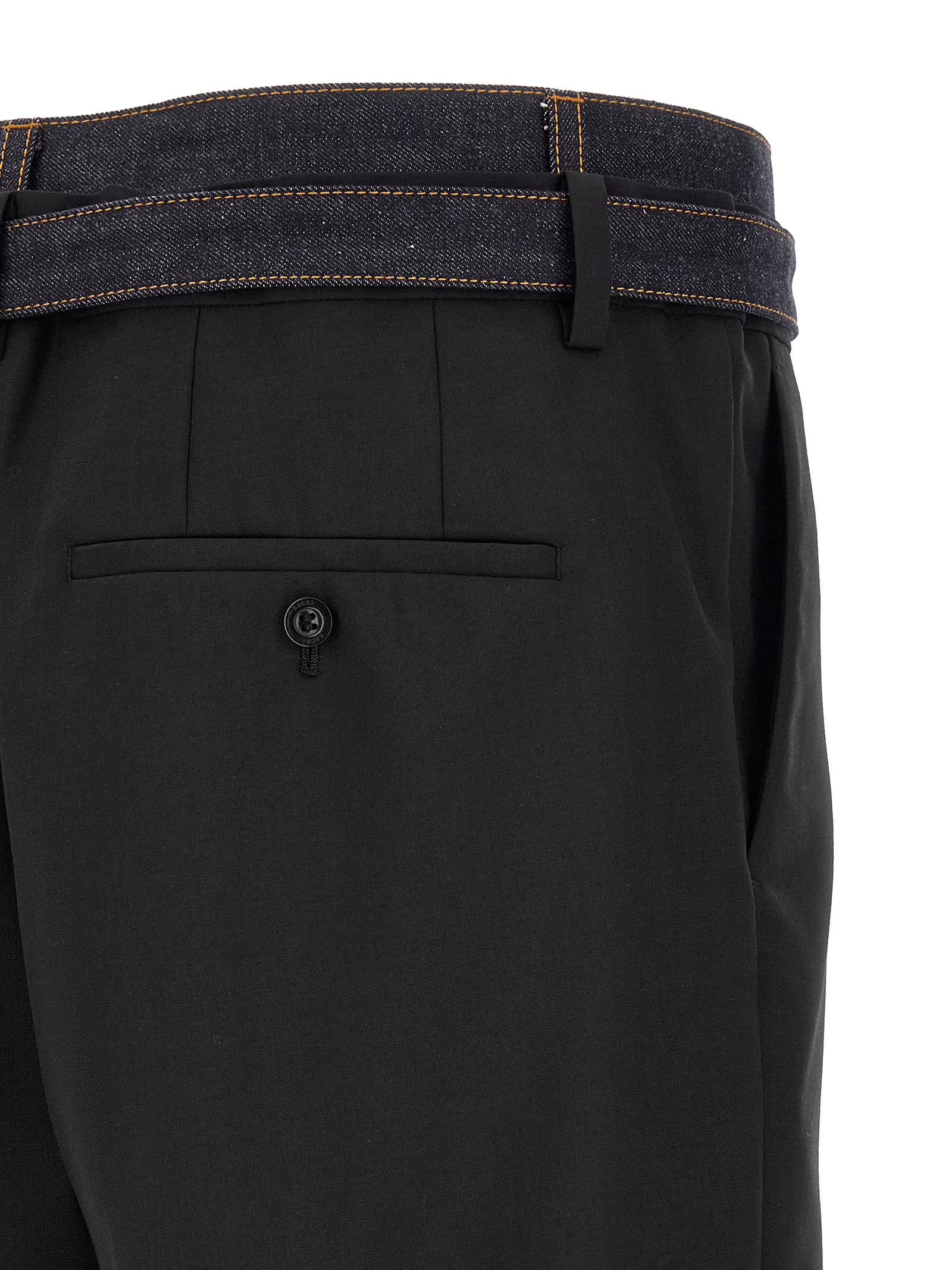 Wool blend trousers, double layer waist with denim insert with contrast stitching, wide and straight leg, stretched pleat, front zip and button closure, pockets, removable denim belt.