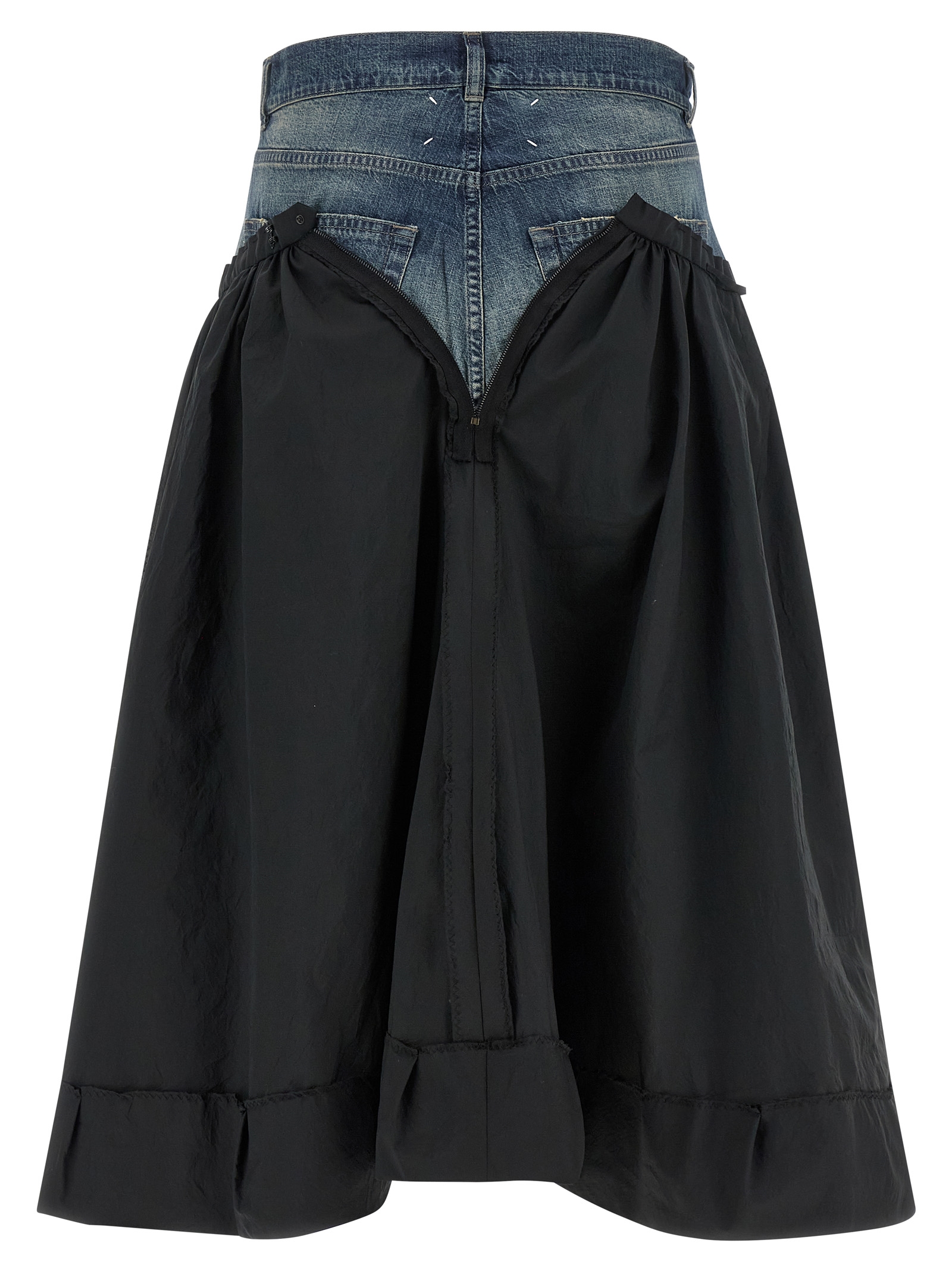 Midi skirt in wrinkled satin-effect fabric, inside-out reverse construction, flared silhouette, trompe l’oeil jeans insert at the waist in cotton denim, hook and front zip button closure, five pockets, ‘Four Stitches’ at the back, turn-up with raw cut hem on the hem.