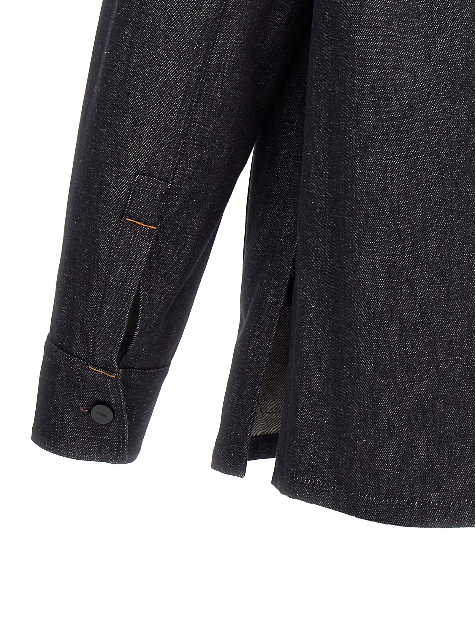 Cotton denim jacket with button closure, pockets, long cuffed sleeves, deer-print leather logo patch with Selleria stitching on the back of the neck.