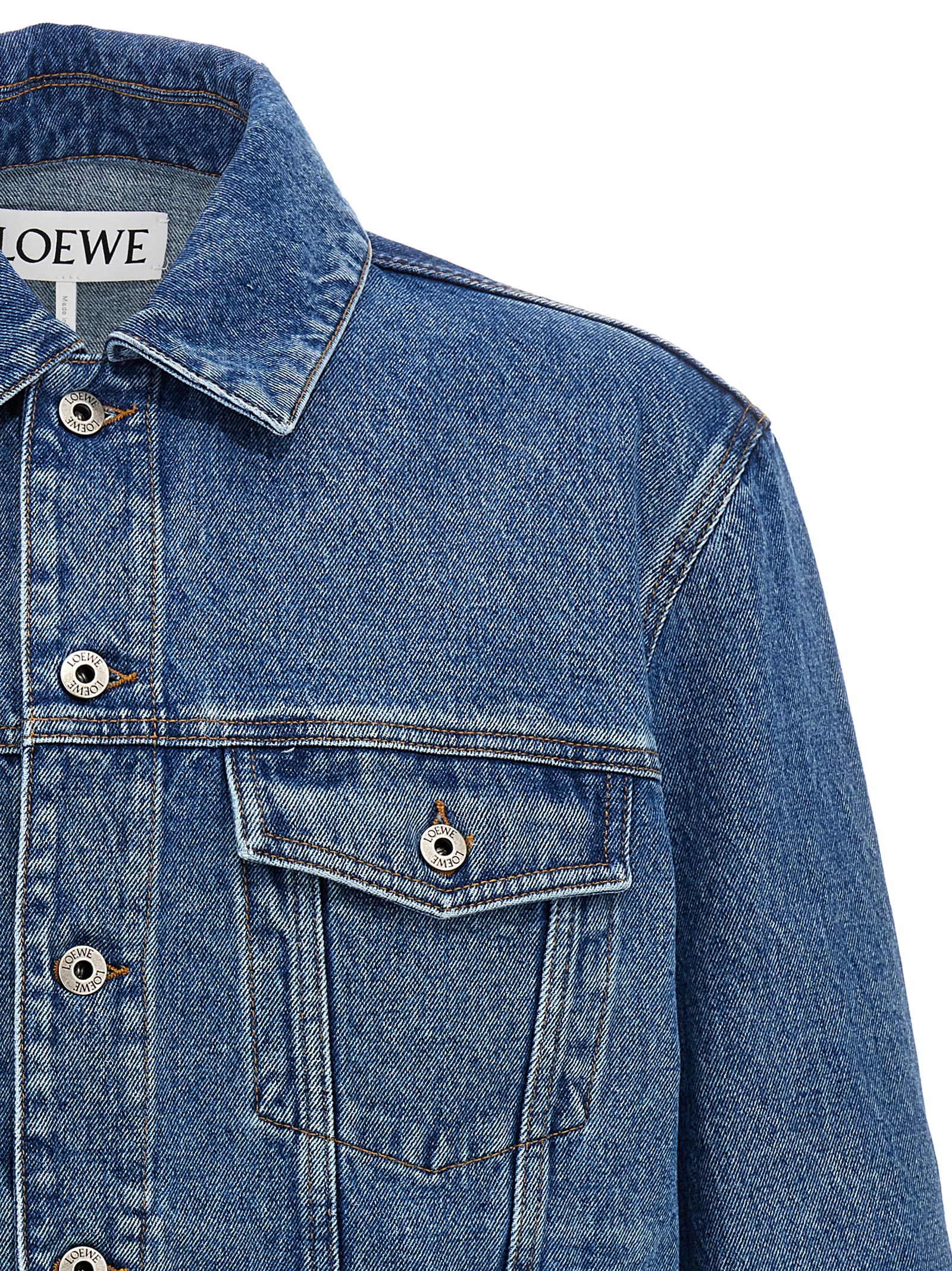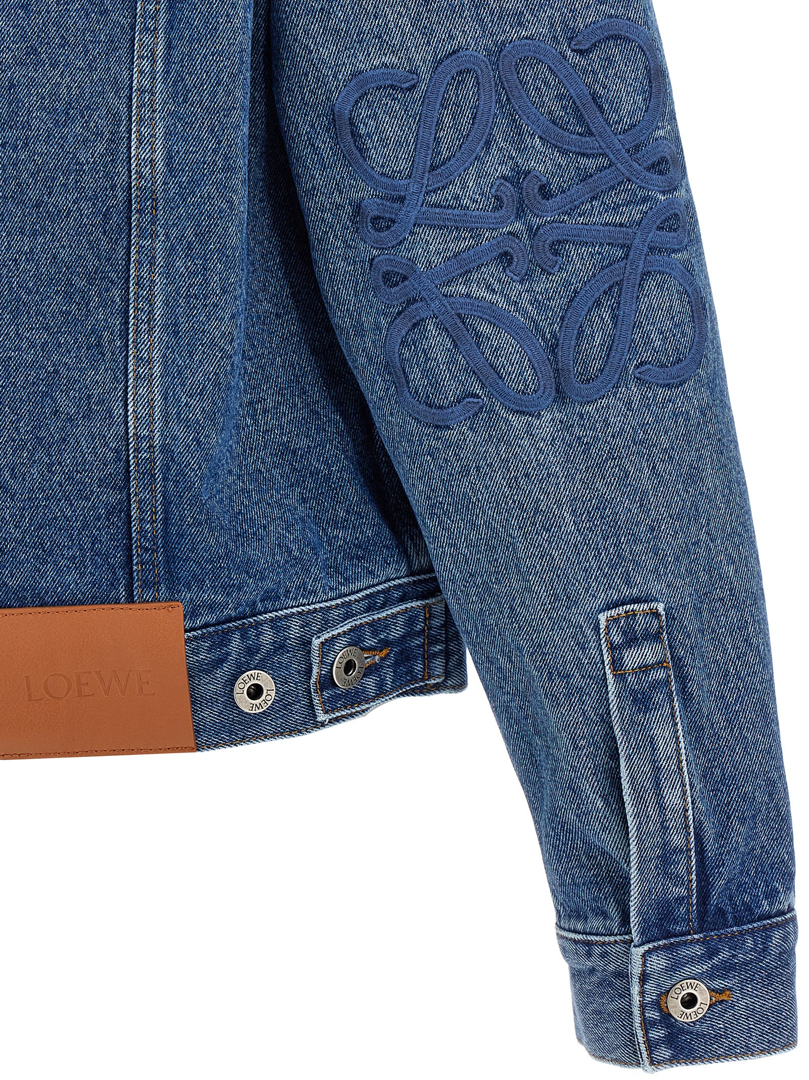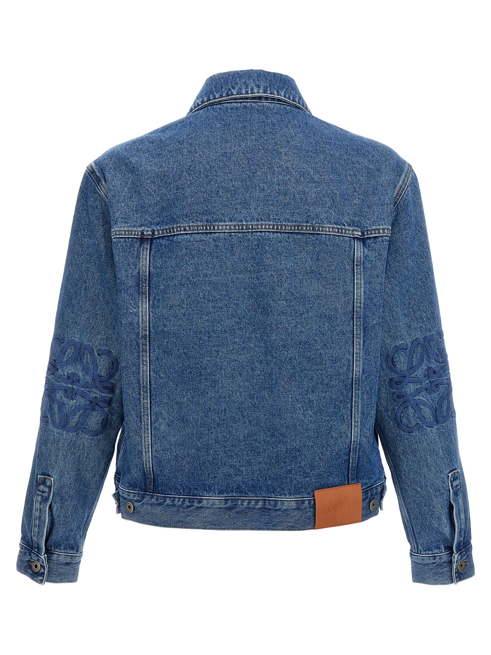 Cotton denim jacket with front button closure, pockets, long cuffed sleeves, shirt collar, and leather logo label on the back.