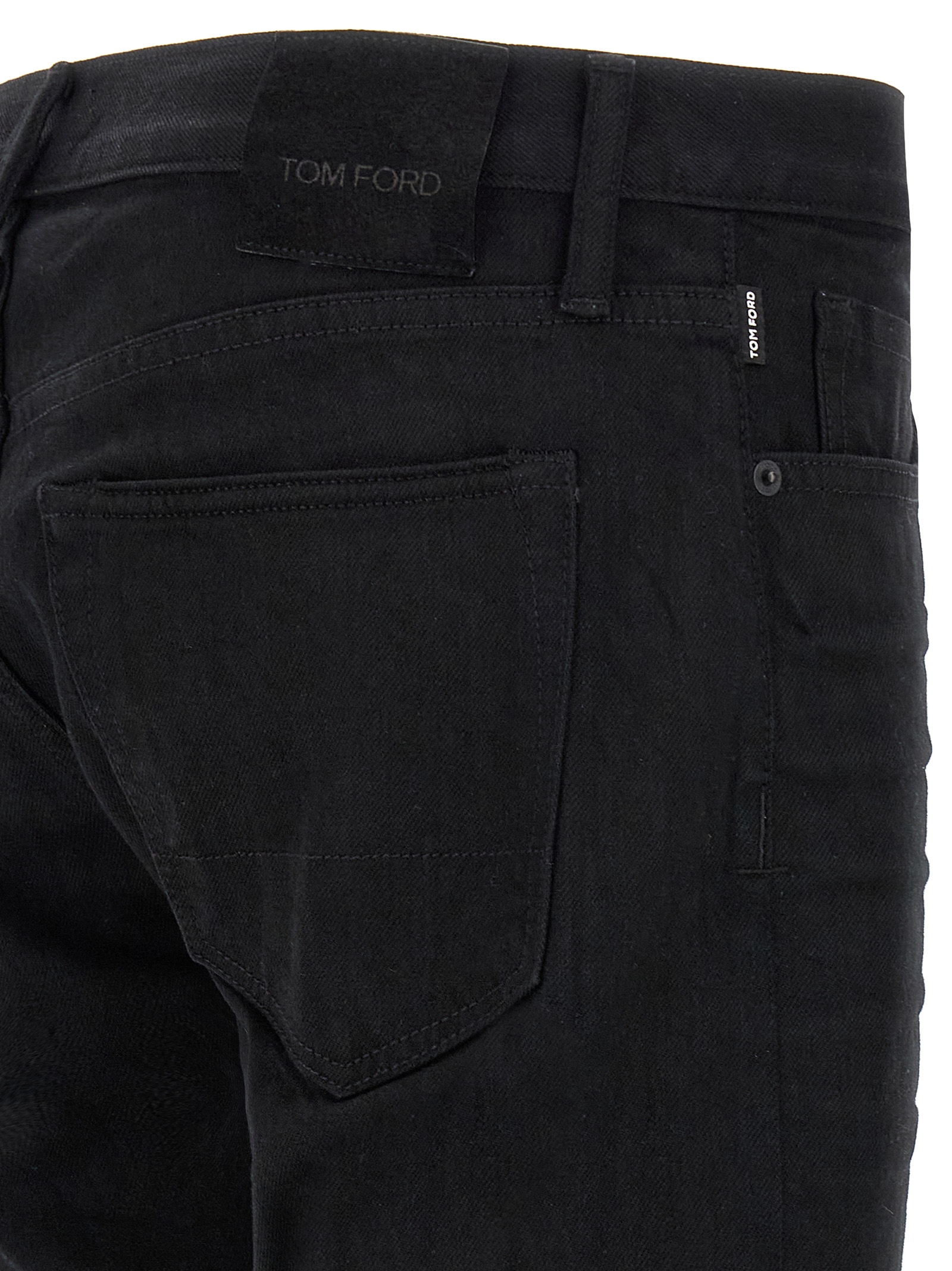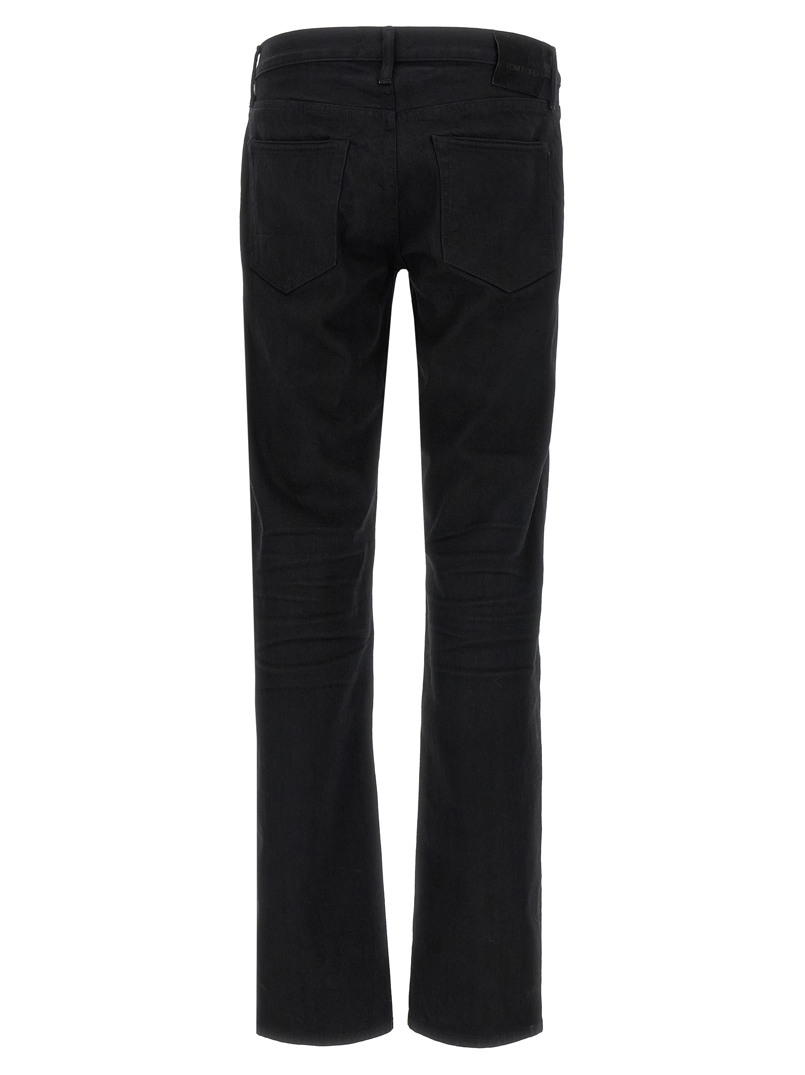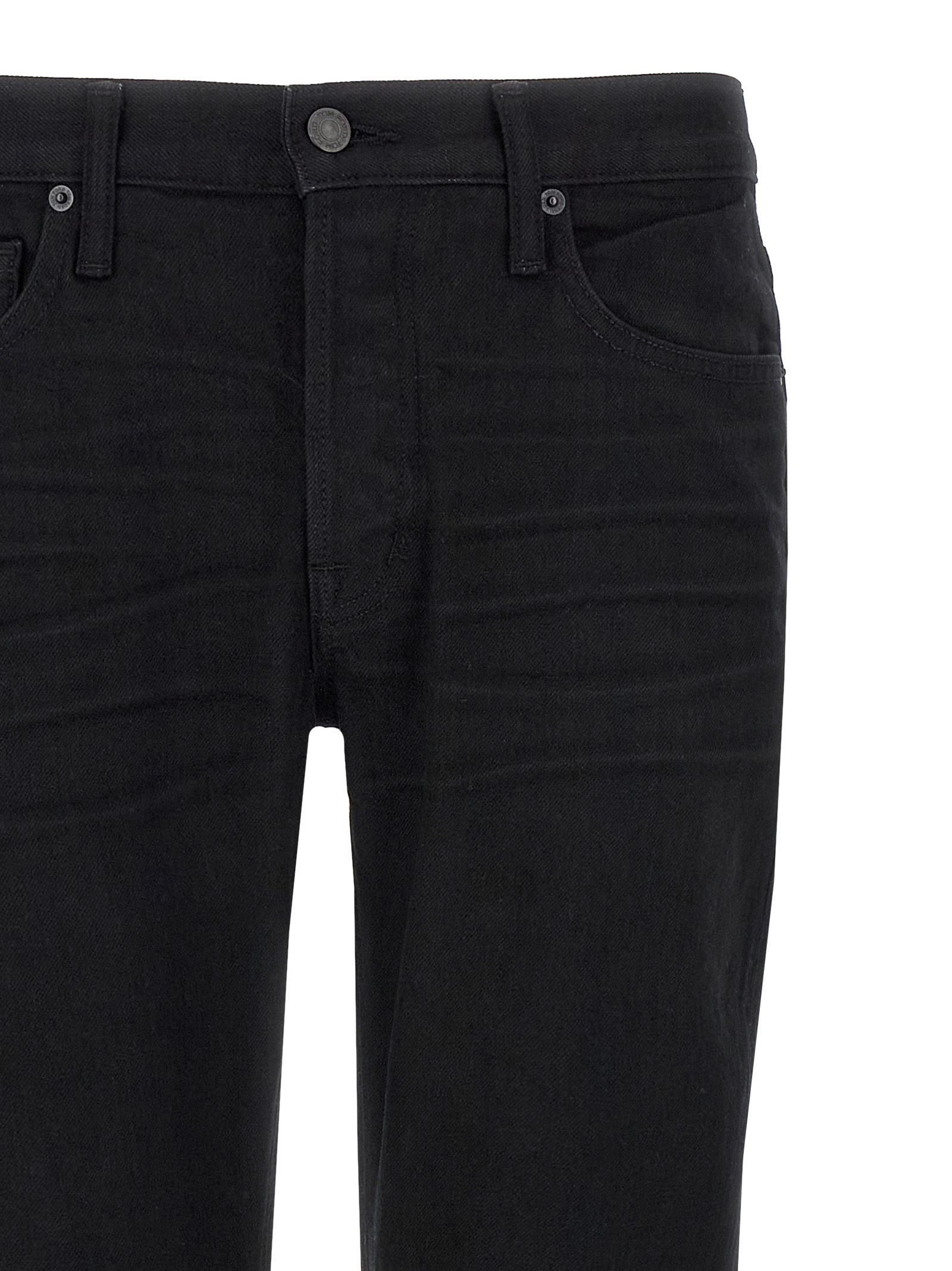 Japanese cotton denim jeans with five pockets, front button closure, straight leg, tone-on-tone back logo tag.