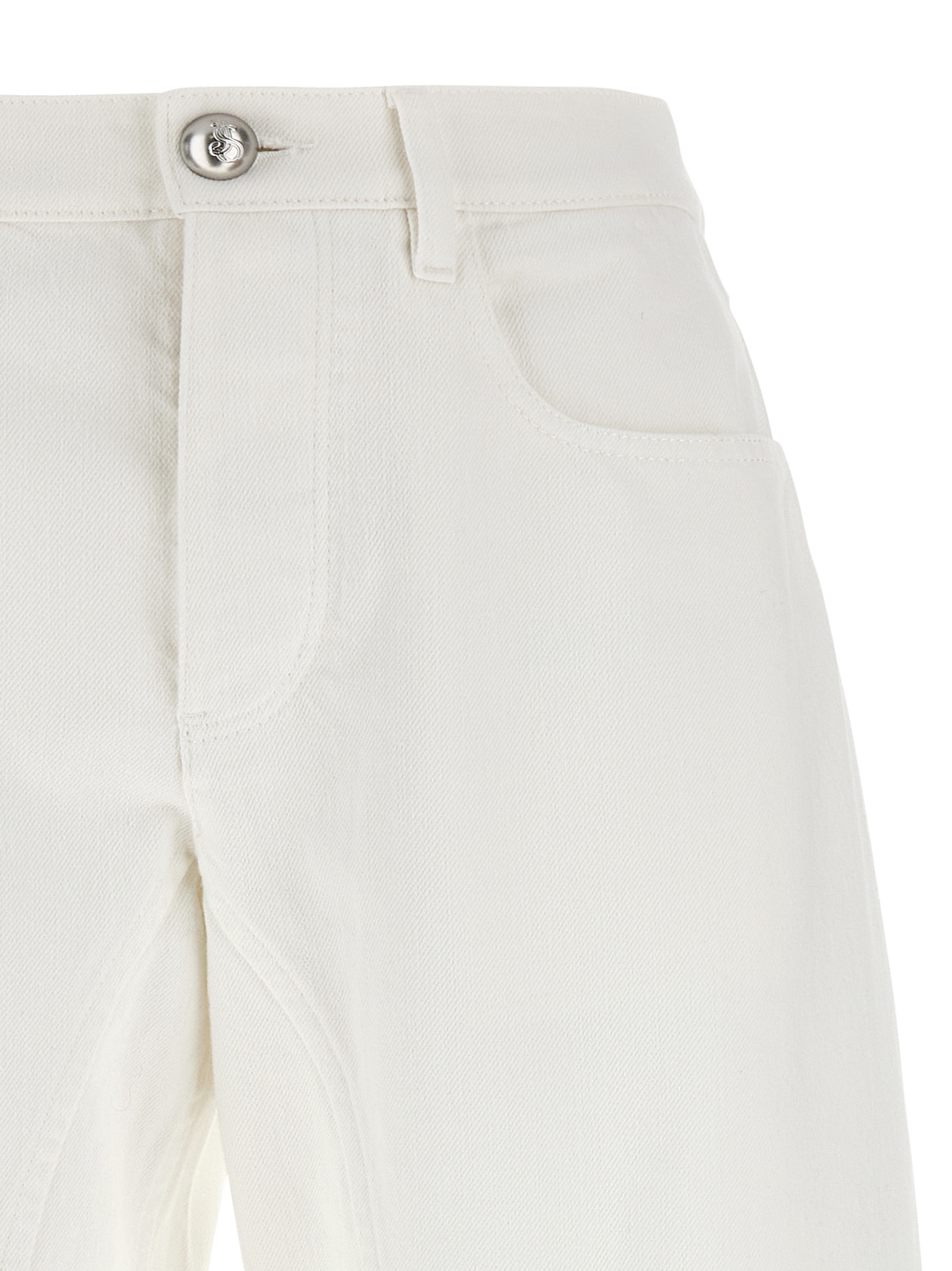 High-waisted cotton denim jeans with zip and button closure, five pockets, raw cut hem, and leather logo label at the back.