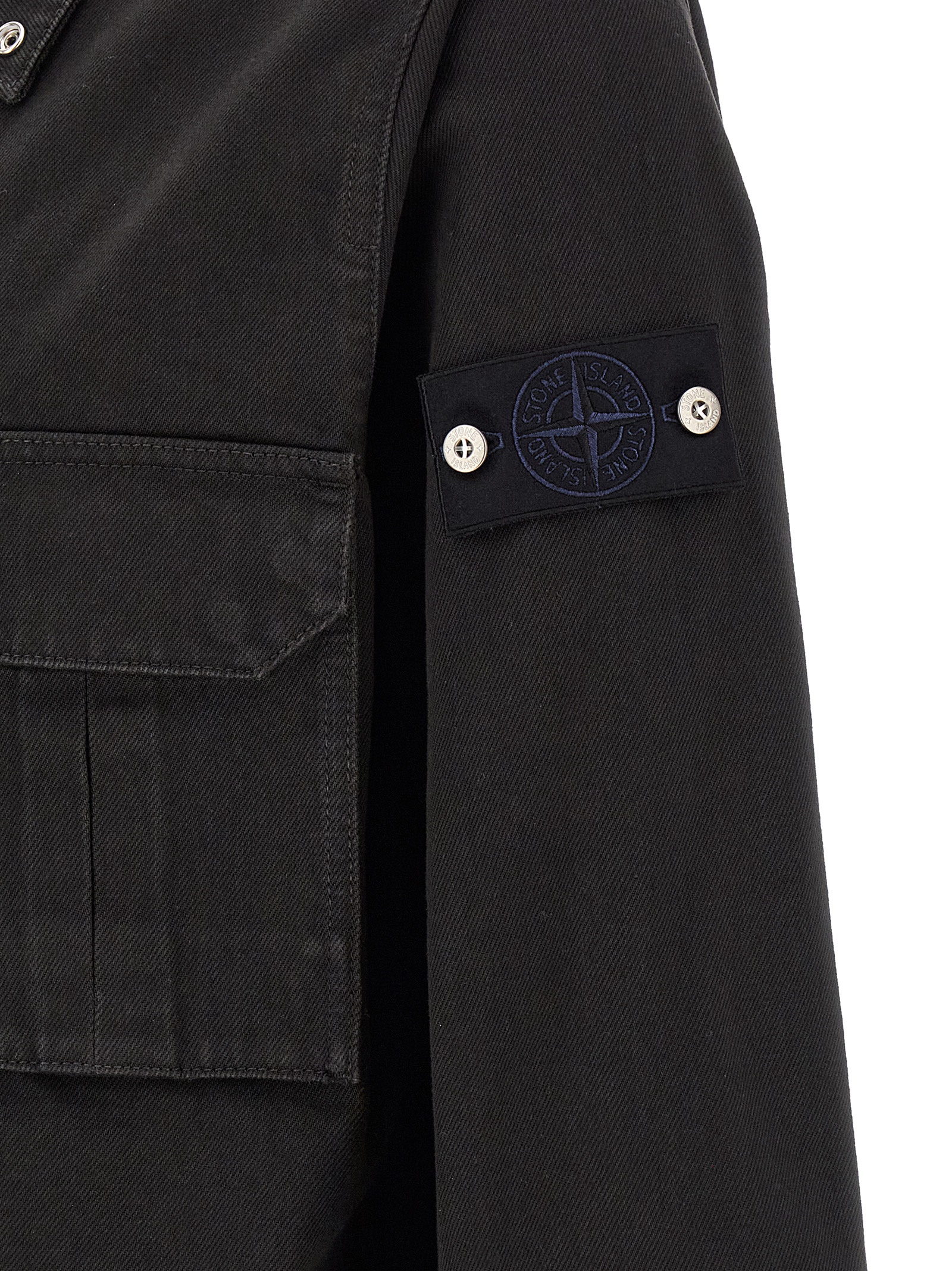 Garment-dyed cotton denim overshirt, front zip closure, breast pocket, long cuffed sleeves and a tone-on-tone logo badge appliqué.
