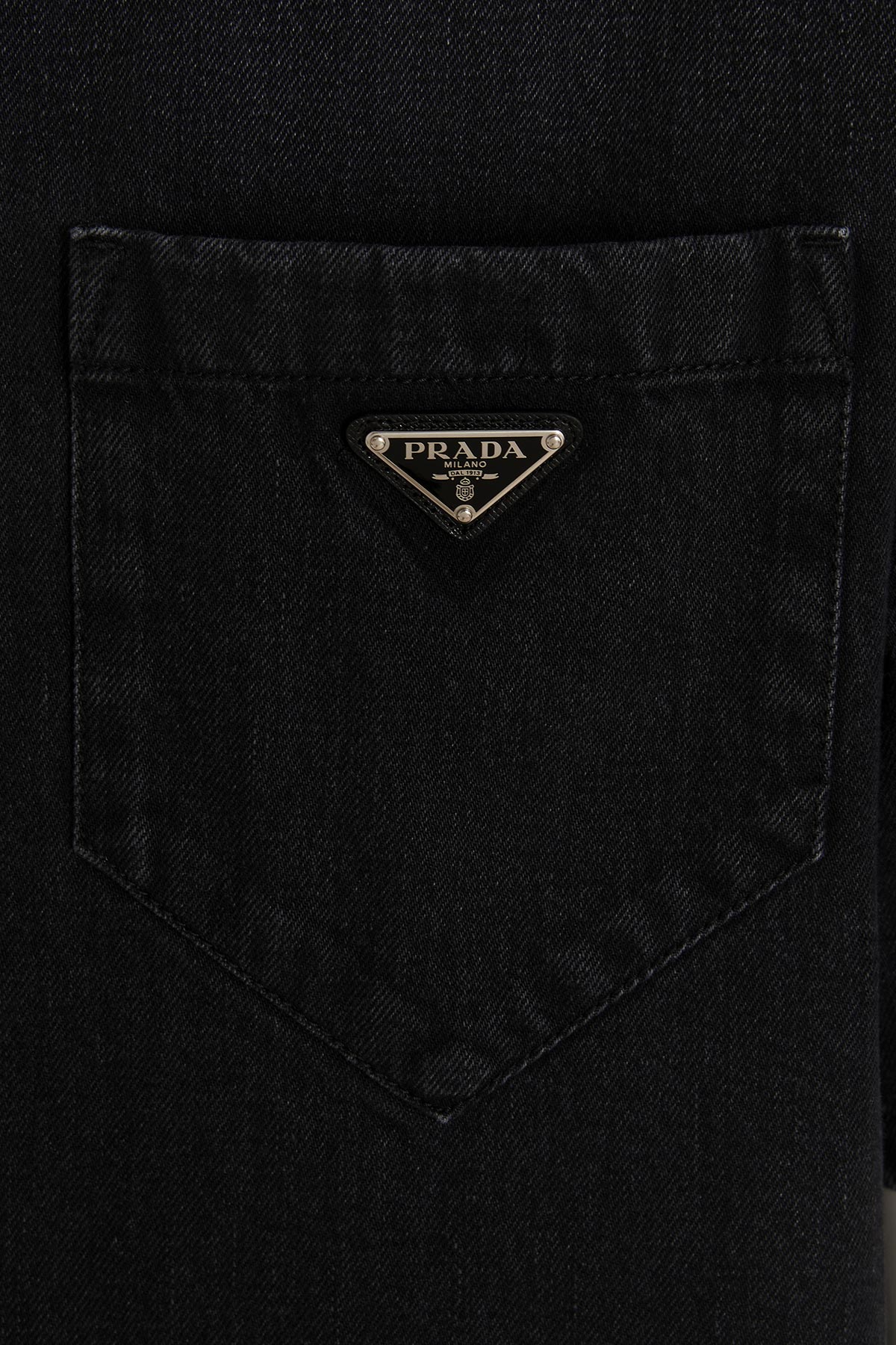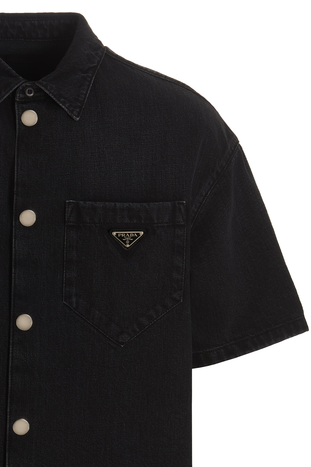 Denim shirt with short sleeves, snap buttons, chest pocket with triangle logo.