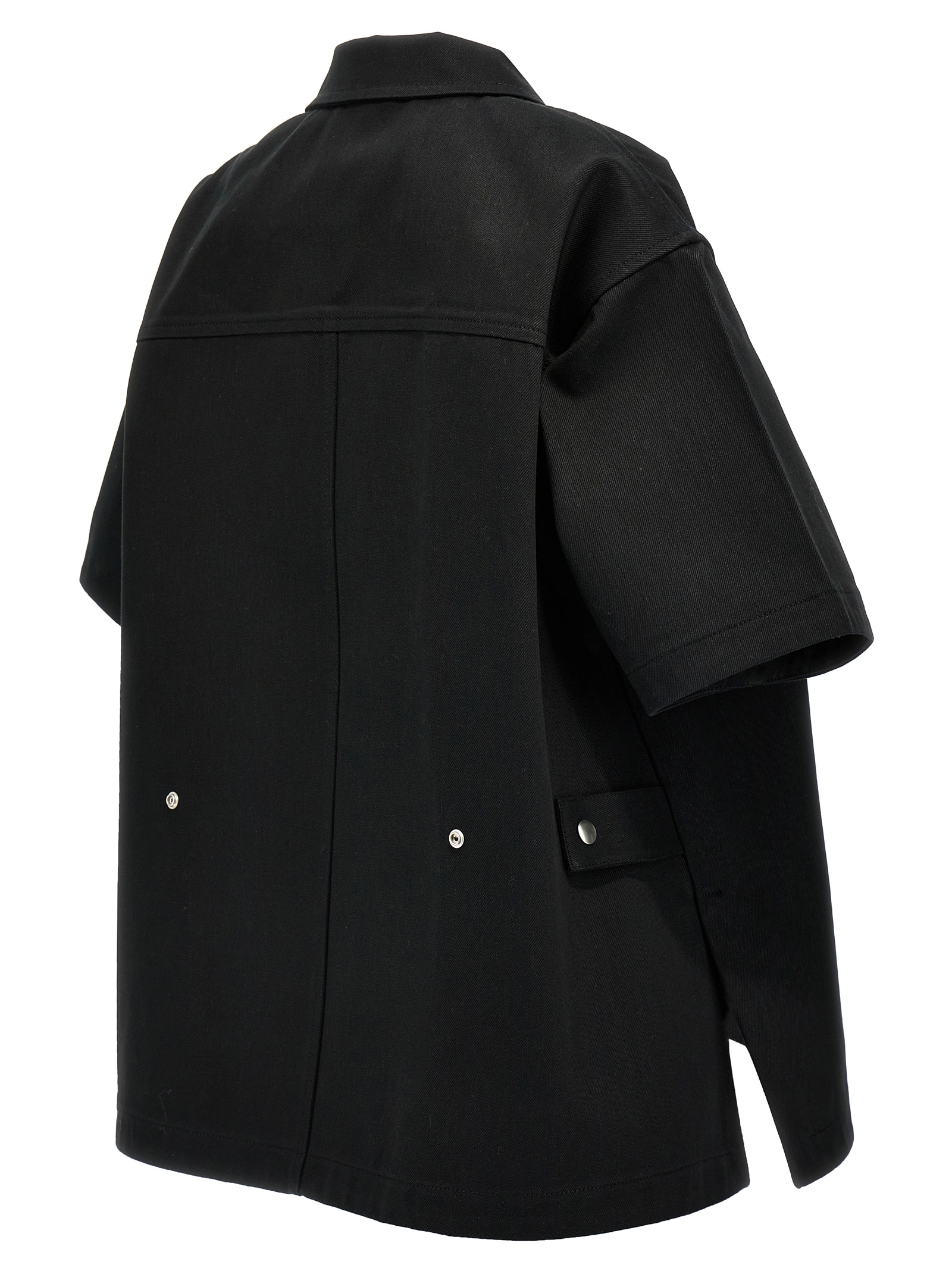 Boxy textured cotton denim shirt with short sleeves, dropped shoulders, zip closure, pockets, side slits, adjustable martingale with back snap closure.