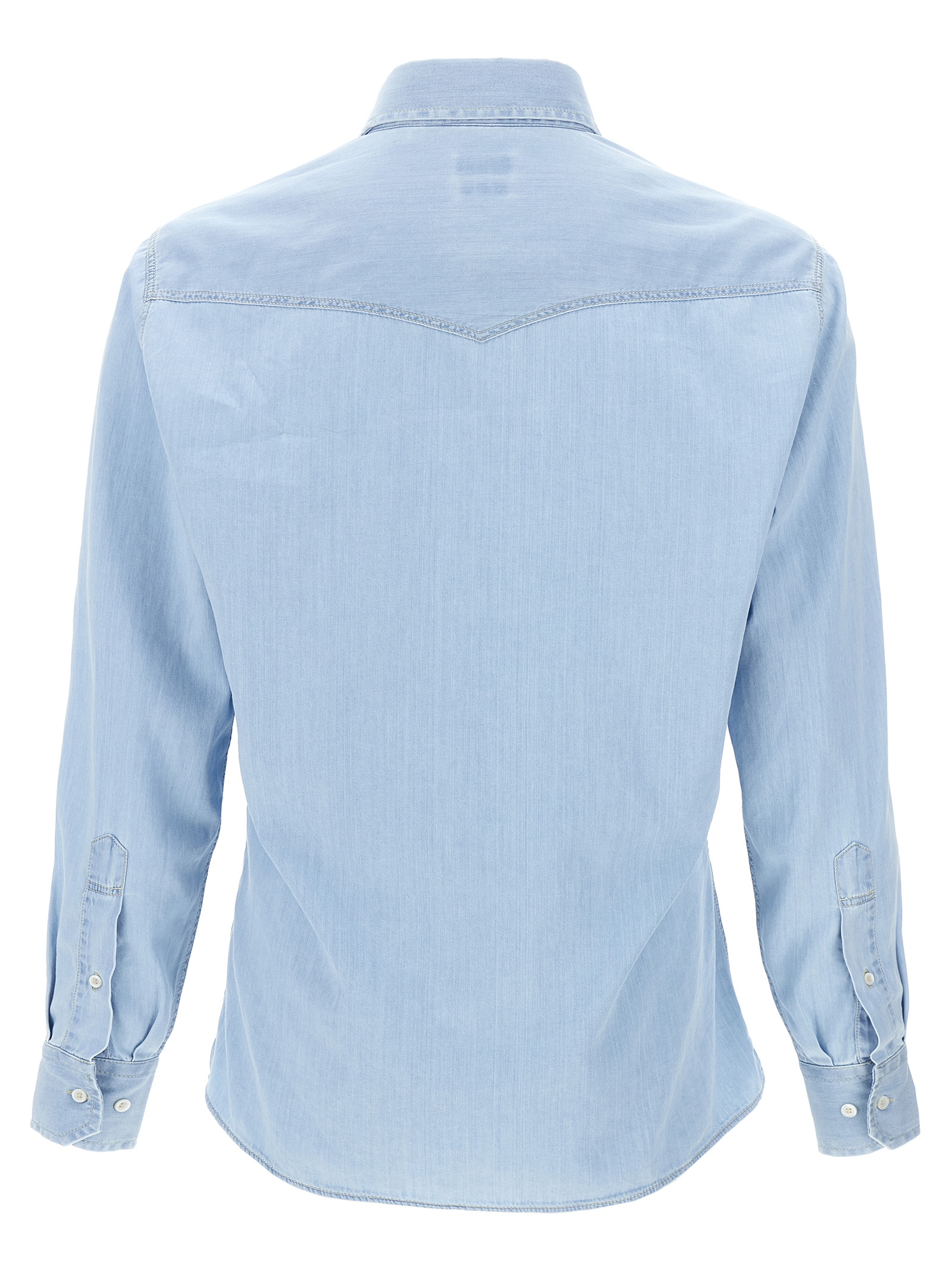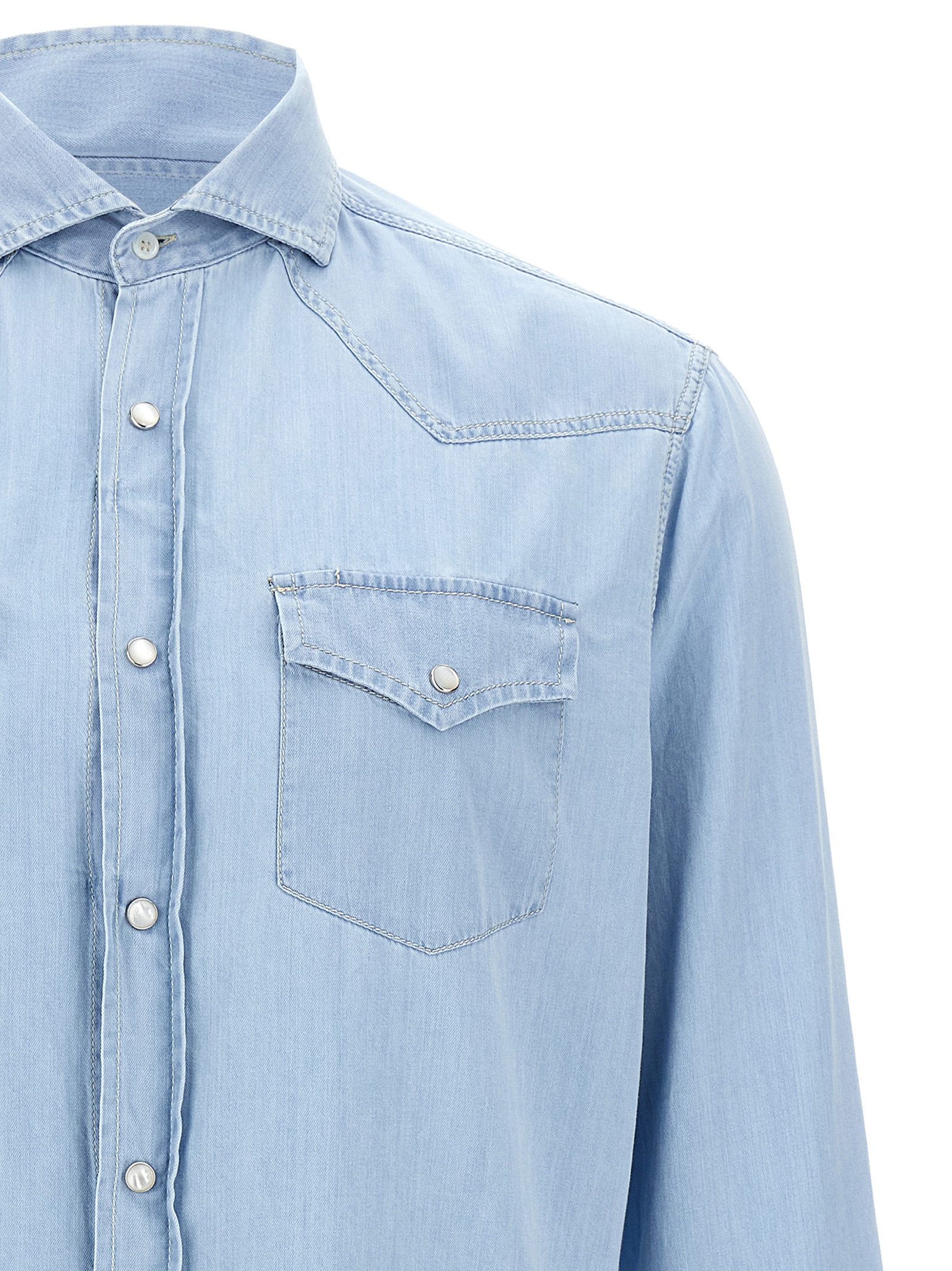 Cotton denim shirt with snap button closure, pockets, long cuffed sleeves.