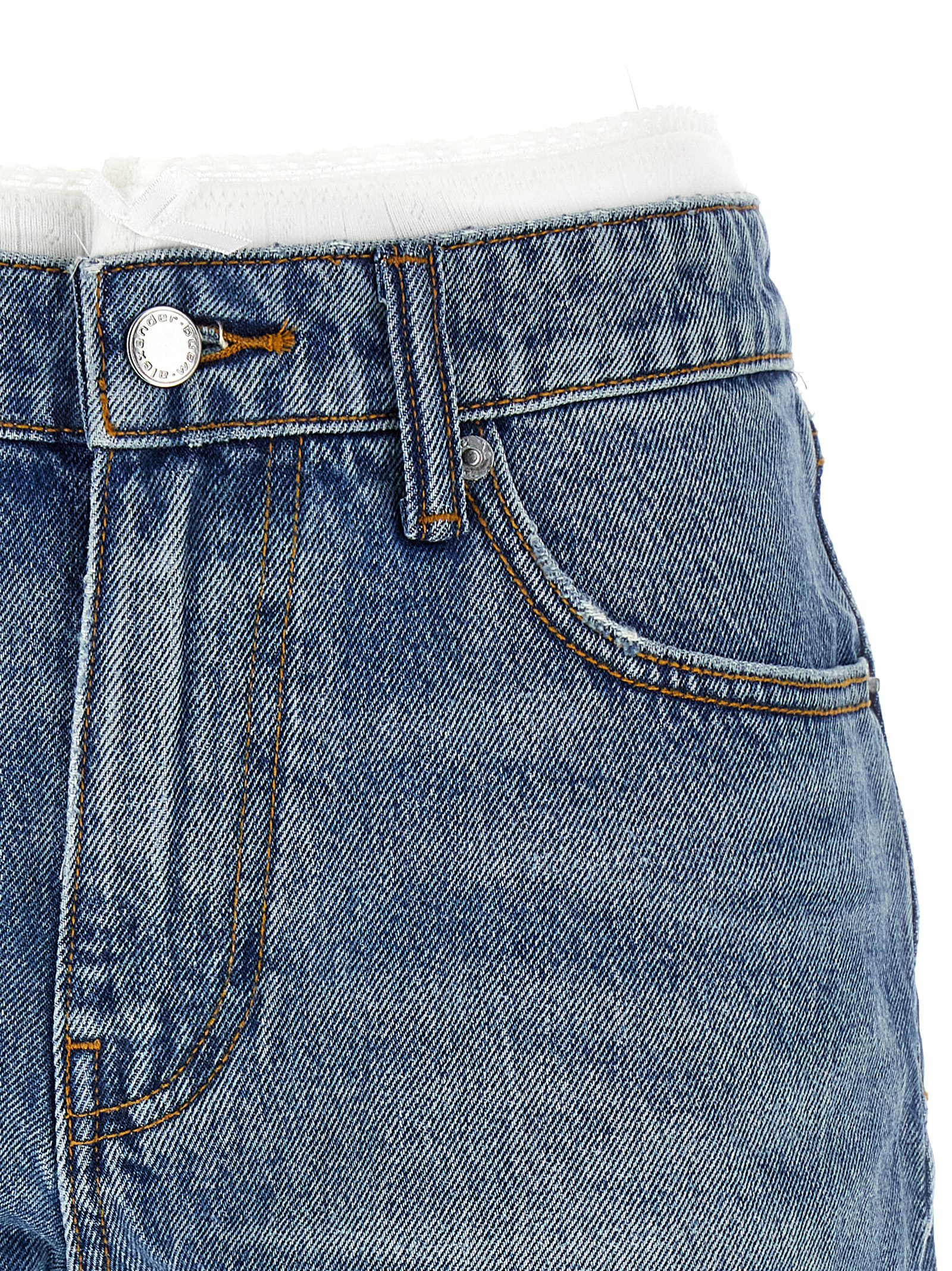 Cotton denim shorts, zip and button closure, five pockets, cotton briefs detail at the waist.
