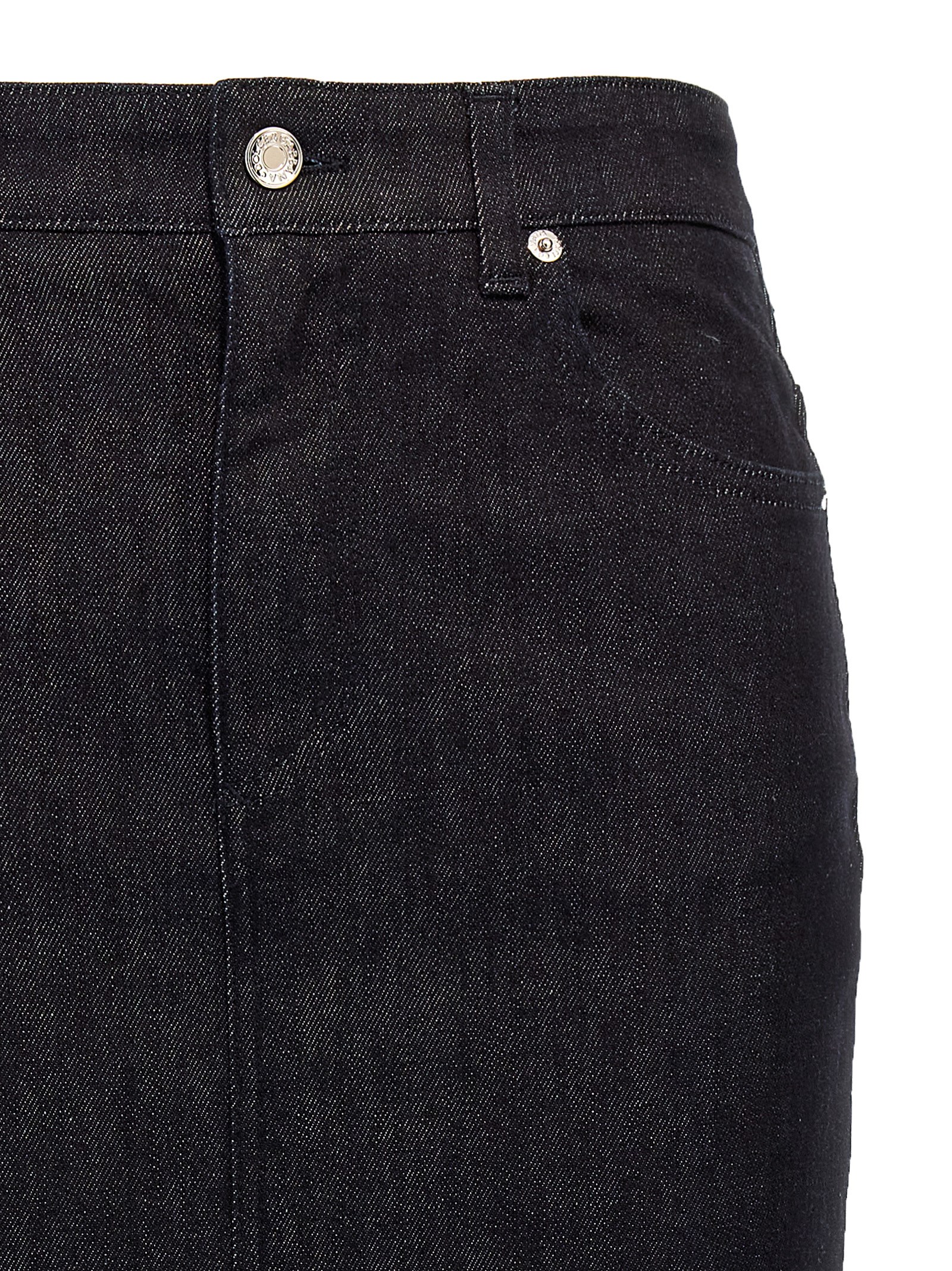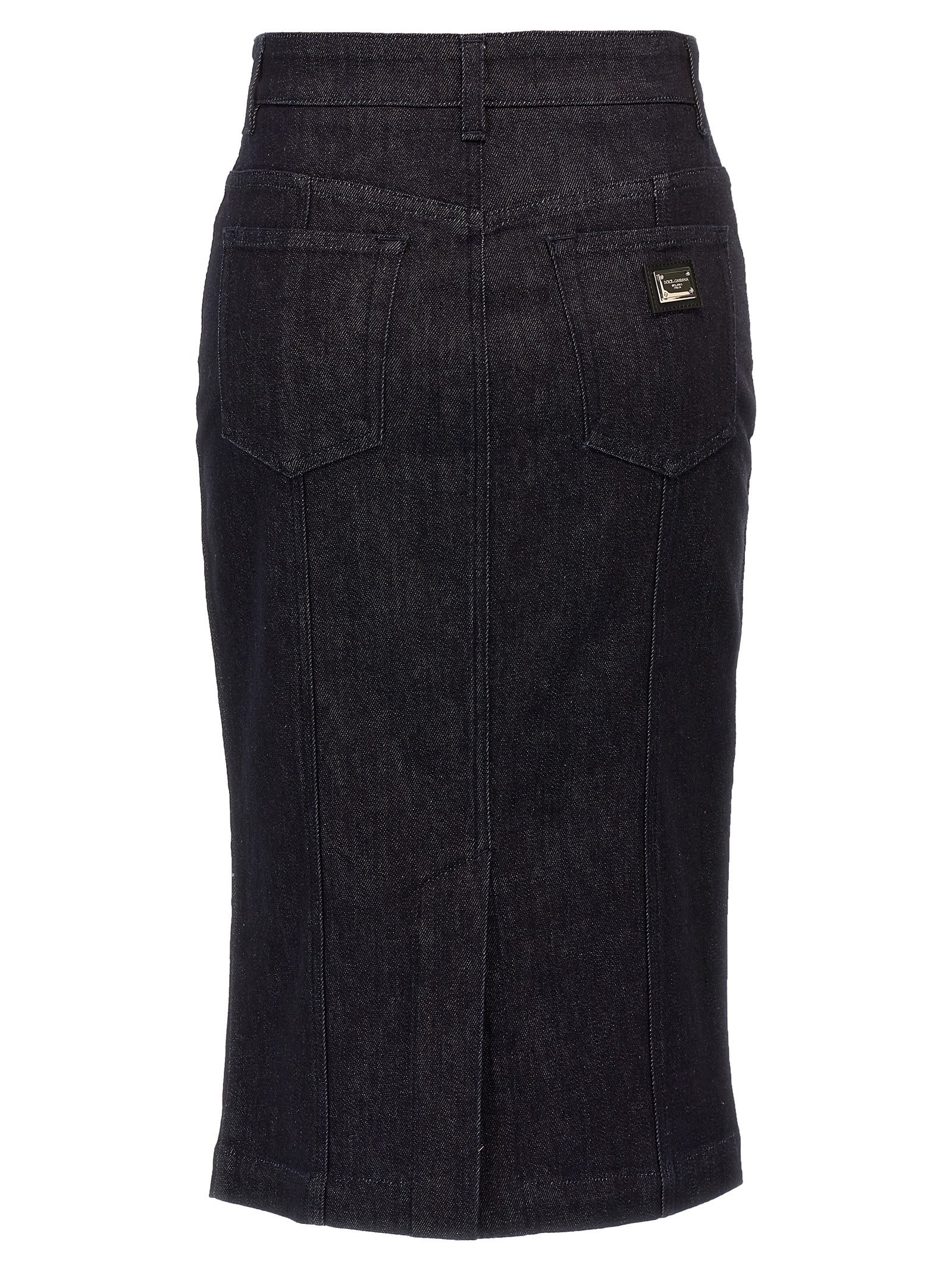 Longuette pencil skirt in cotton denim with back split, back metal logo, zip and button closure, five pockets.