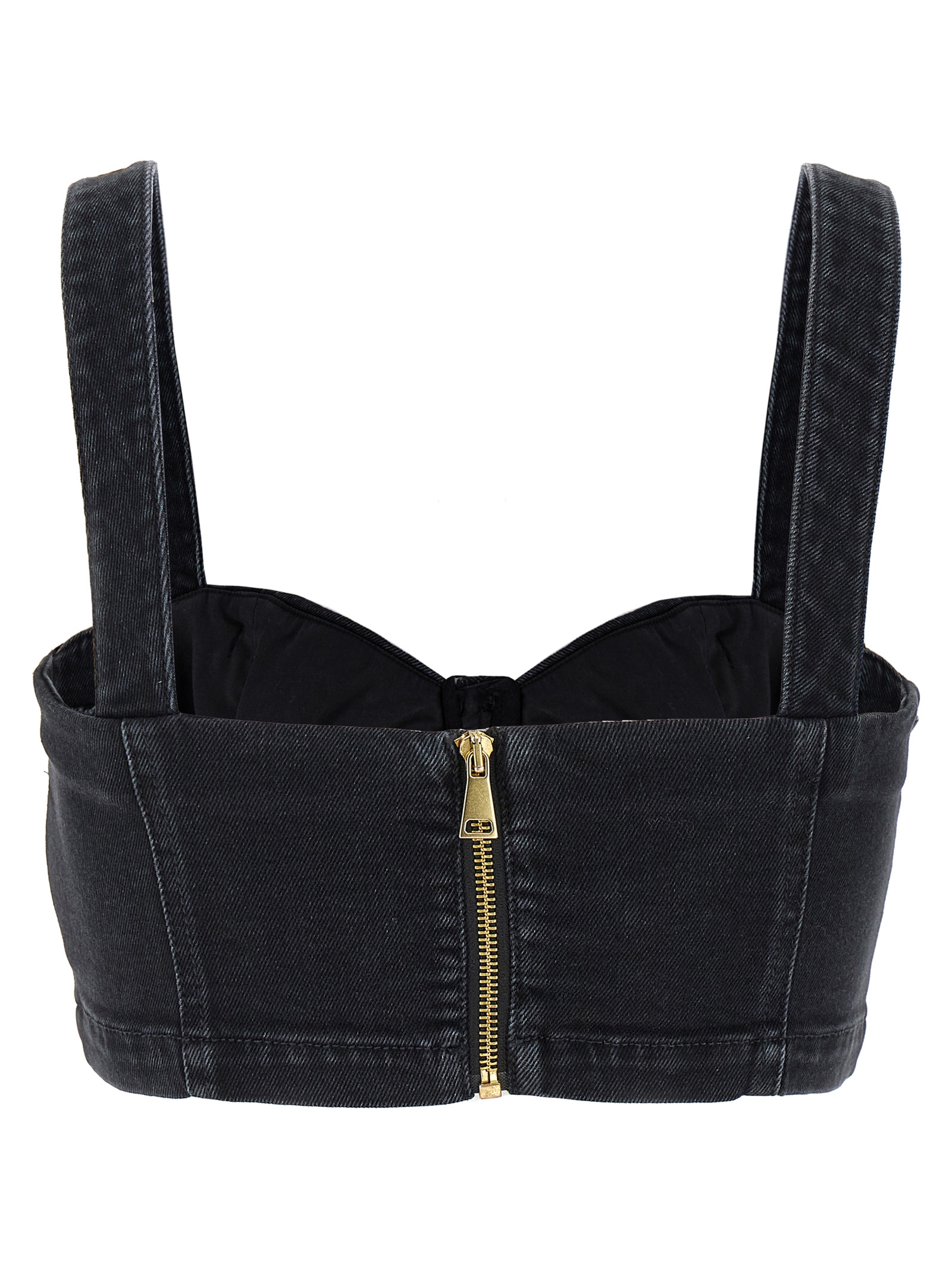 Denim top with leather straps and metal buckles, cropped model, shoulder straps.