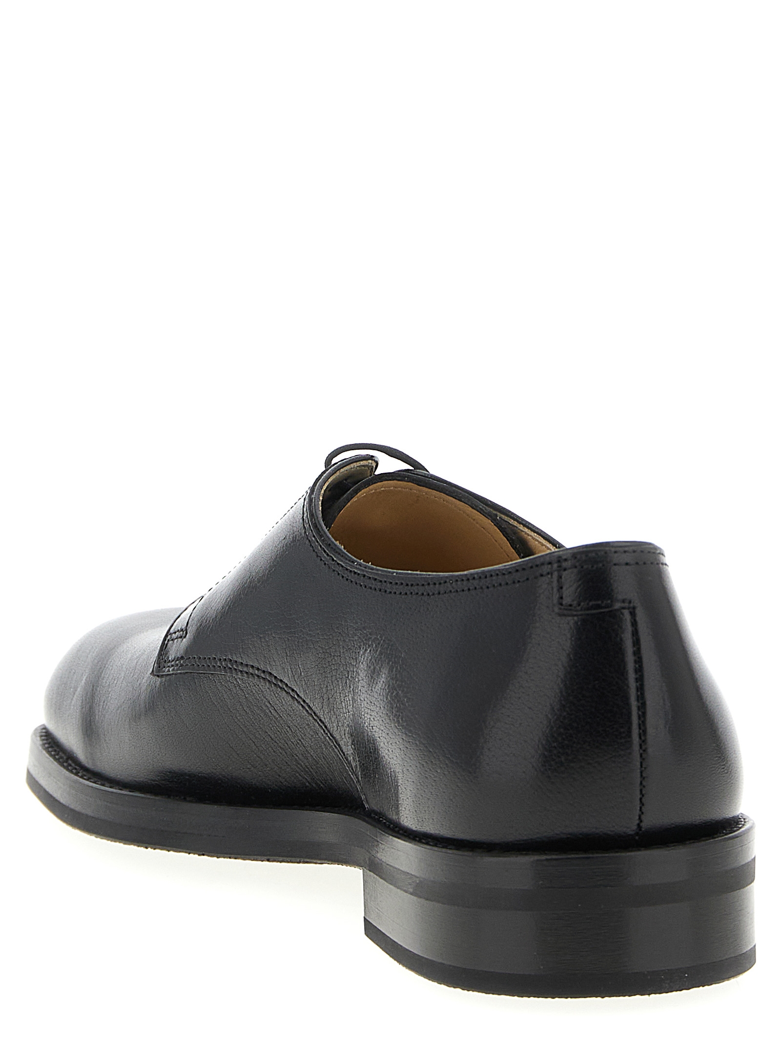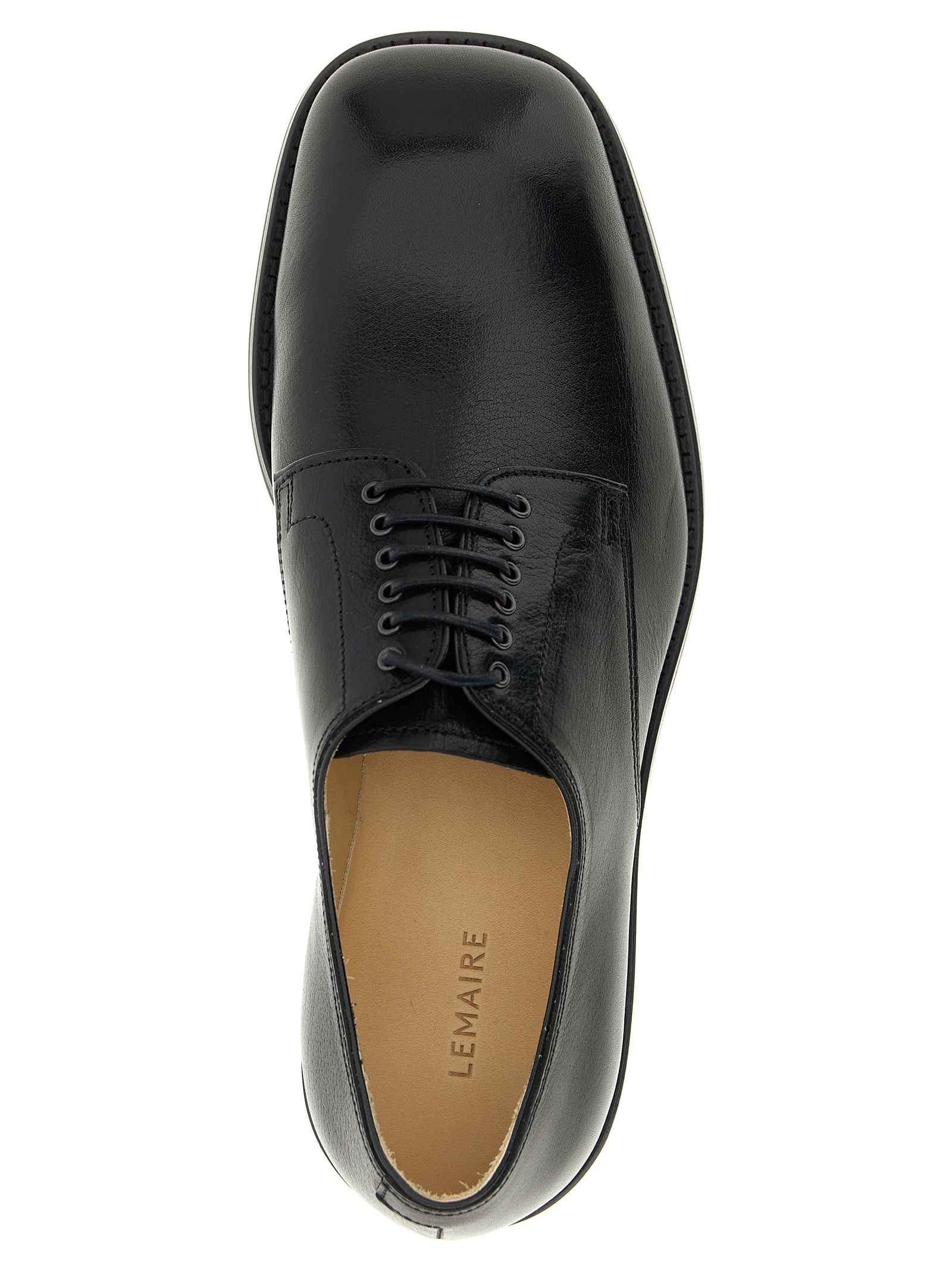 ‘Derbies’ lace-up shoes in shiny buffalo leather, derby model, elongated square toe, waxed cotton laces, leather sole.