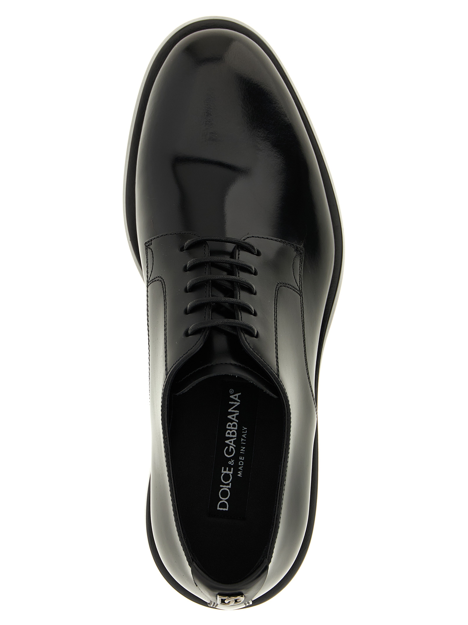 Derby style lace-up shoes in brushed calf leather with laces, back metal logo, leather sole and TPU hem.