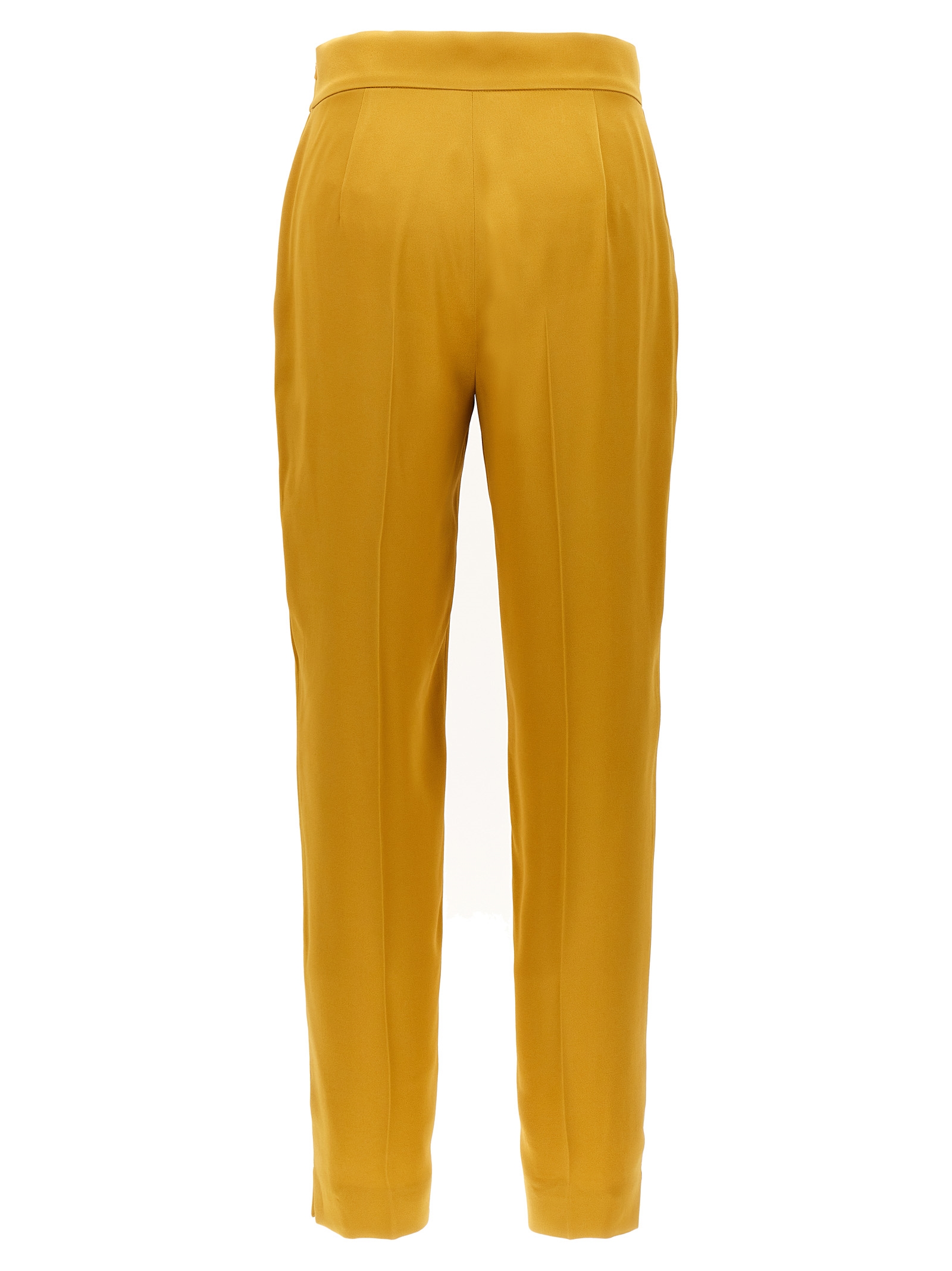 Cigarette-style Deserto pants in enver satin fabric with slant pockets, small splits at the bottom, monkstrap closure at the waist, and zipper and hook flap.
