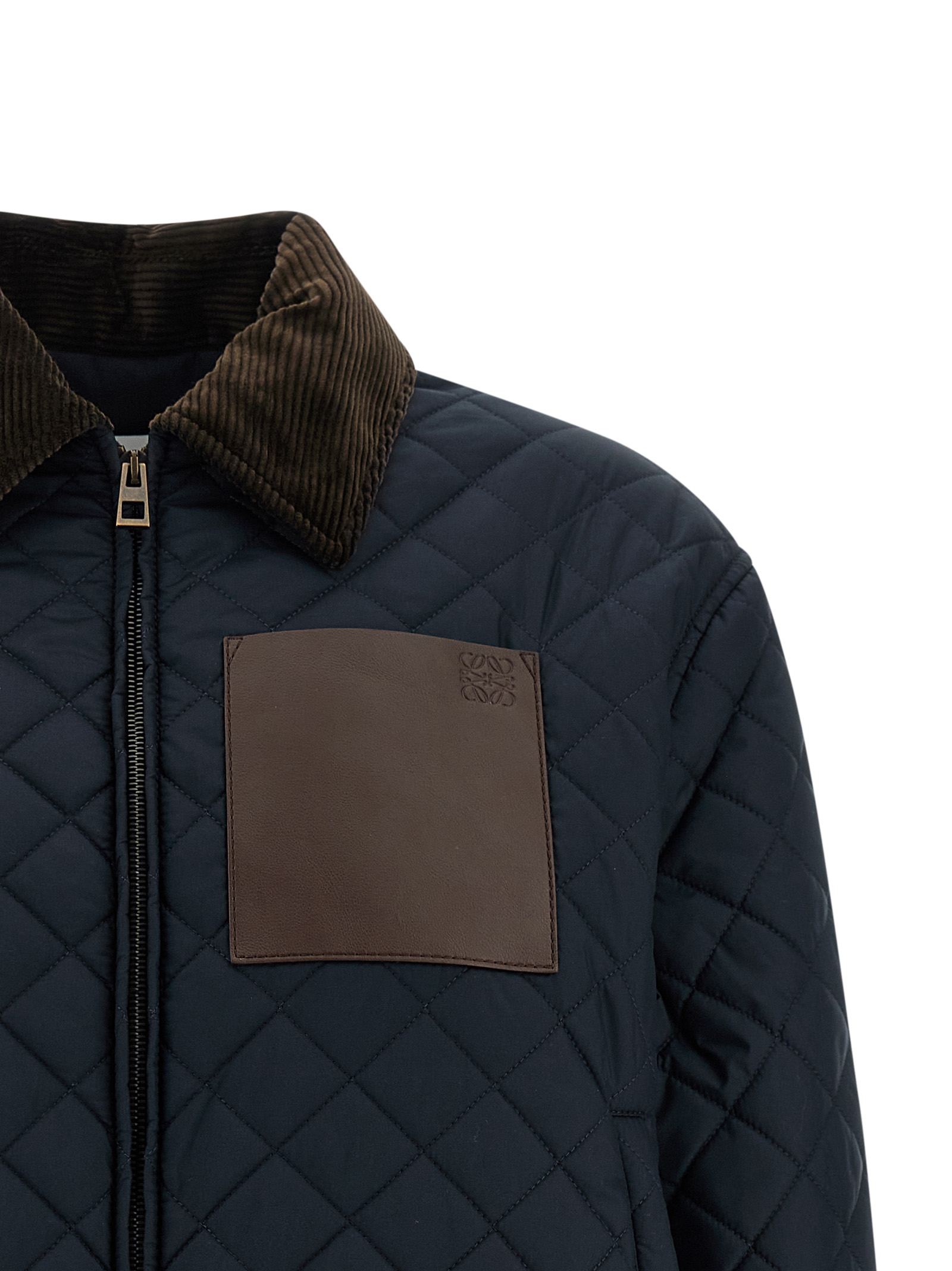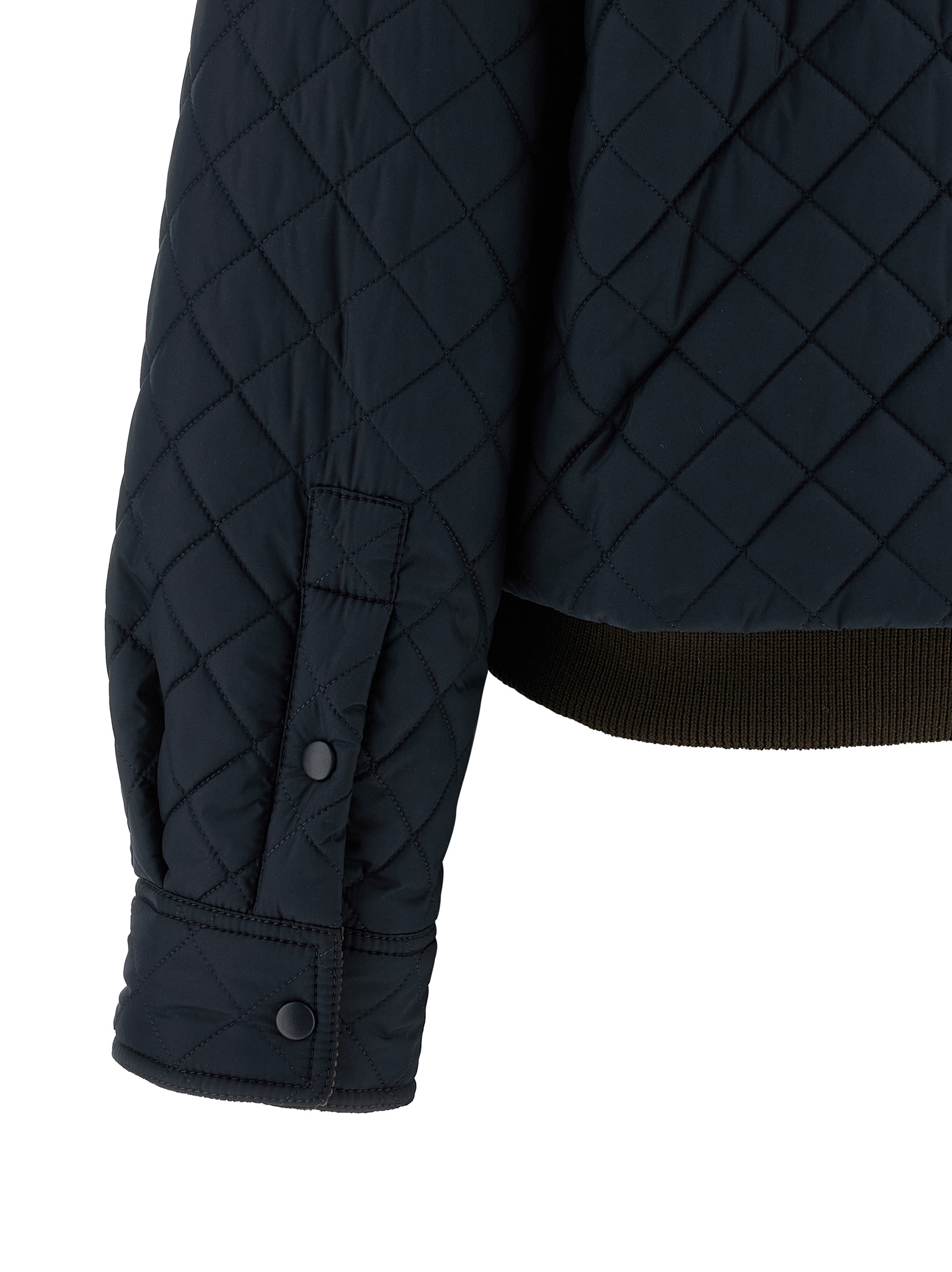 Lightweight tech fabric jacket with all-over diamond quilting, contrast corduroy collar and inner cuffs, slightly cropped style, contrast leather pocket with embossed ‘Anagram’ pattern, front zip closure, pockets, long sleeves with cuffs and dropped shoulder, double layer hem with contrasting ribbed stretch knit insert.