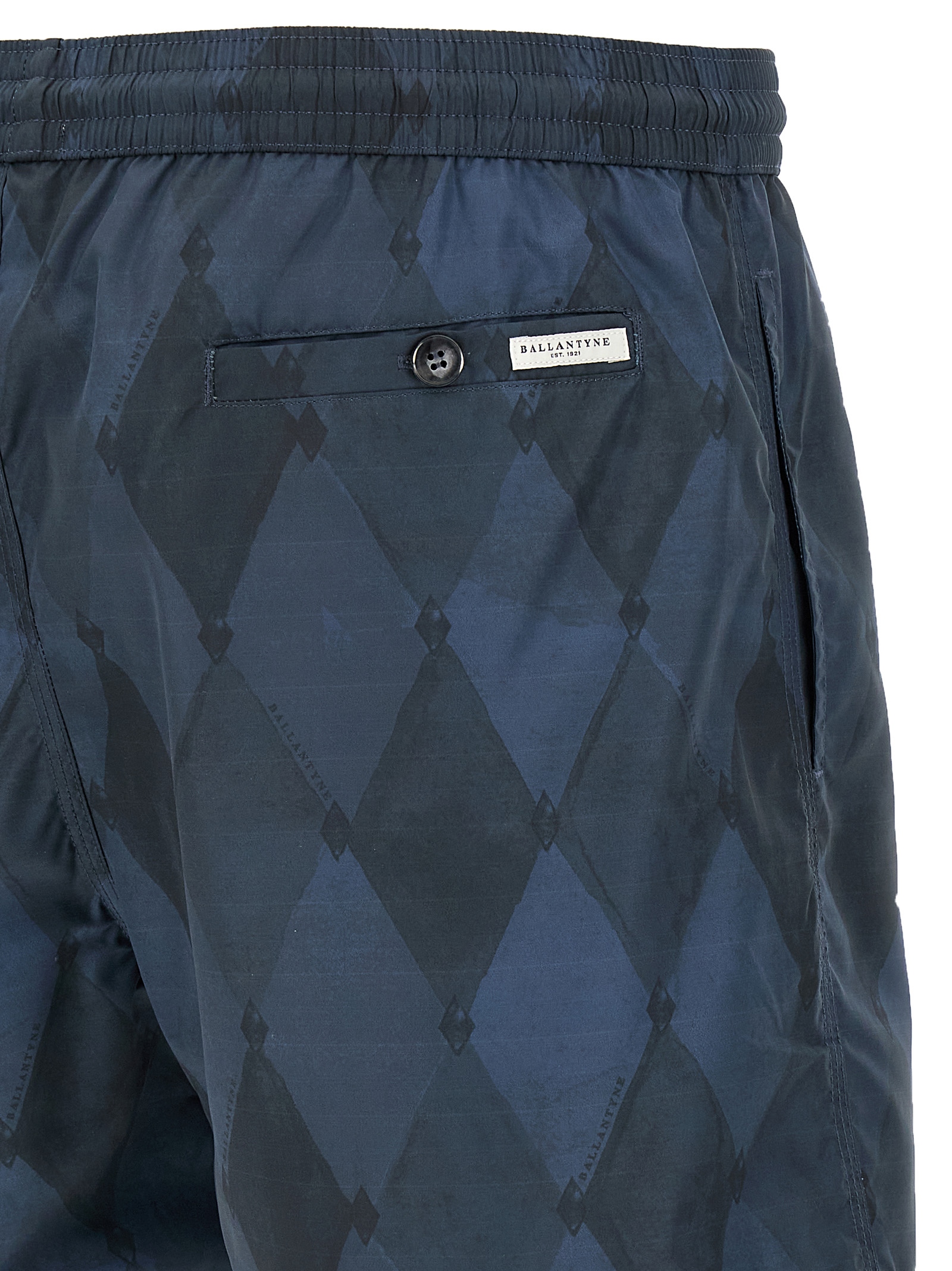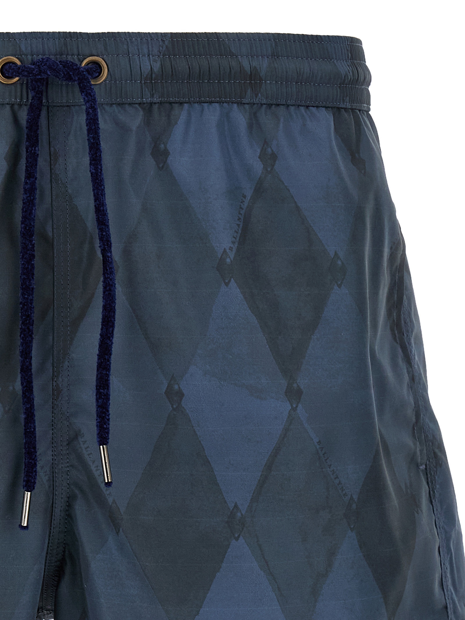 Nylon swimsuit with tone-on-tone ‘Diamond’ print, chenille drawstring elastic, inner briefs.