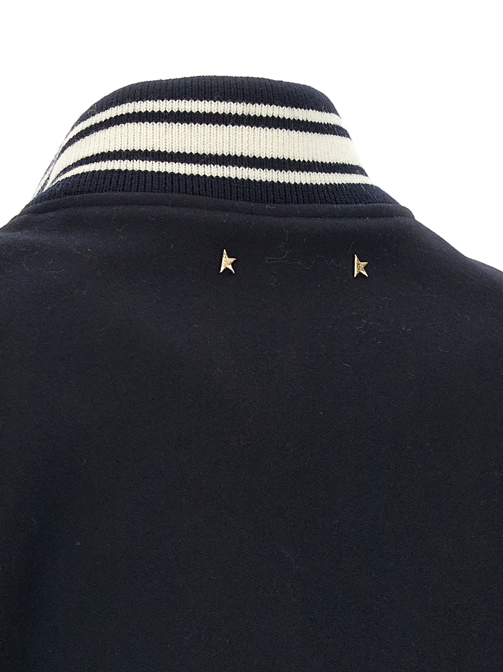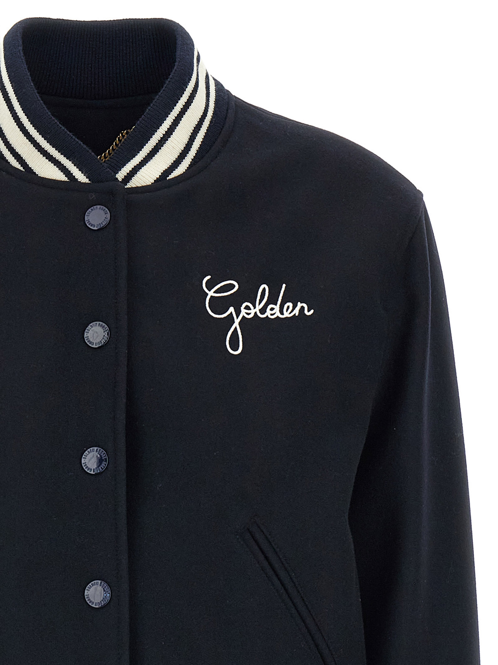 Dirce’ virgin wool blend bomber jacket with ribbed knit details, logo embroidery and front snap button closure, pockets, long cuffed sleeves and logo patch on the left sleeve, band on the hem, back metal logo, lining.