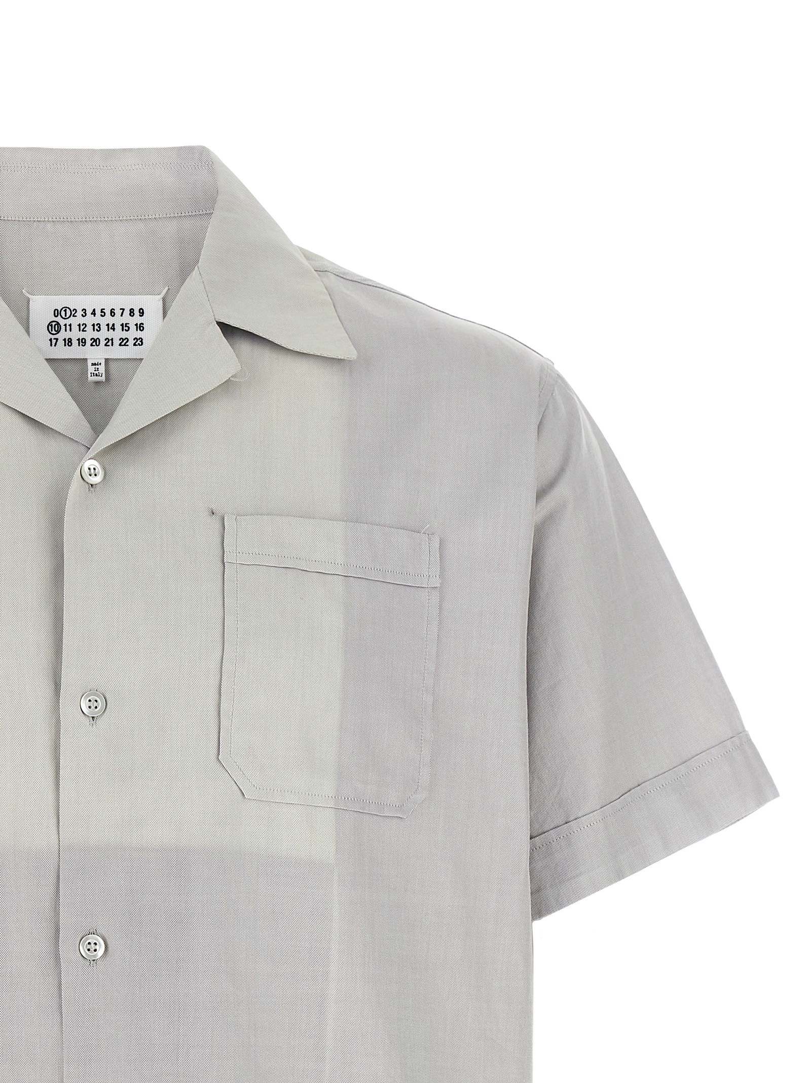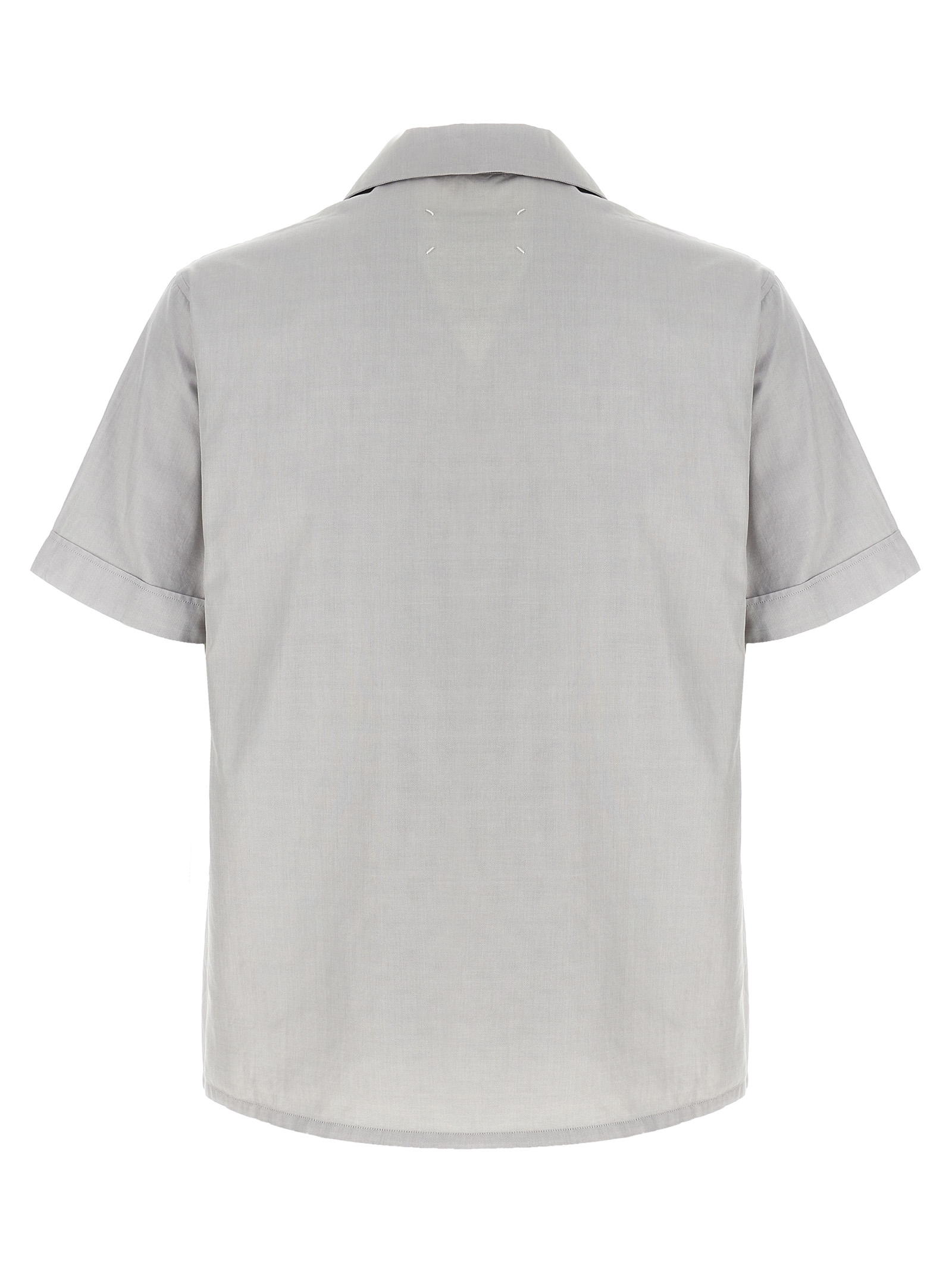 Oxford cotton shirt with discolored front, bowling collar, breast pocket, front mother-of-pearl button closure, short cuffed sleeves, ‘Four Stitches’ at the back.