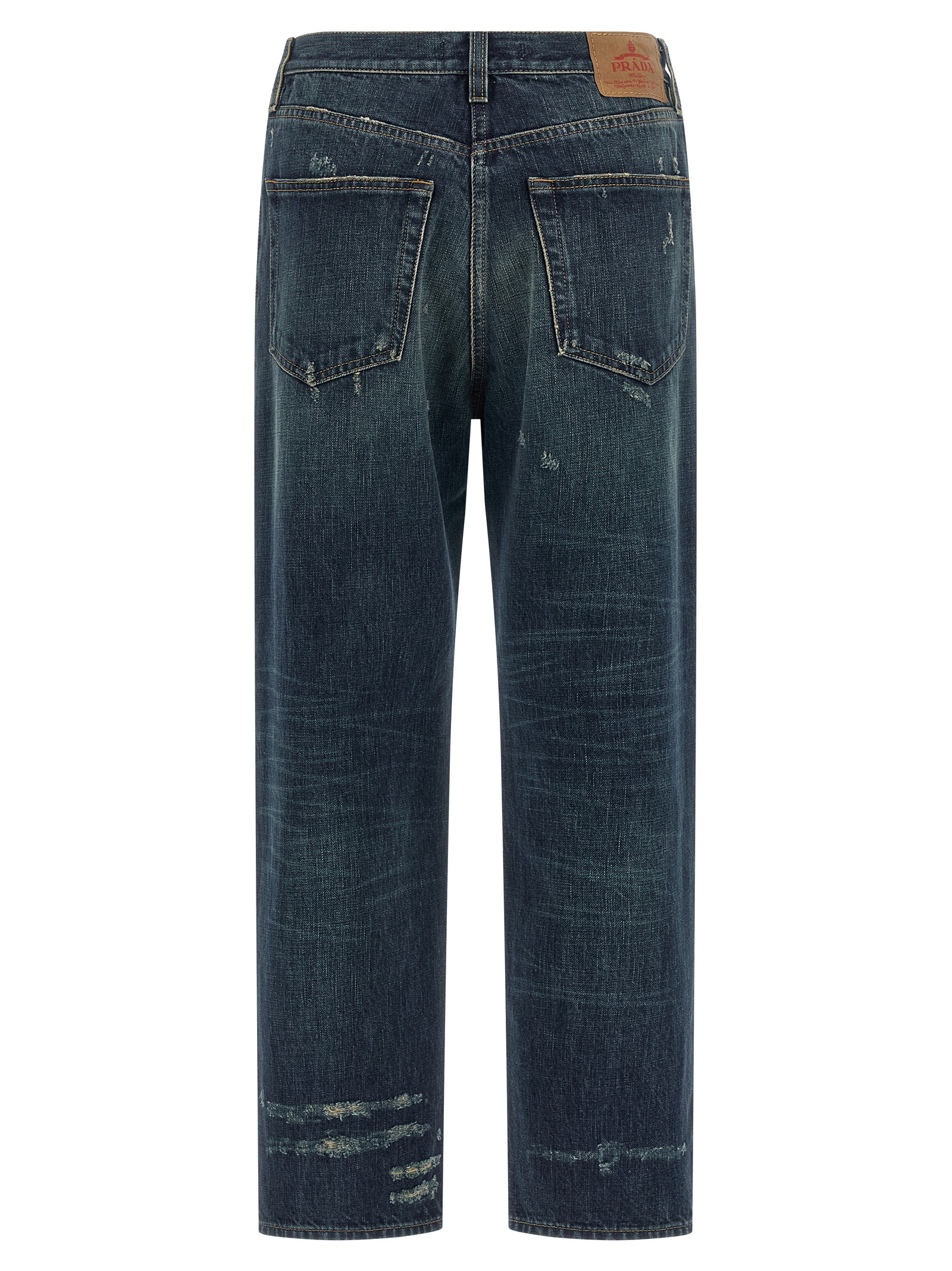 Stonewashed cotton denim jeans with used and distressed effect, contrast stitching, straight leg, front button closure, five pockets, back logo tag.