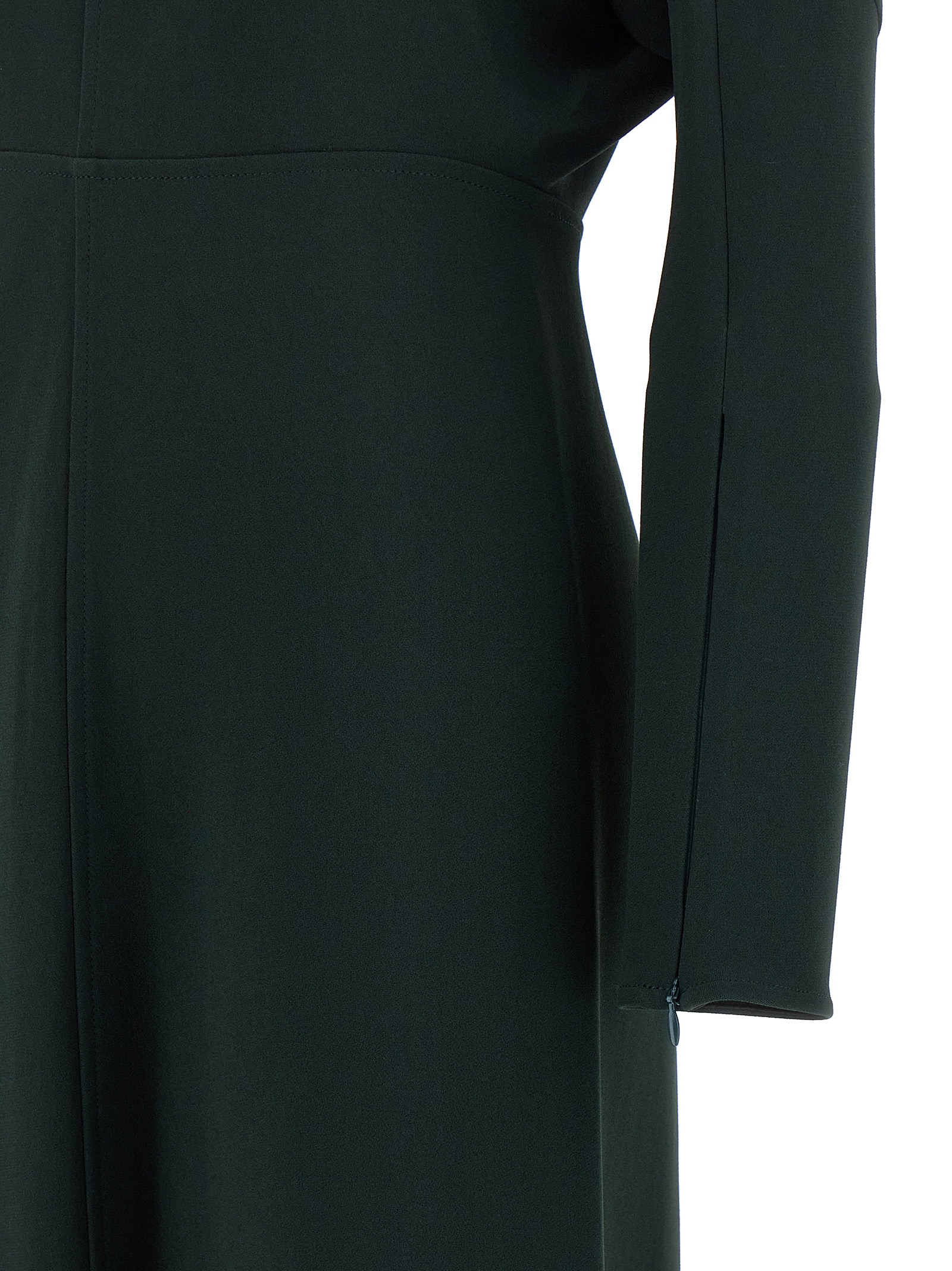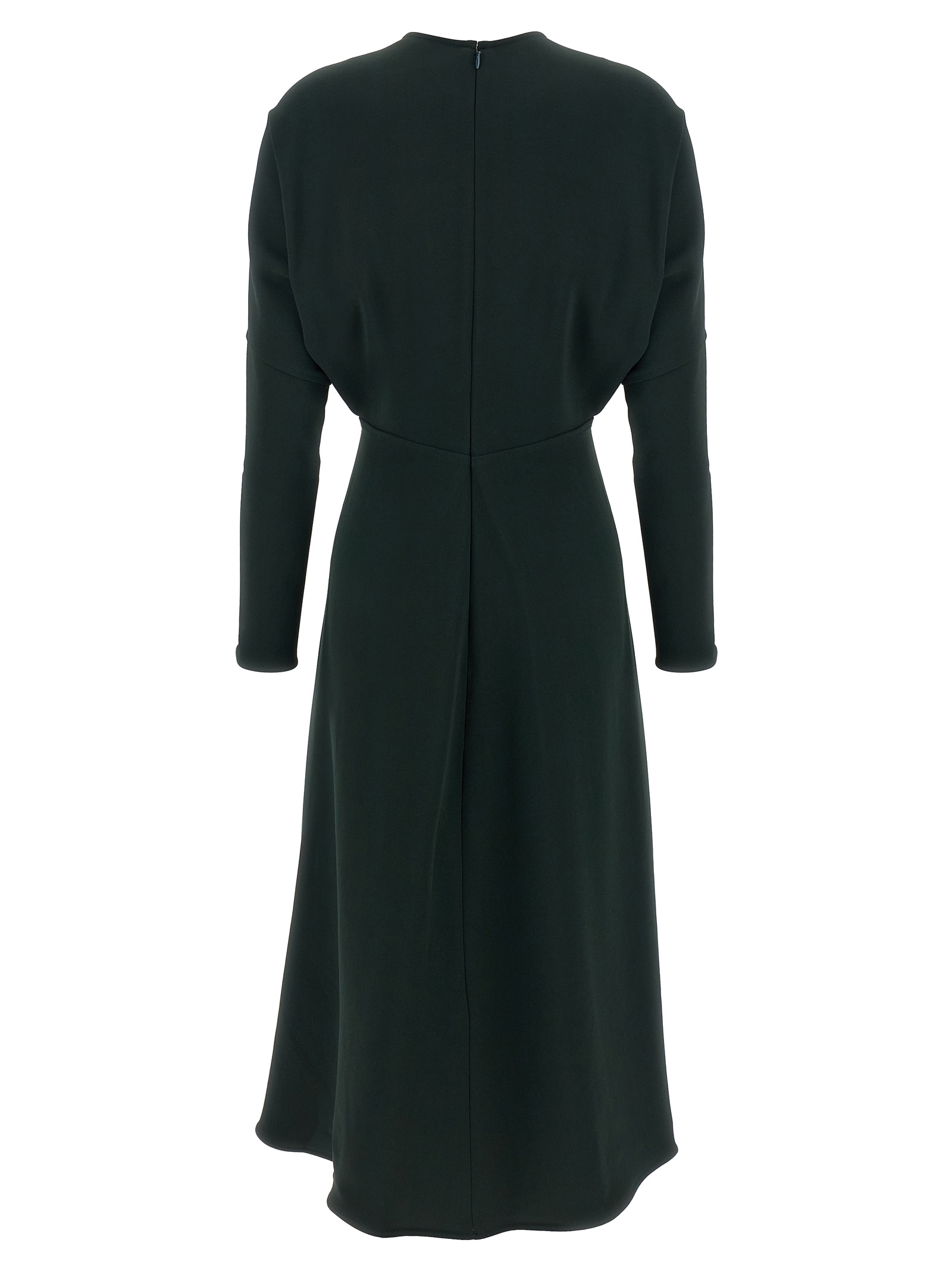 ‘Dolman Midi’ cady dress, crew neck, long bat sleeves with zip on the cuffs, back zip closure, flared skirt.