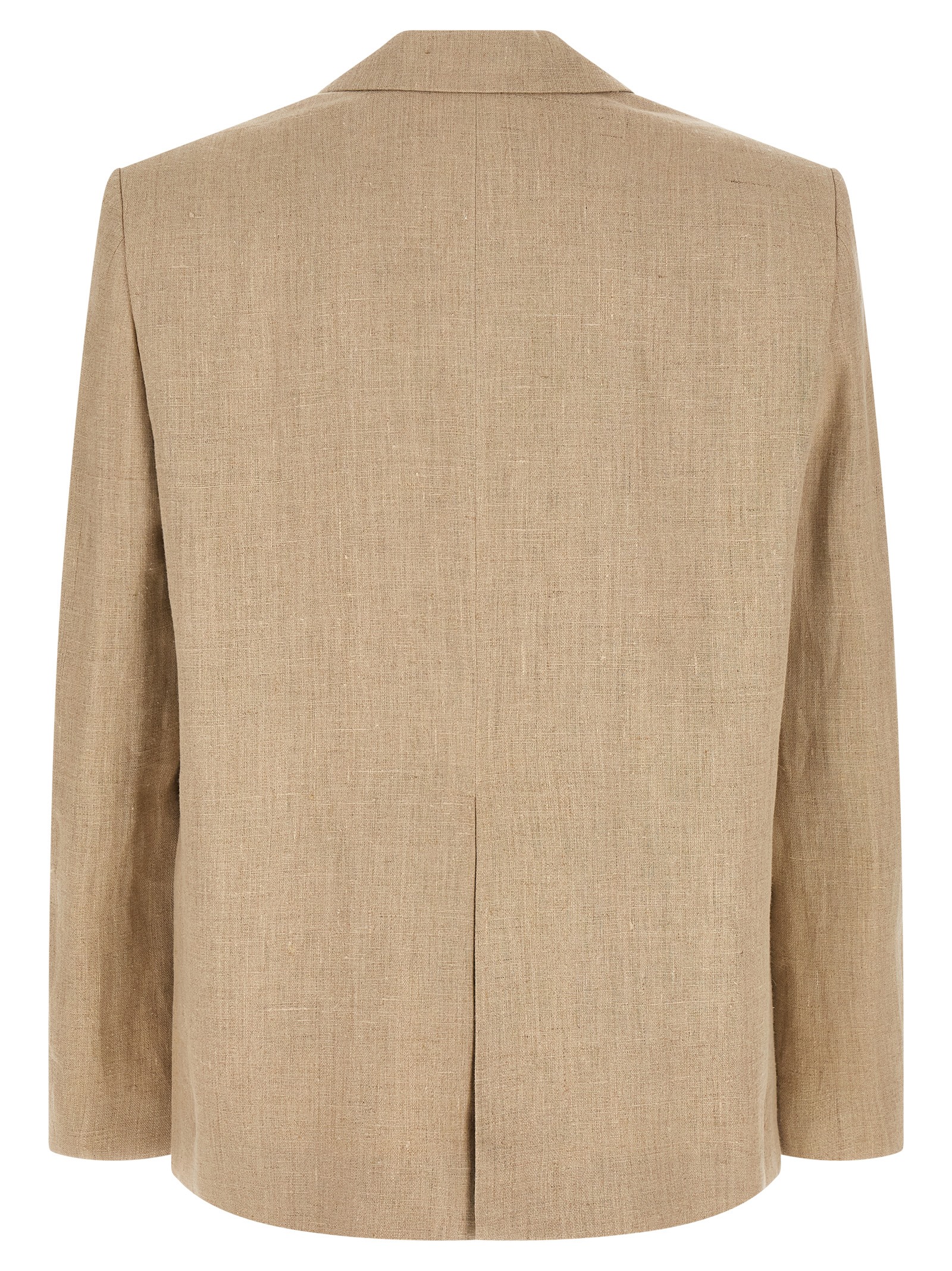 ‘Donovan’ double-breasted blazer in sturdy linen fabric with front horn button closure, mirror lapels, patch pockets, padded shoulders, long sleeves, back split, viscose lining, one inner pocket.