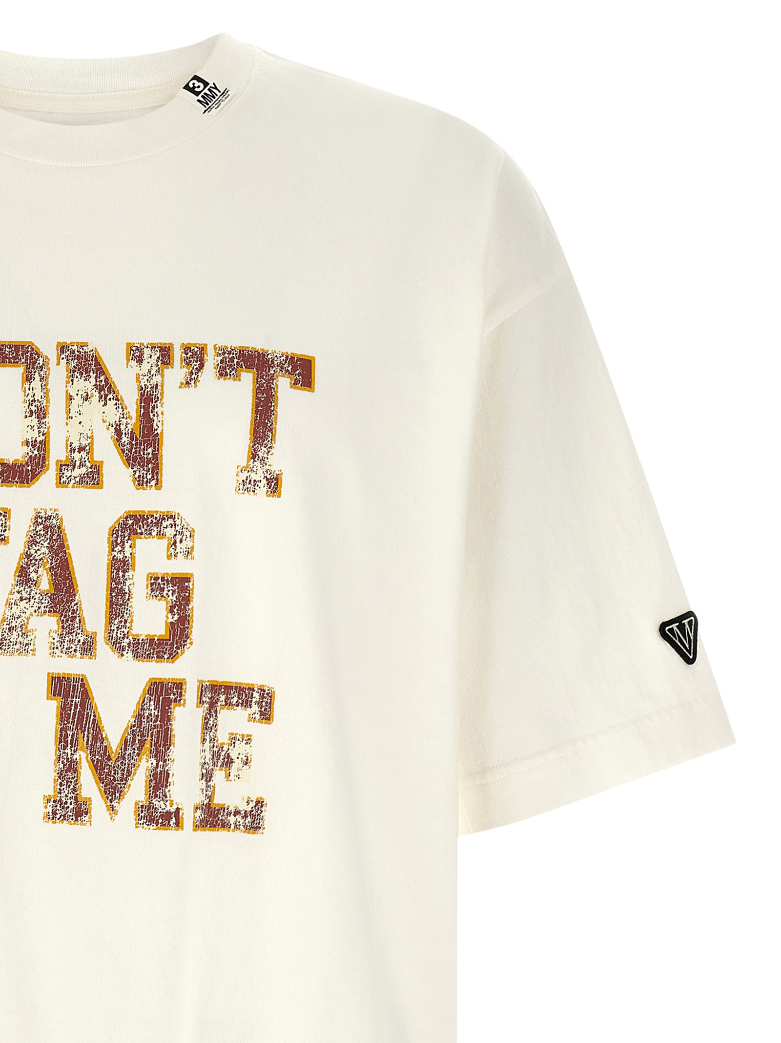 ‘Don’t Tag Me’ flamed heavy cotton t-shirt with front and back print, front logo patch, crew neck, short sleeves with dropped shoulders and logo patch, side slits, asymmetrical hem.
