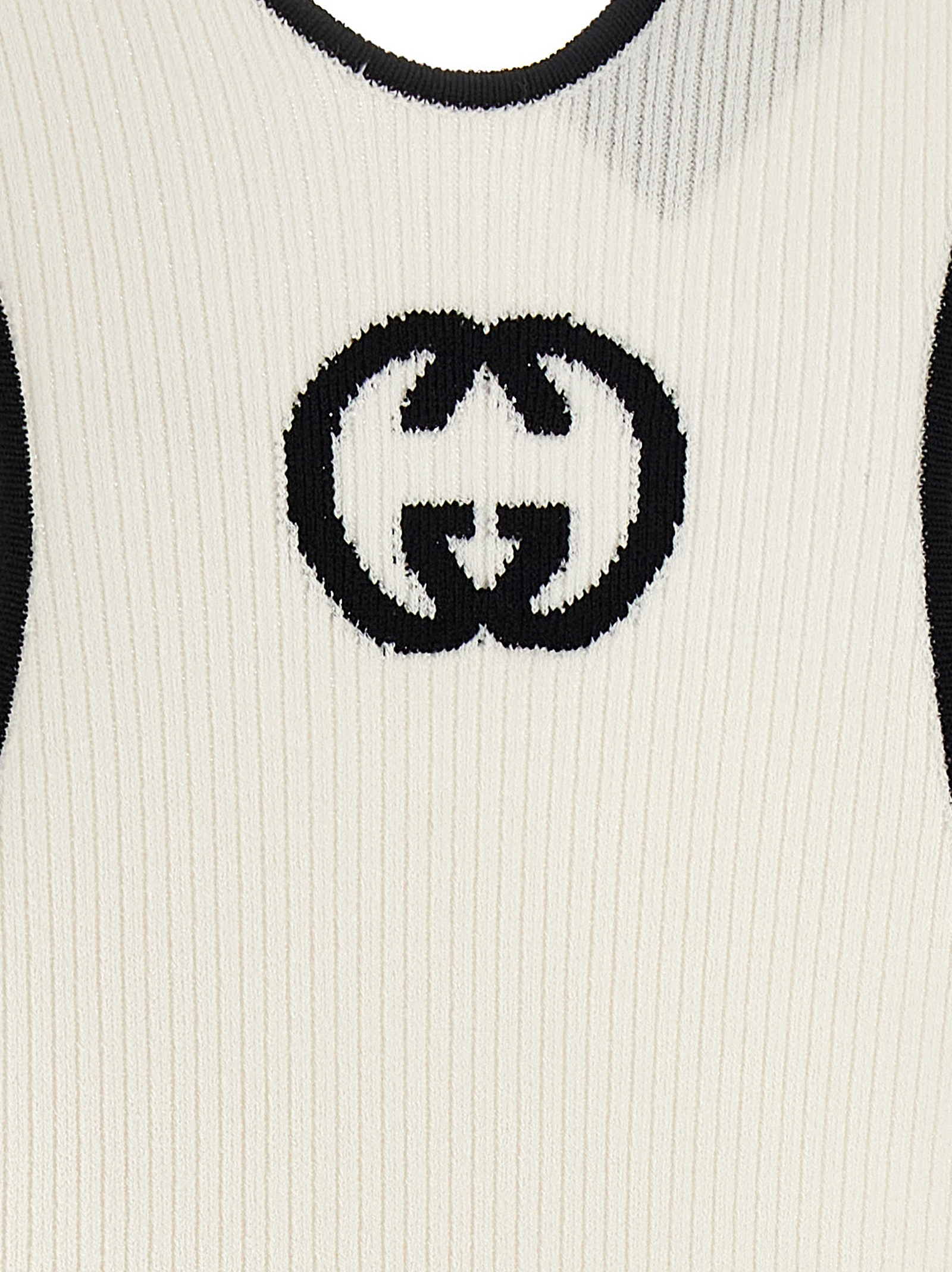 Sleeveless dress in stretch viscose with ‘Doppia G’ intarsia at the back, tank top model with contrasting piping, and wide round neckline.