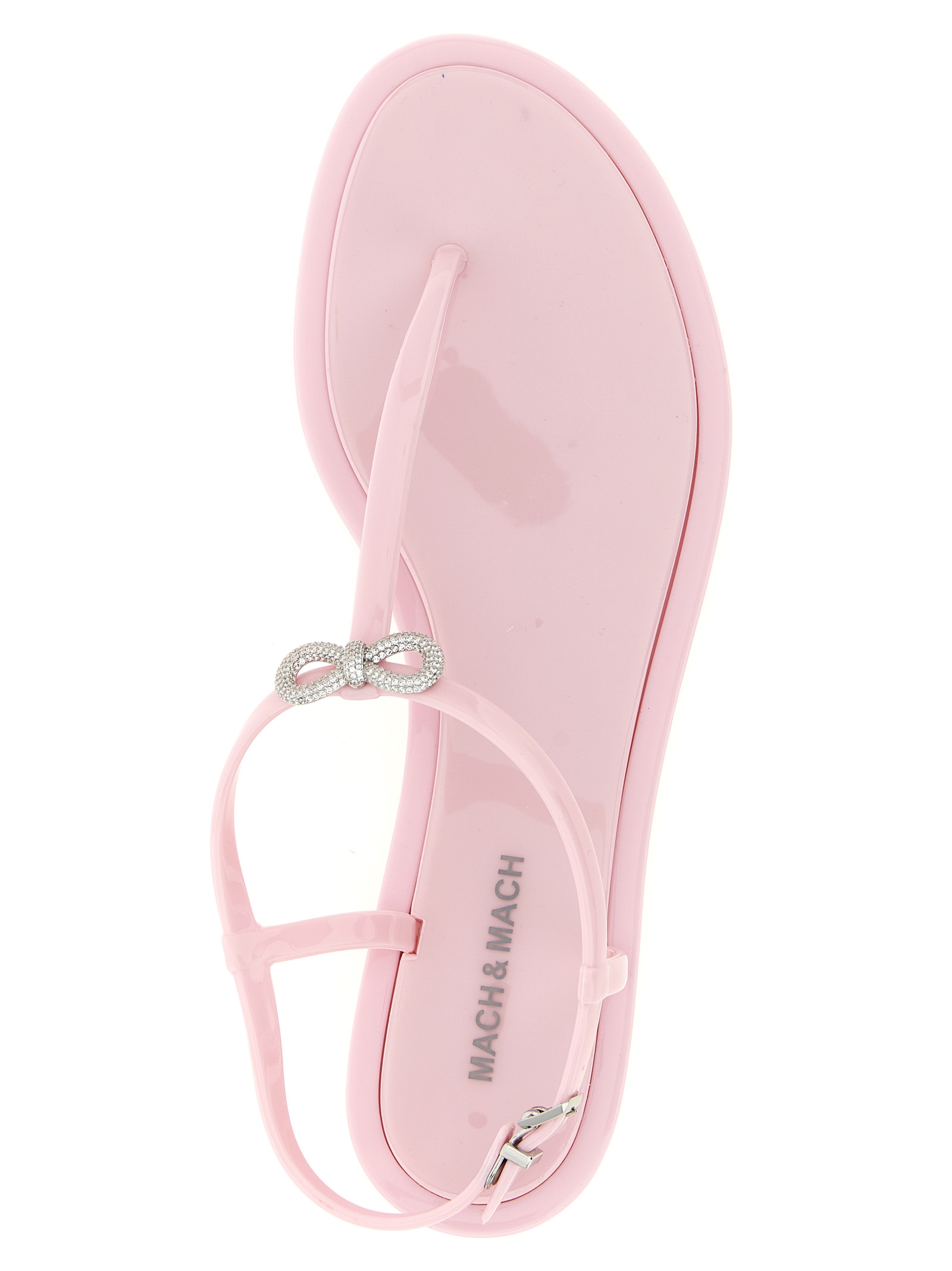Rubber sandals with metal ‘Double Bow’ with crystal appliqués, adjustable strap.