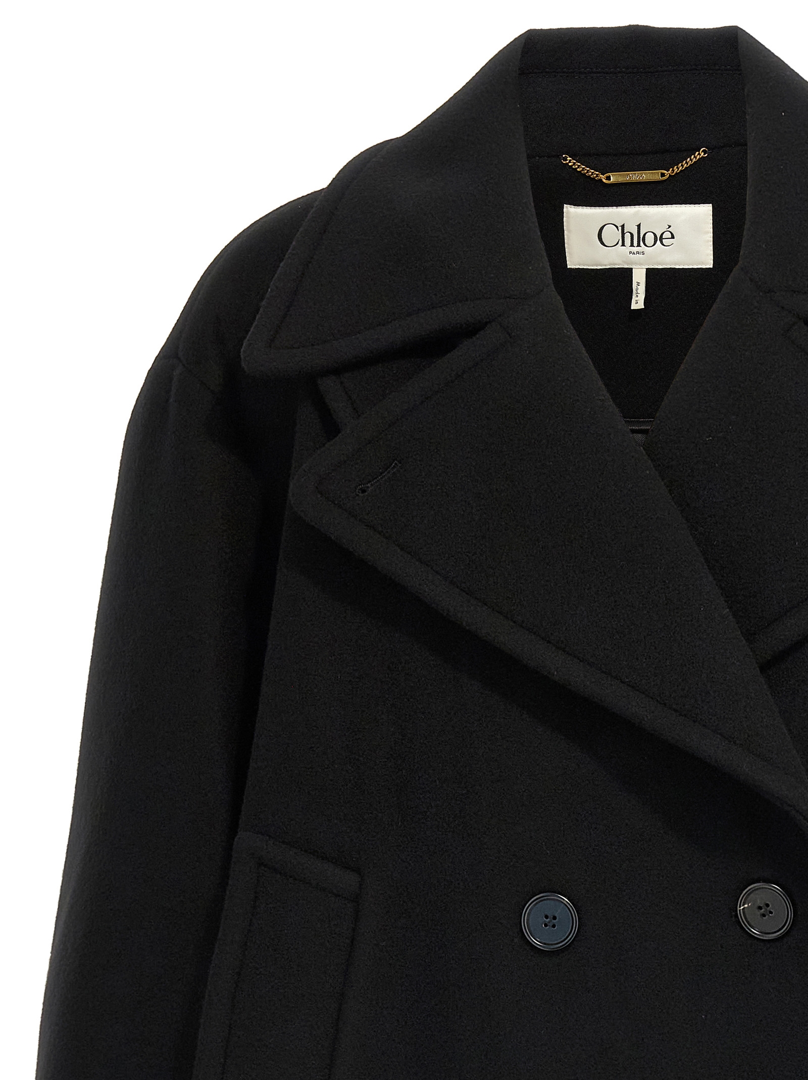 Double-breasted wool coat with front button closure, removable chin strap, pockets, long sleeves.
