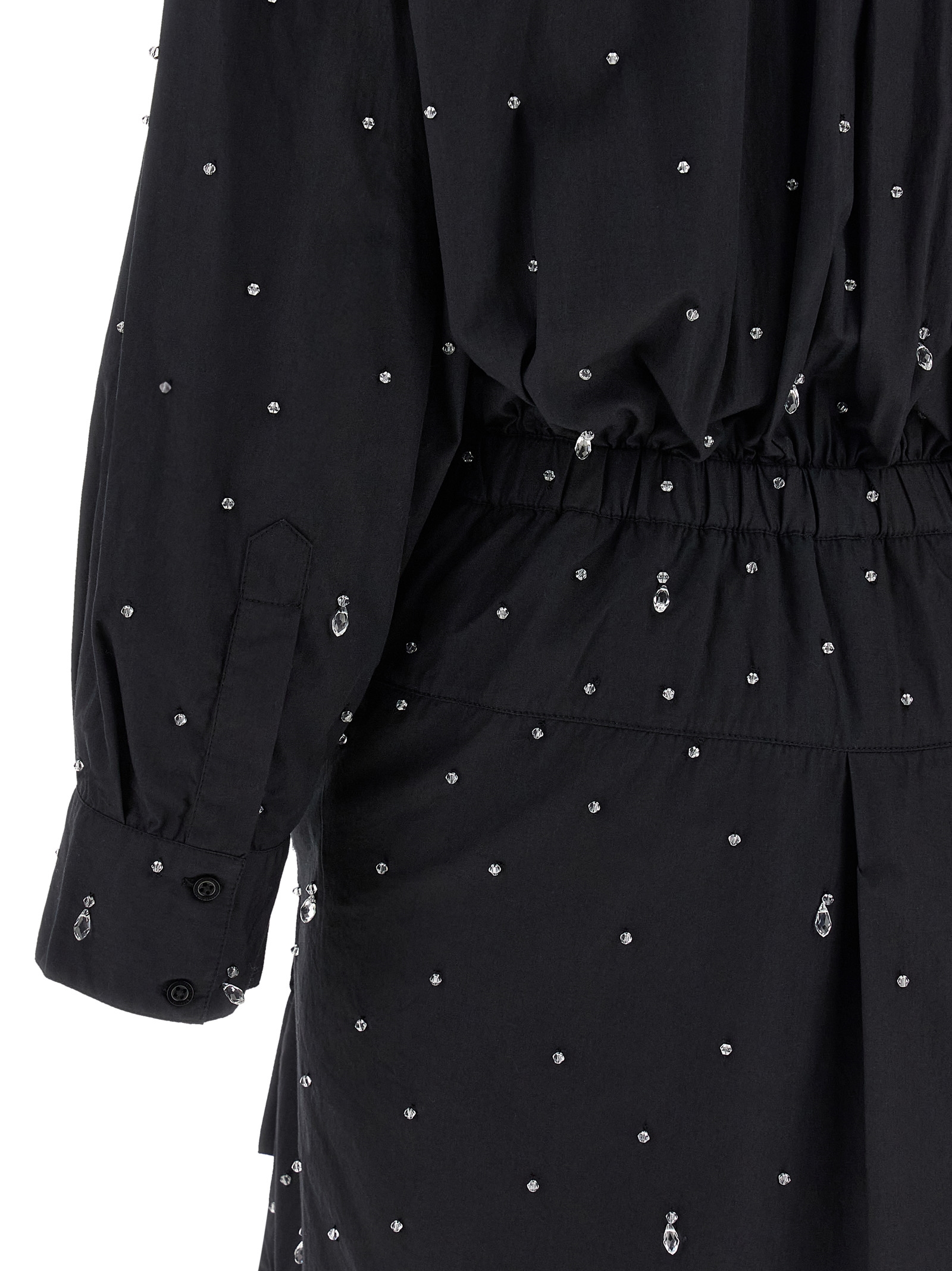Mini dress in cotton poplin with all-over crystal appliqué, double chemisier model with mirror construction, front button closure, long sleeves with cuffs, elastic waistband, additional sleeves to be tied around the waist or left loose along the sides, asymmetrical hem.