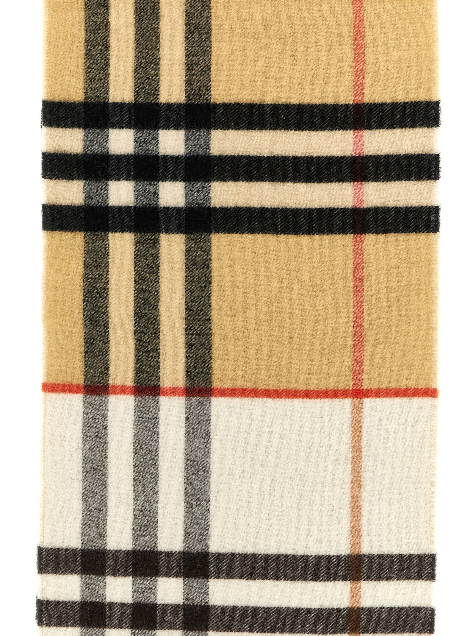 Double face cashmere ‘Double GC’ scarf with jacquard ‘Equestrian Knight Design’ and Burberry Check in contrasting colours and fringed hem.