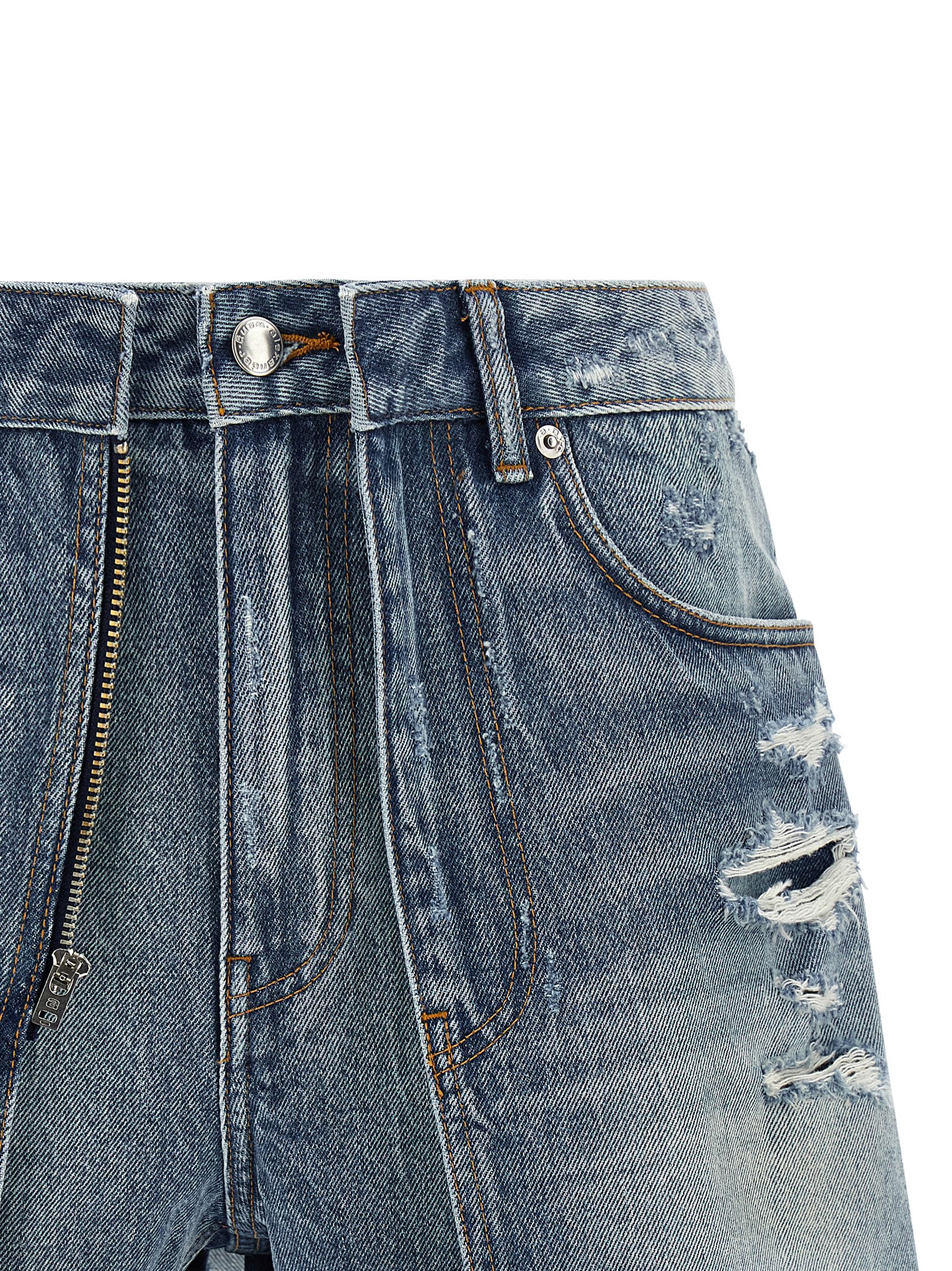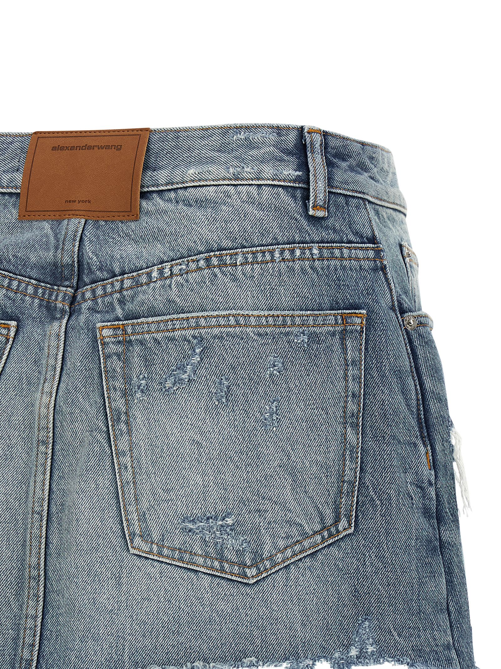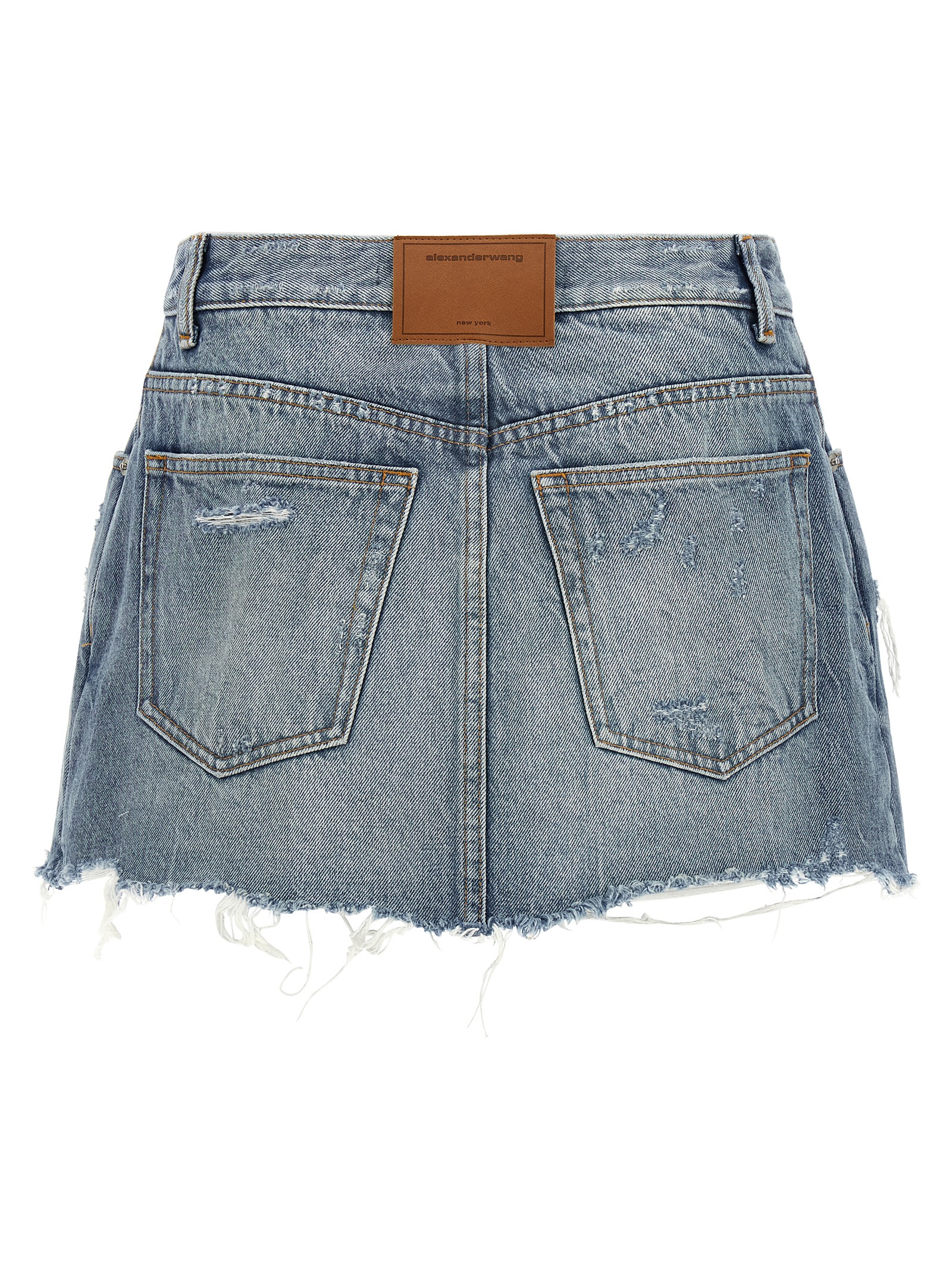 Double layer skort in used-effect stone washed cotton denim with rips and breaks, contrast stitching, front zip and button closure, five pockets, back leather logo tag, leg bottoms with frayed raw cut hem.