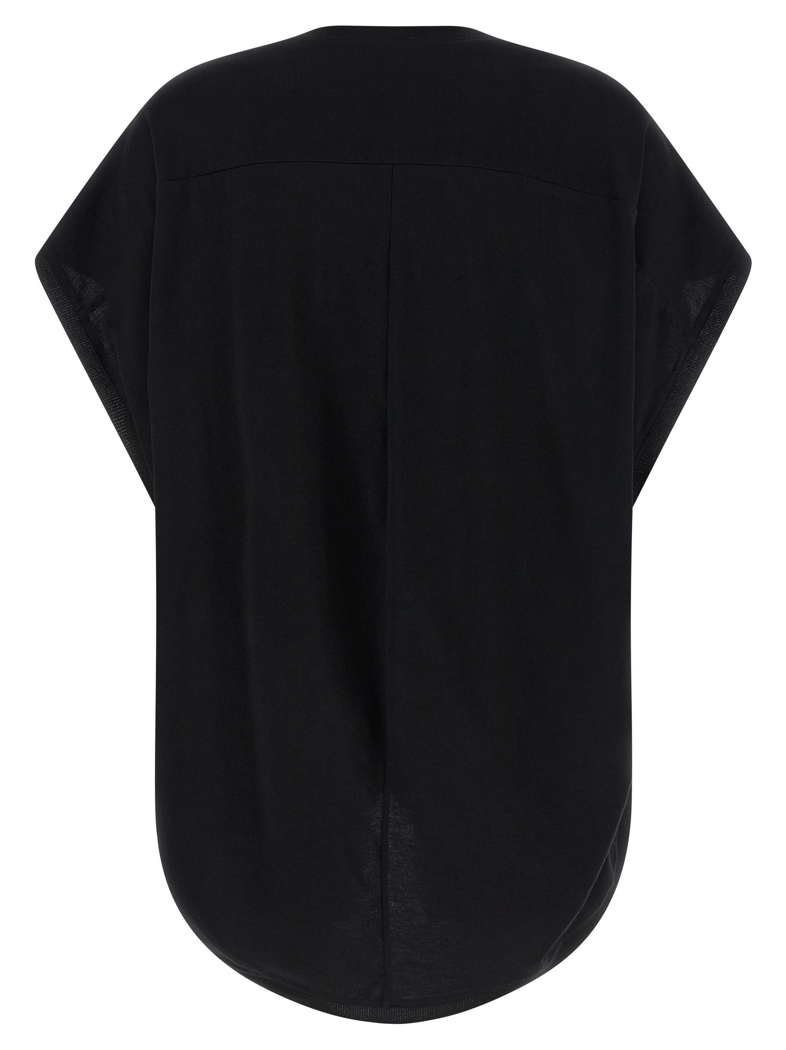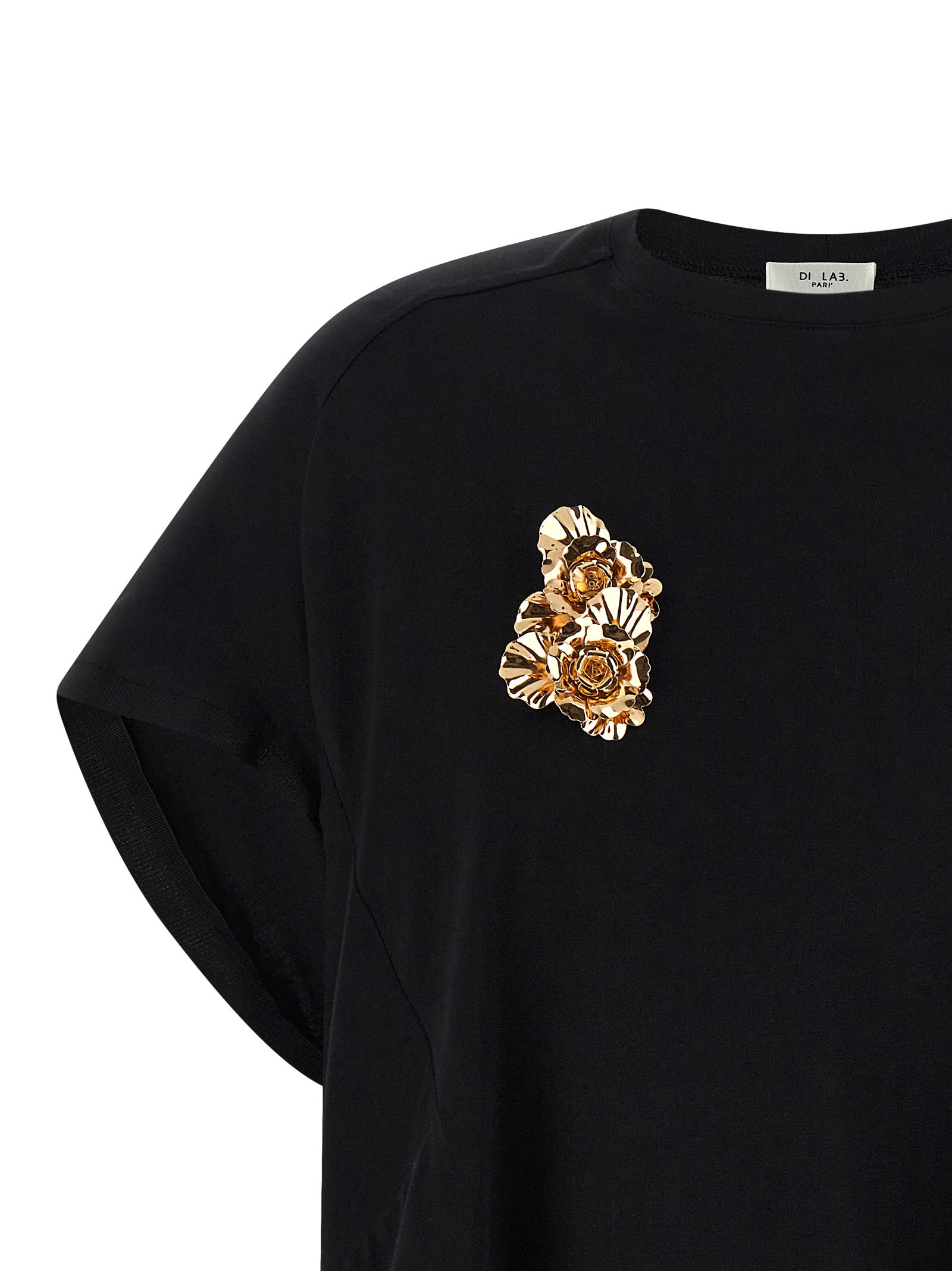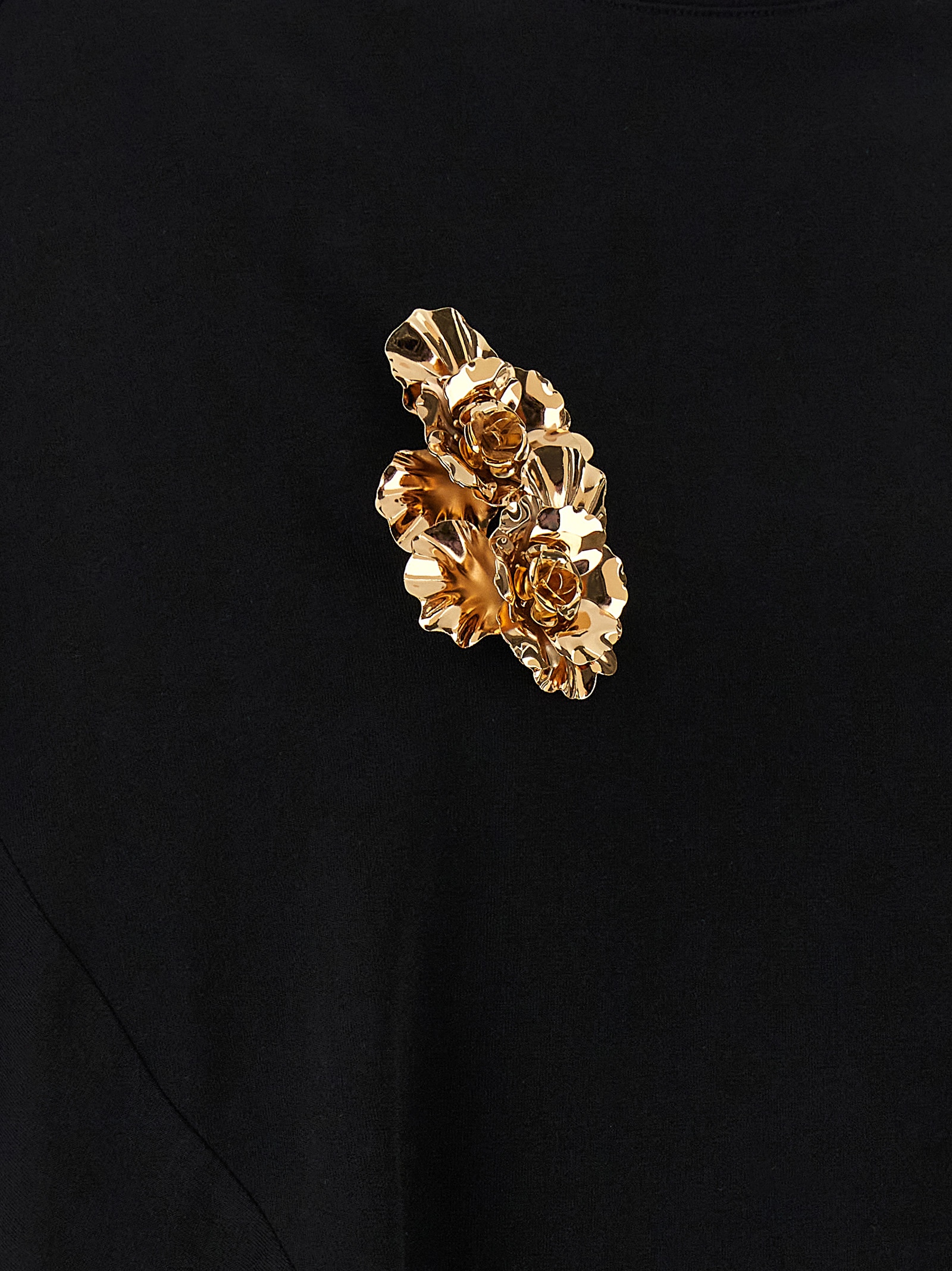 Cotton T-shirt, tone-on-tone grosgrain piping, panel construction, double removable floral metal brooch, crew neck, wide asymmetrical short sleeves with cuffs, rounded and asymmetrical hem.