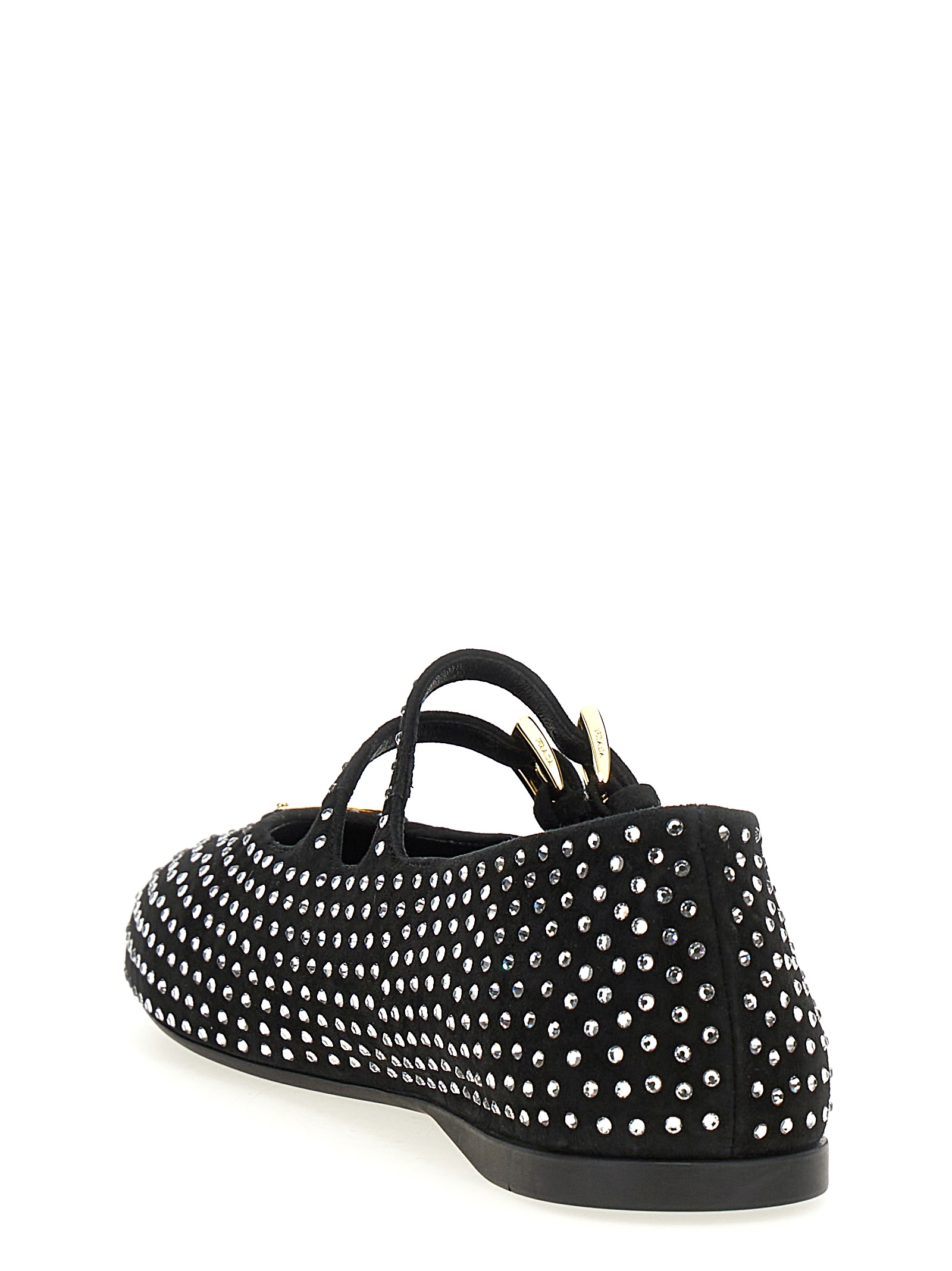 Suede ballet flats with all-over rhinestone appliqués, double adjustable strap, front enameled metal triangle logo, rubber sole.