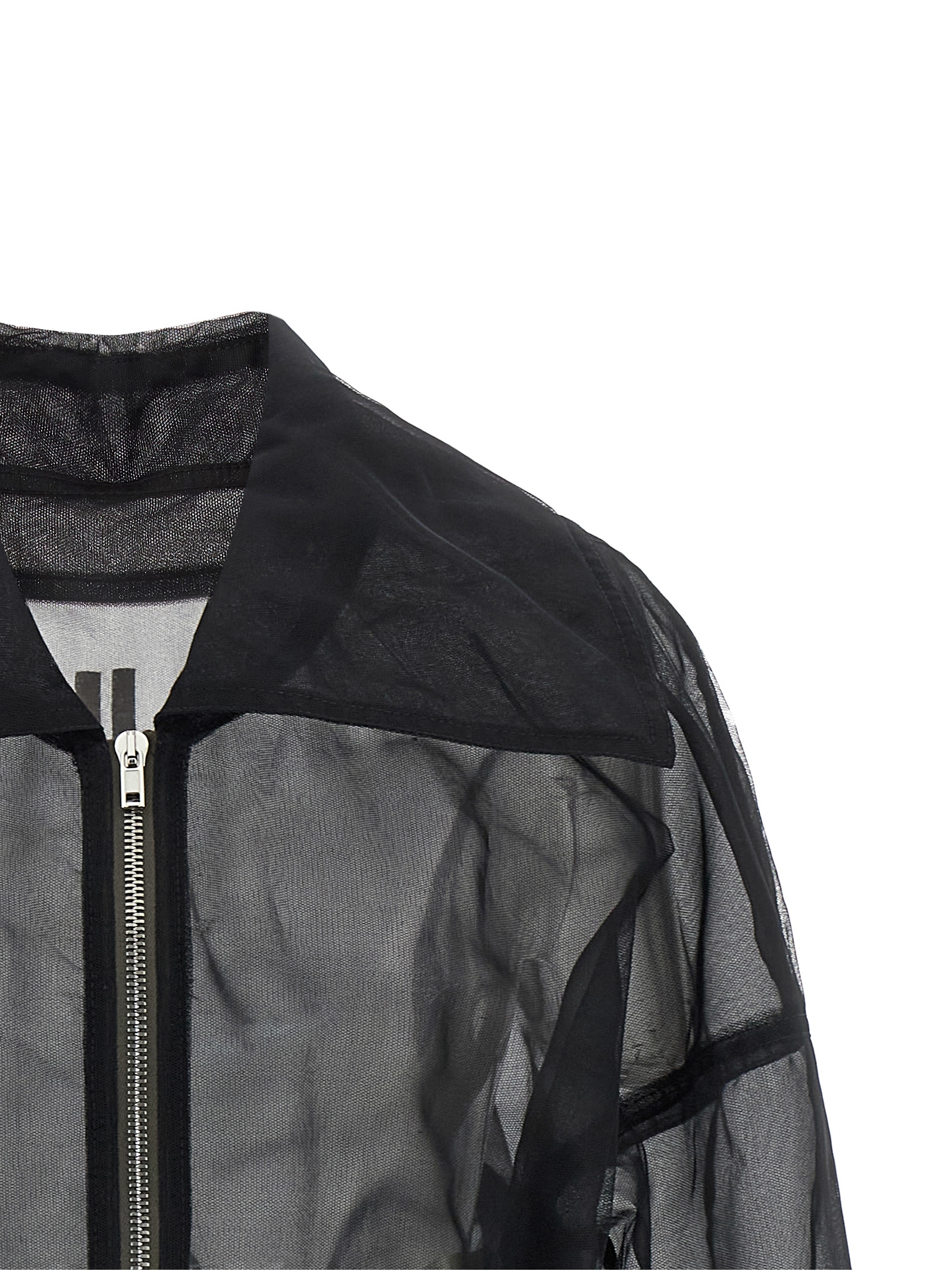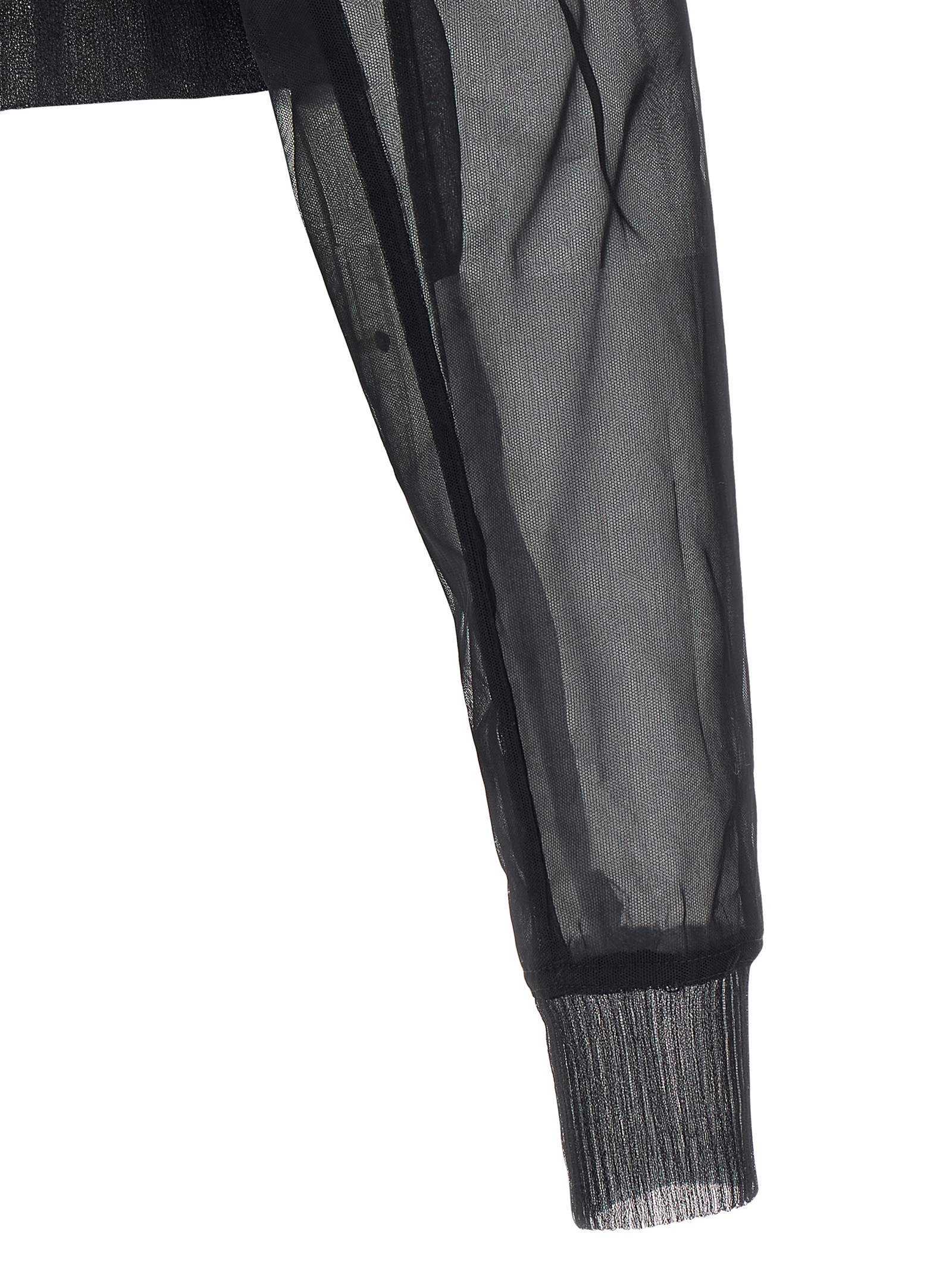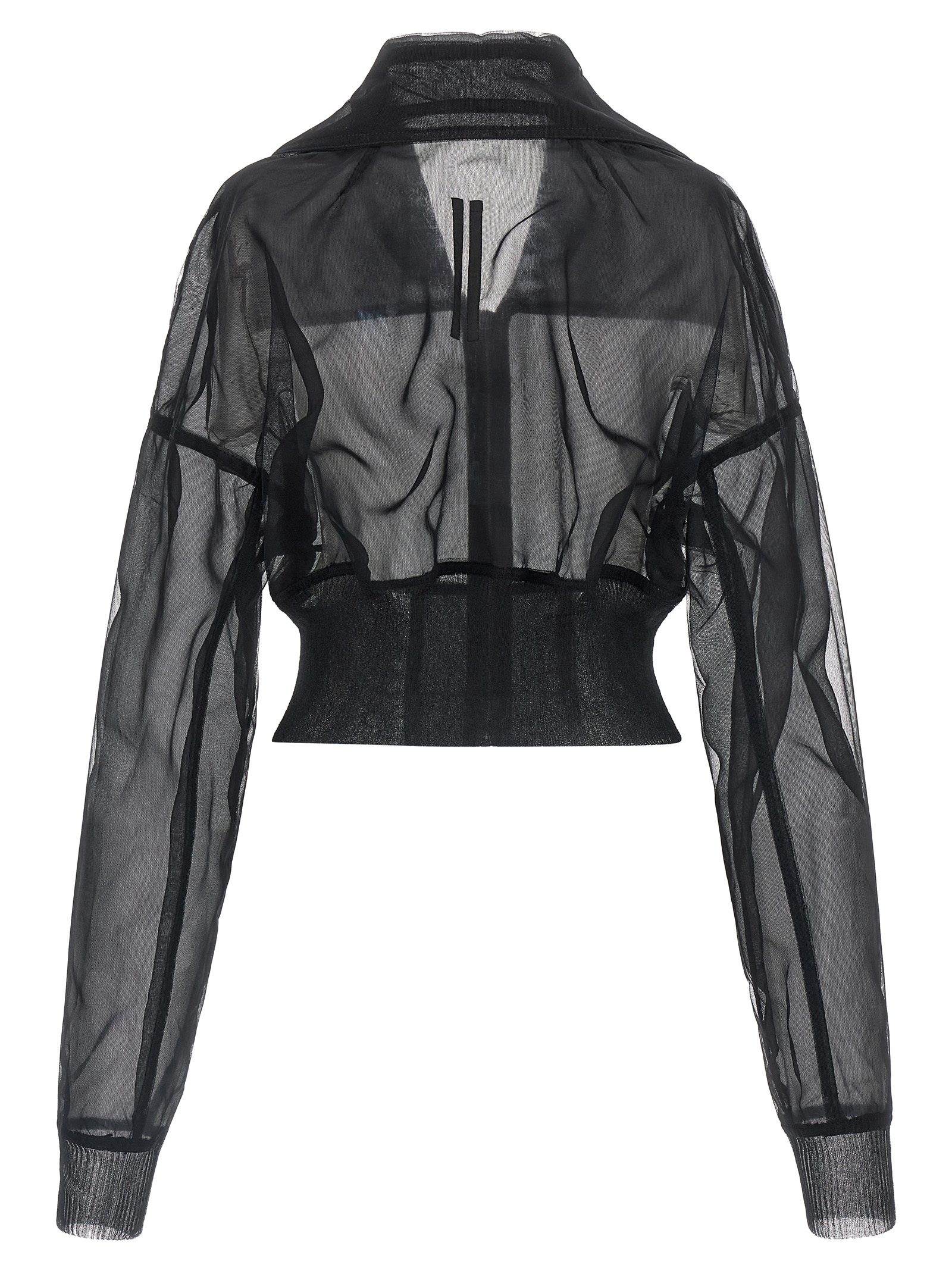 ‘Dracucollar cropped’ bomber jacket in semi-transparent doubled tulle, short model with maxi elasticized knit hem on the hem, front closure with metal zip, maxi pointed collar, wide maiches, long with cuffs on the bottom.