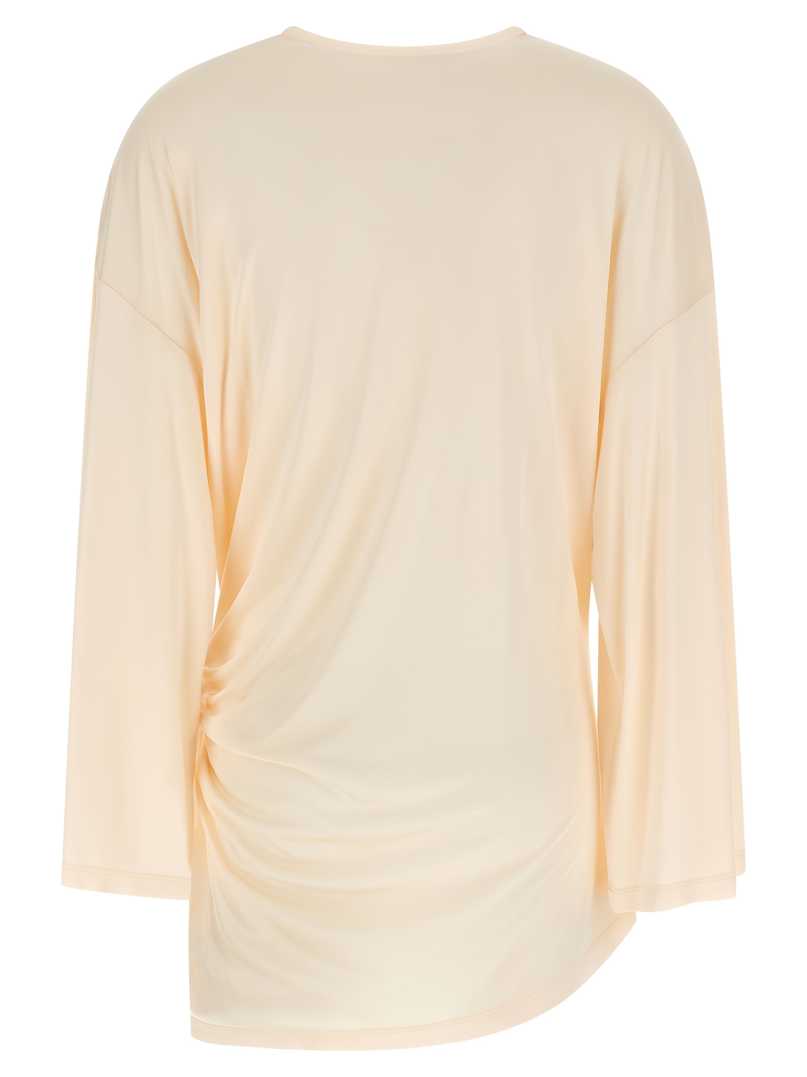 Fluid viscose mini dress, round neckline, wide long flared sleeves with dropped shoulders, side metal detail that creates draping and defines the split.