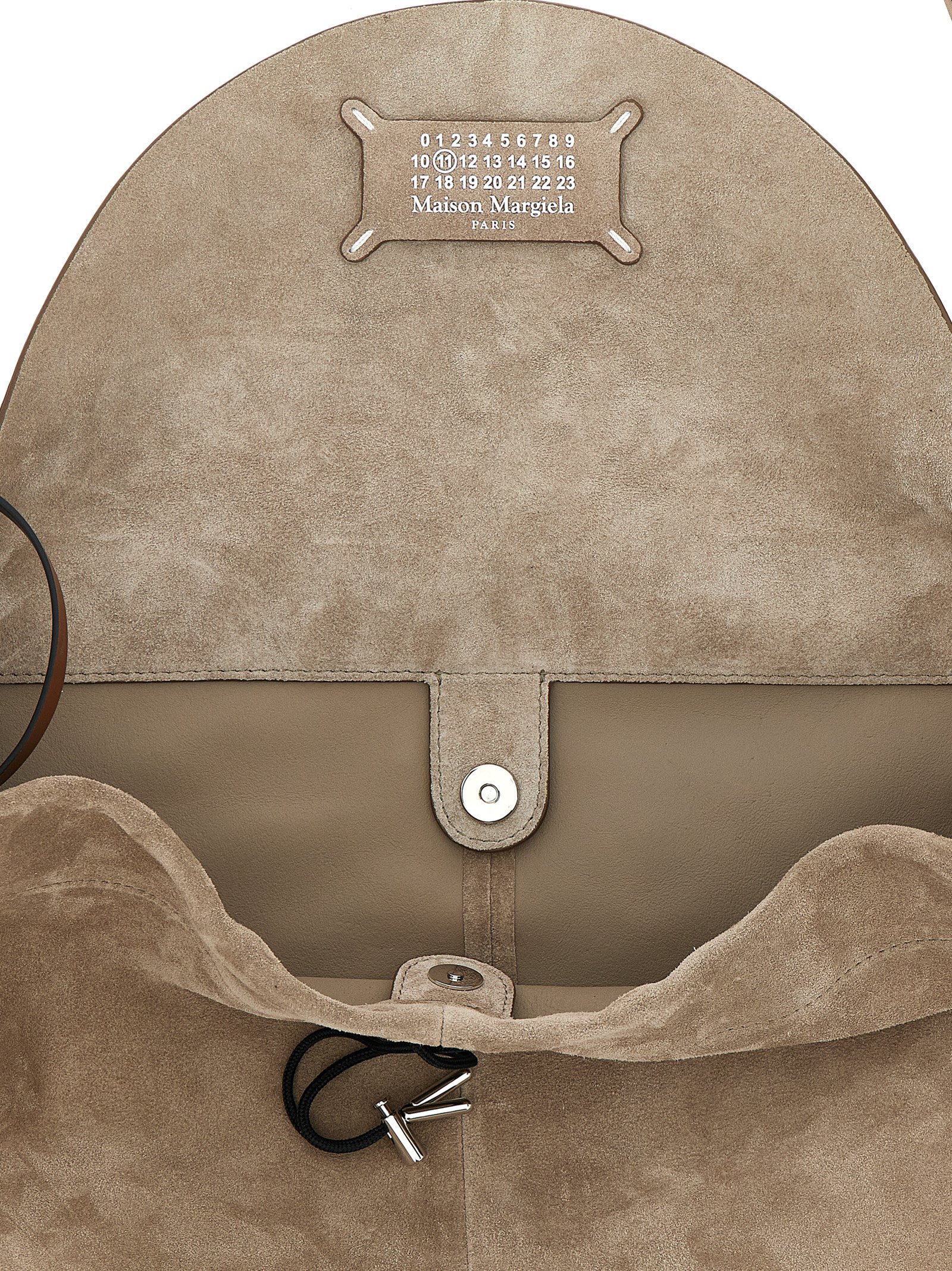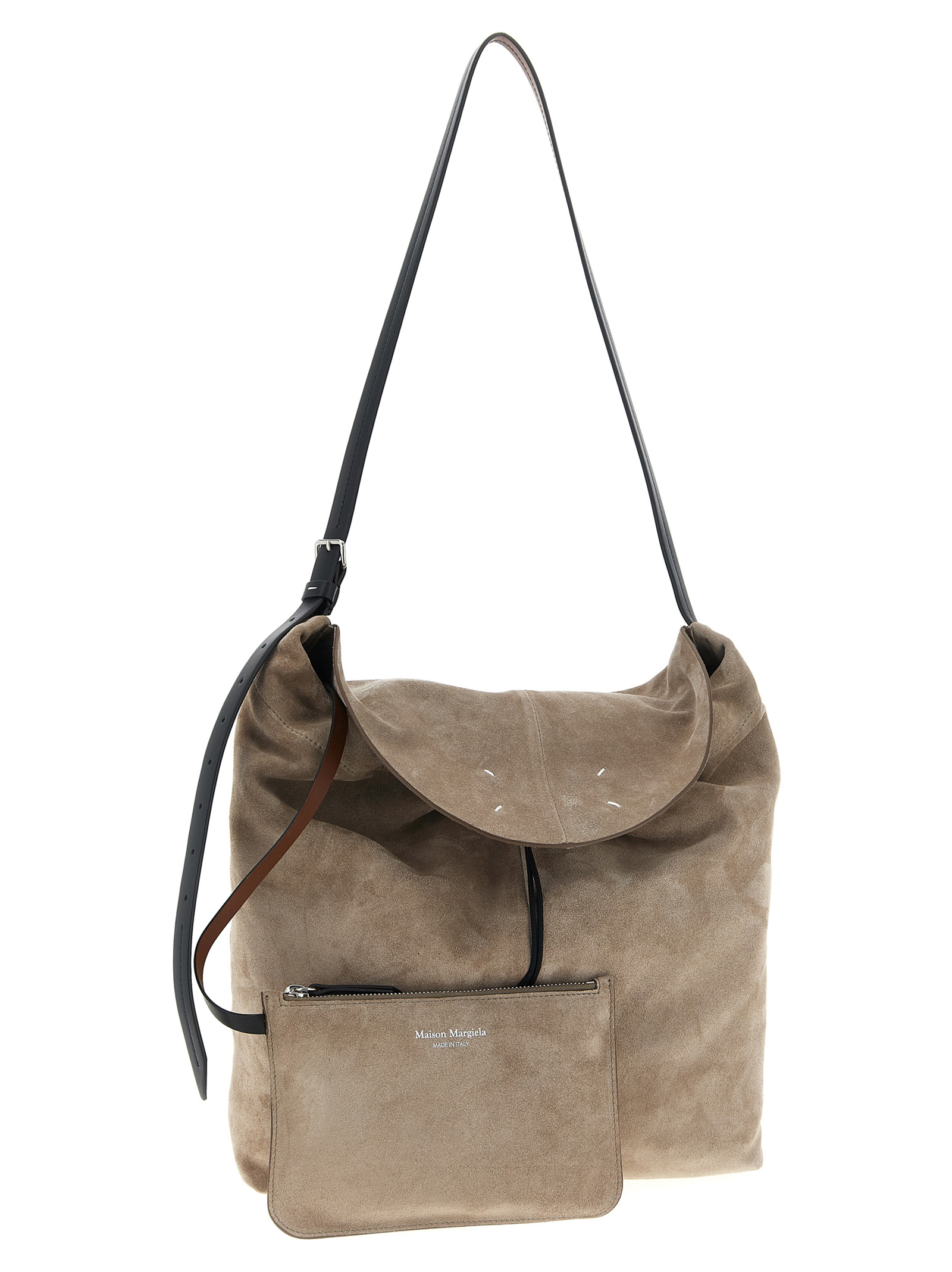Small suede ‘Drawstring Hobo’ shoulder bag, flap closure with inner Four Stitches and outer ‘Numeric Signature MM6’ patch, inner drawstring, adjustable contrast smooth leather shoulder strap, inner clutch.