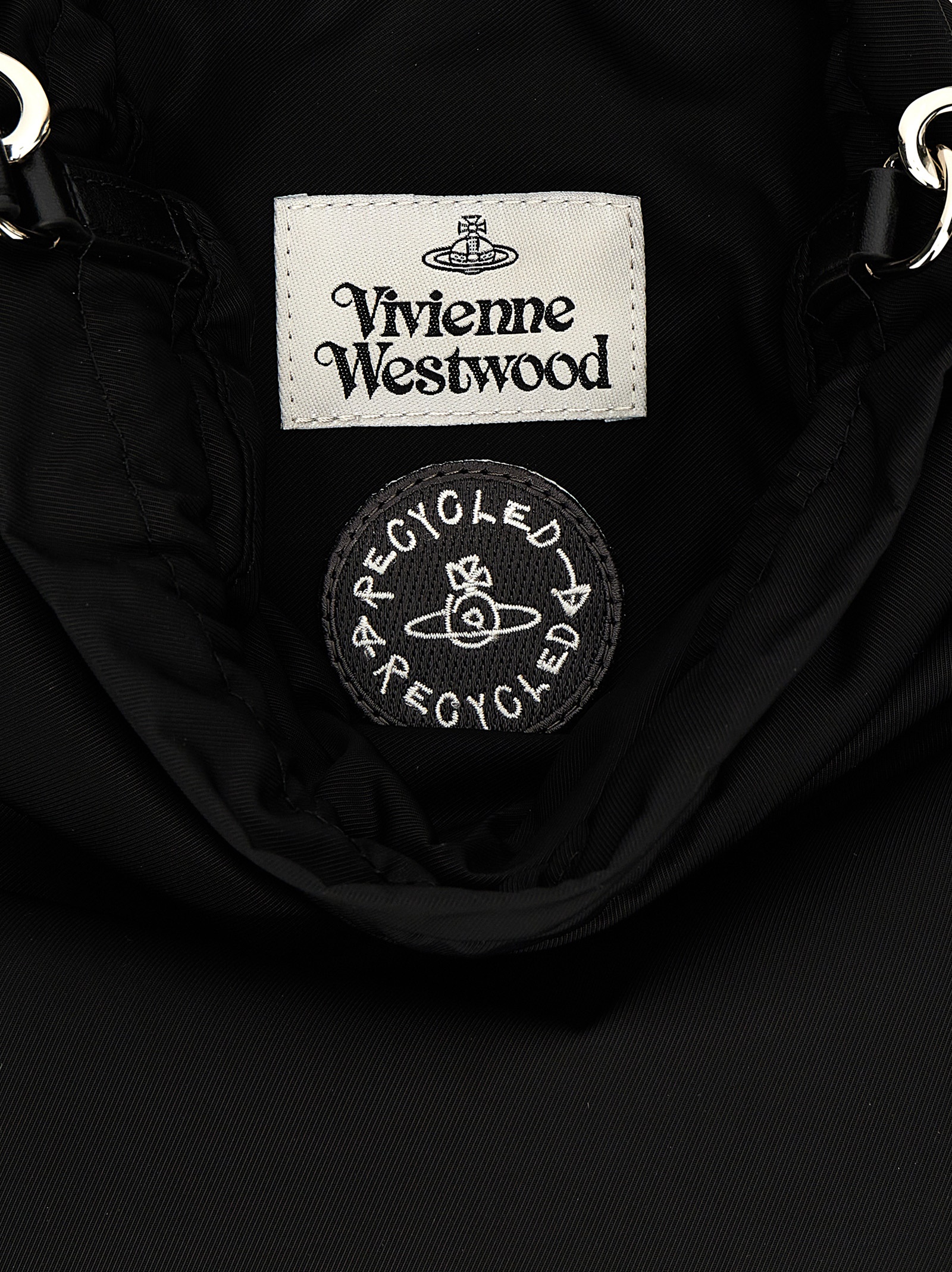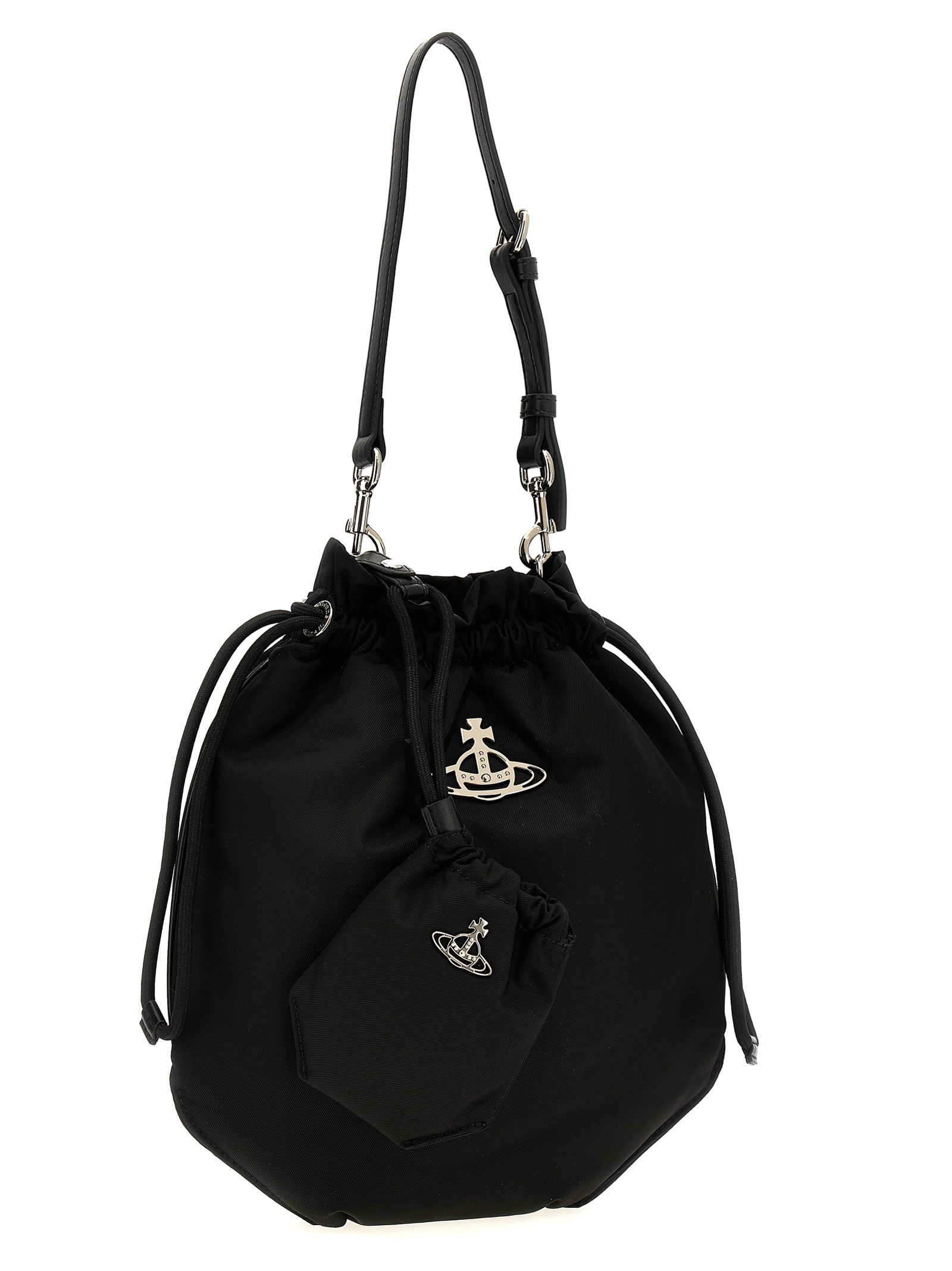 ‘Drawstring Pouch’ nylon handbag with adjustable drawstring closure, metal Orb logo on the front, adjustable and removable handle, removable pouch with front metal logo.
