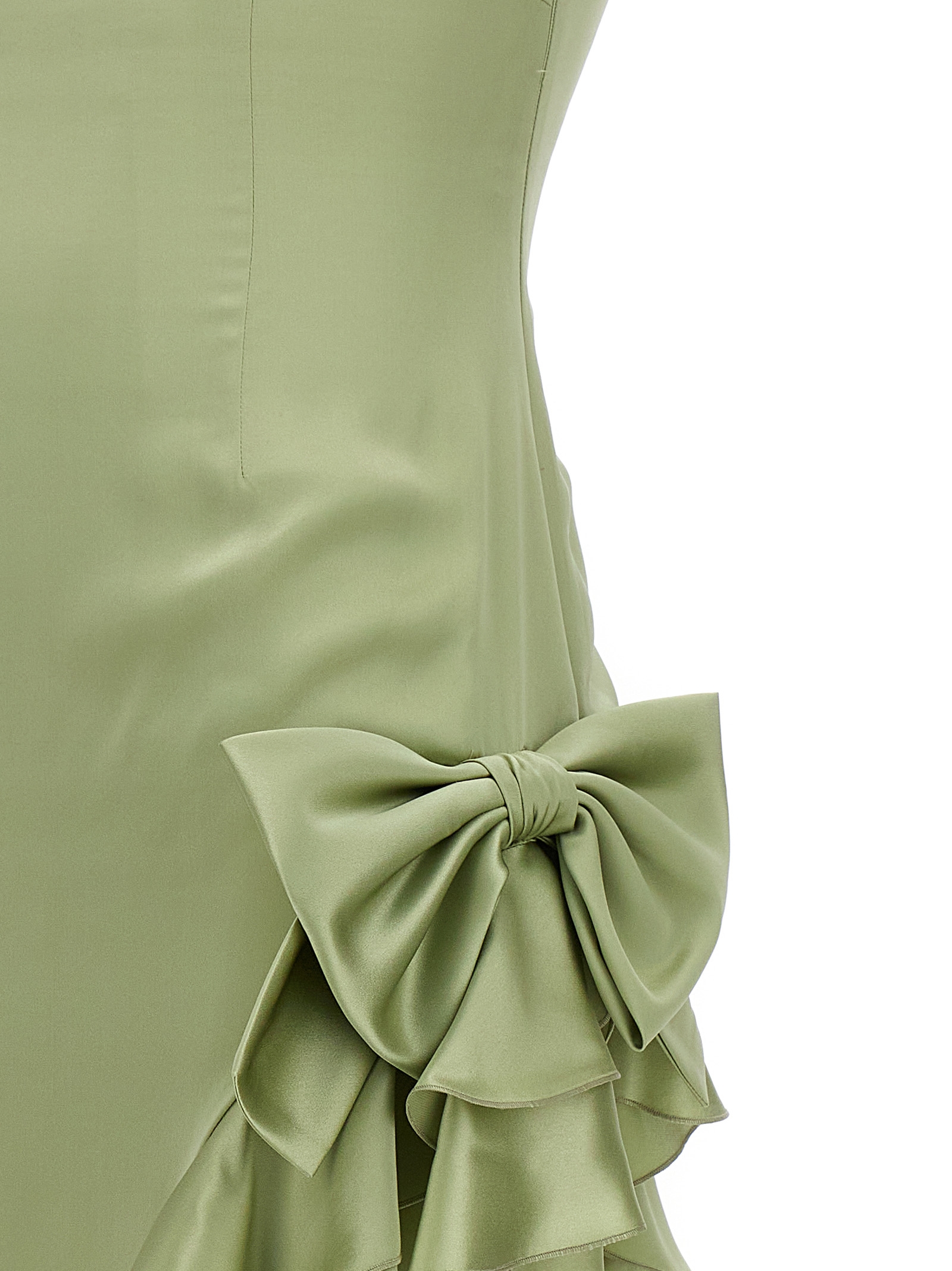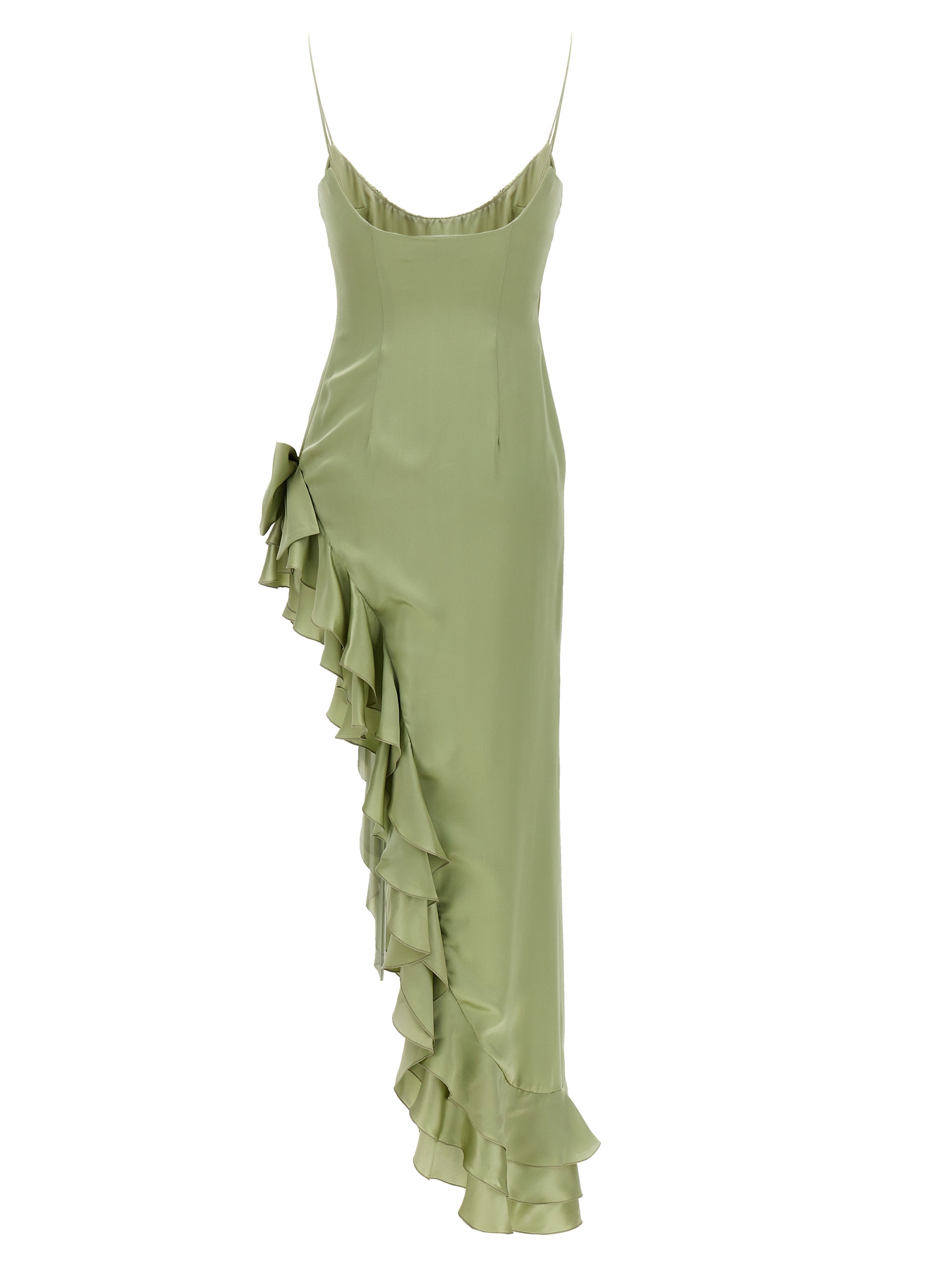 Long silk dress with maxi side split and ruffles, bow appliqué, thin straps and a side zip closure.
