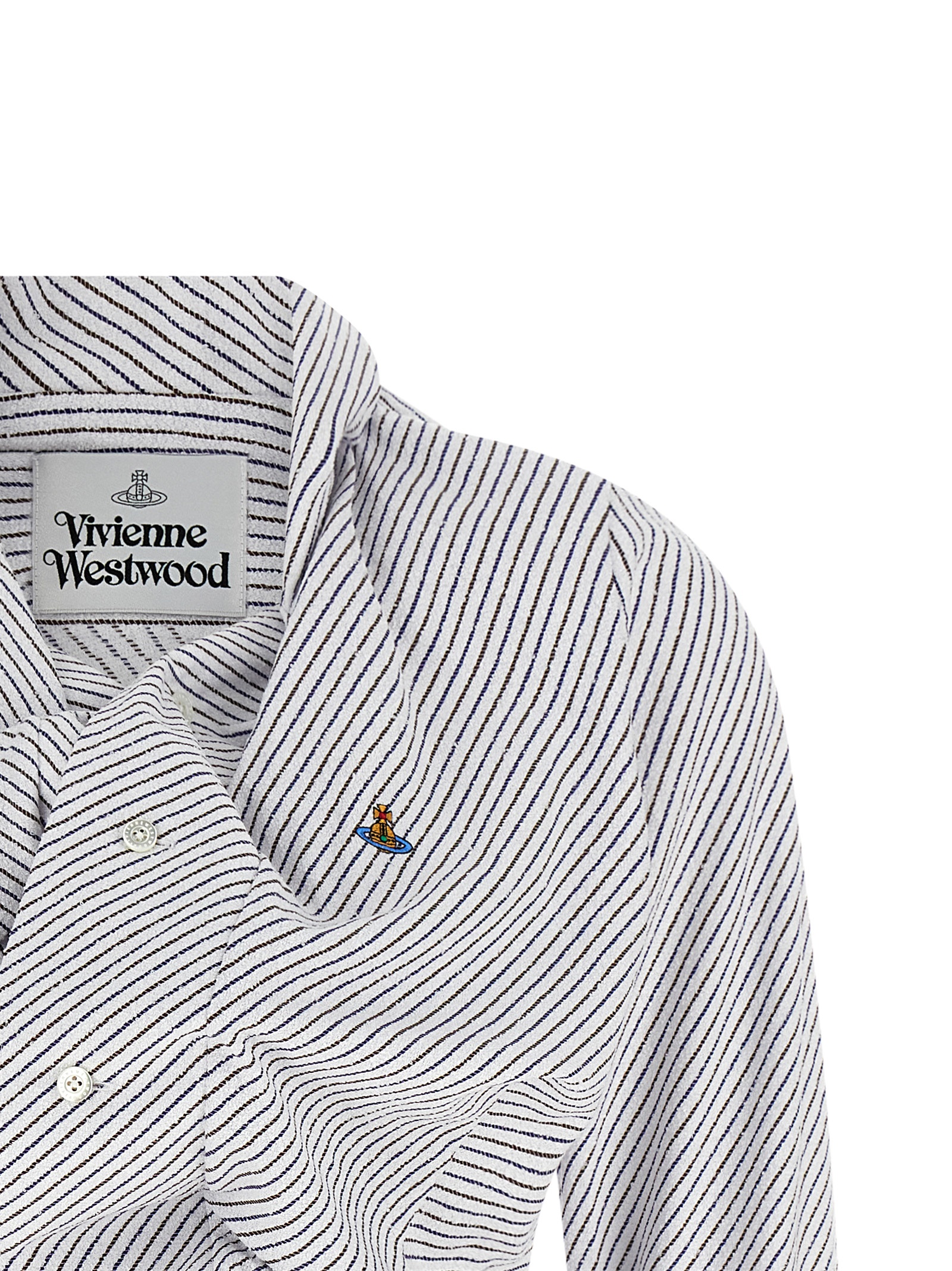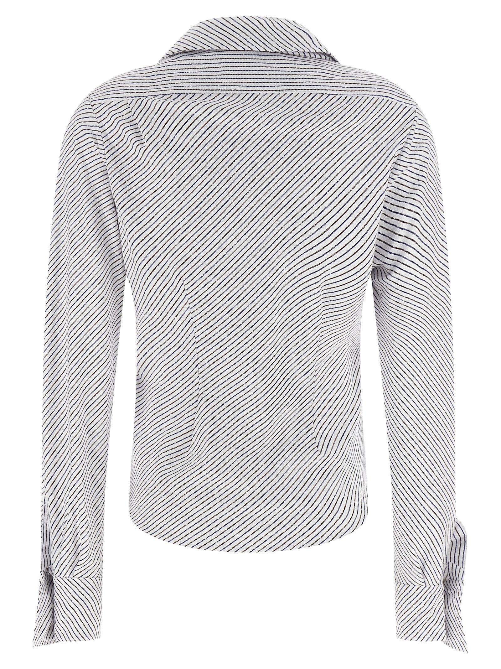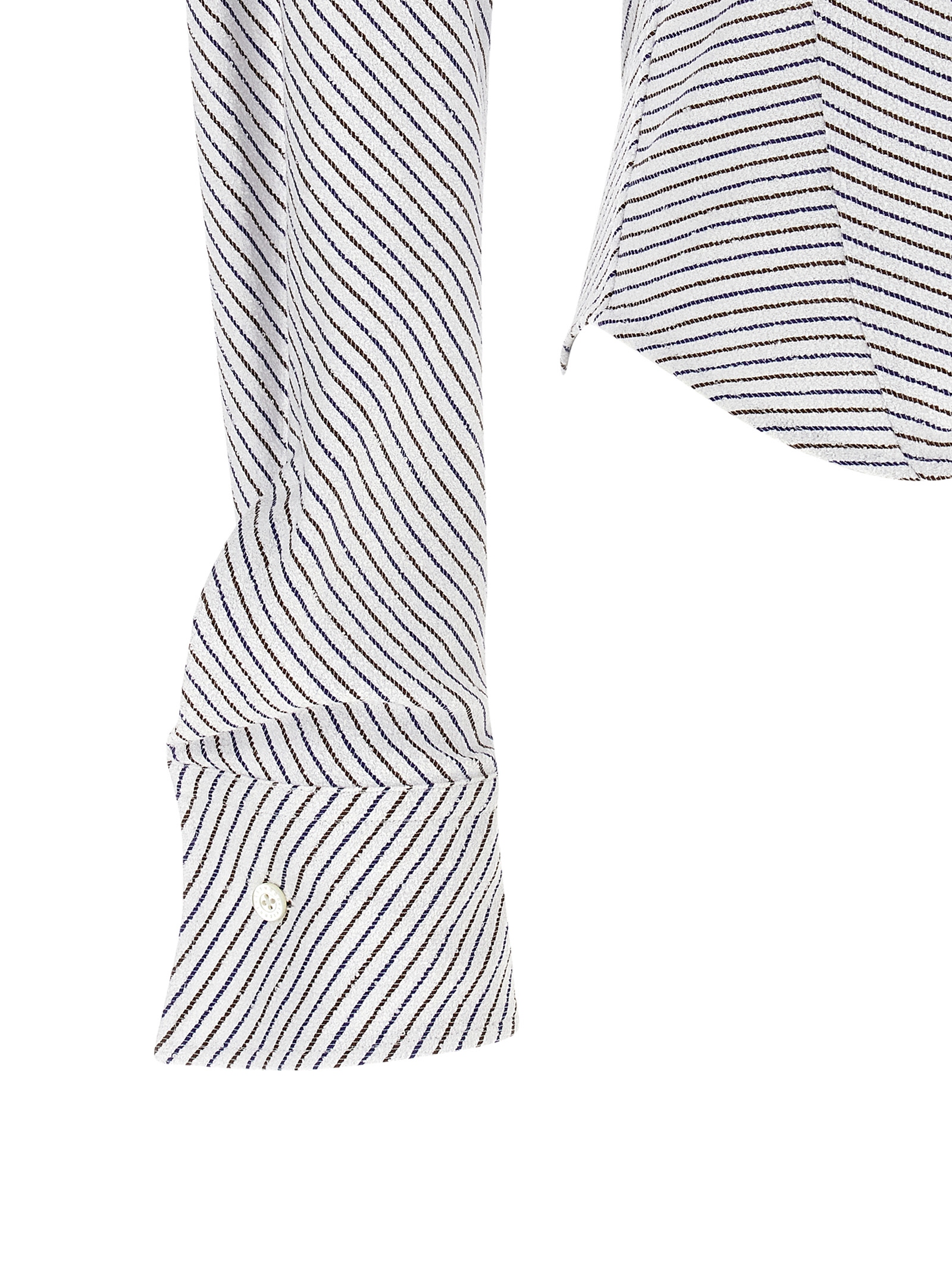 ‘Drunken’ two-tone striped cotton terry shirt, distorted asymmetrical construction, ‘Orb’ logo embroidery and front drape, pin tucks, off-center button closure, long sleeves with asymmetric cuffs.
