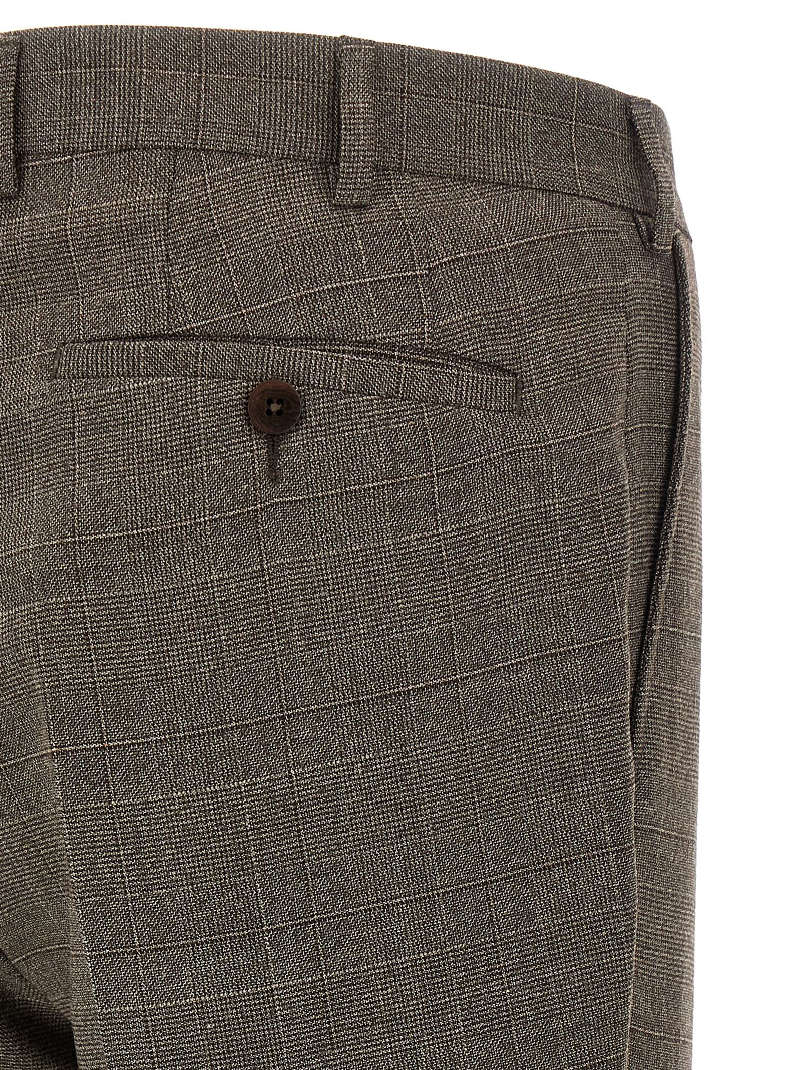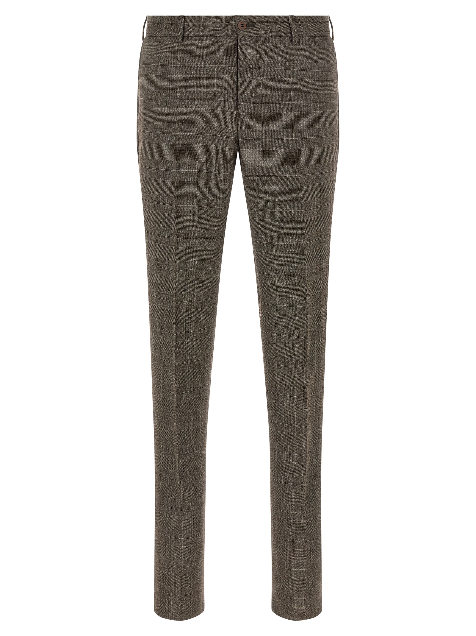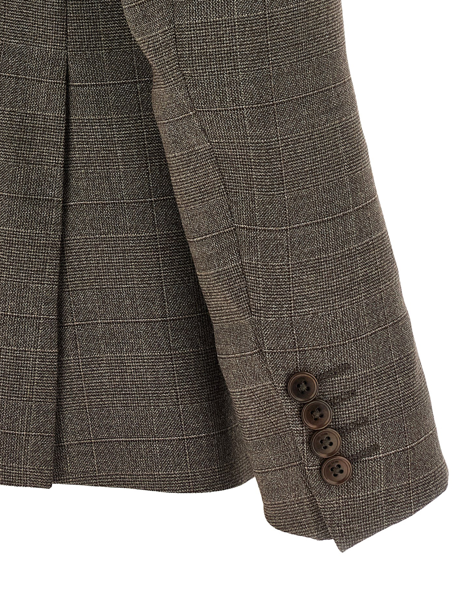 Prince of Wales patterned wool blend Duca dress consisting of single-breasted blazer with front button closure, spear lapels with removable metal brooch, breast pocket, flap pockets, cupro lining, two inner pockets, structured shoulder strap, buttonhole cuffs, back slits and stretched pleat trousers, front ‘americane pockets”, back welt pockets, front zip and button closure, cupro lining.