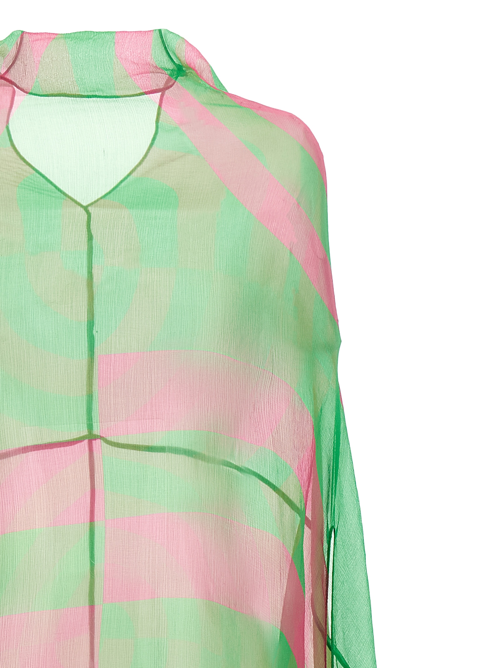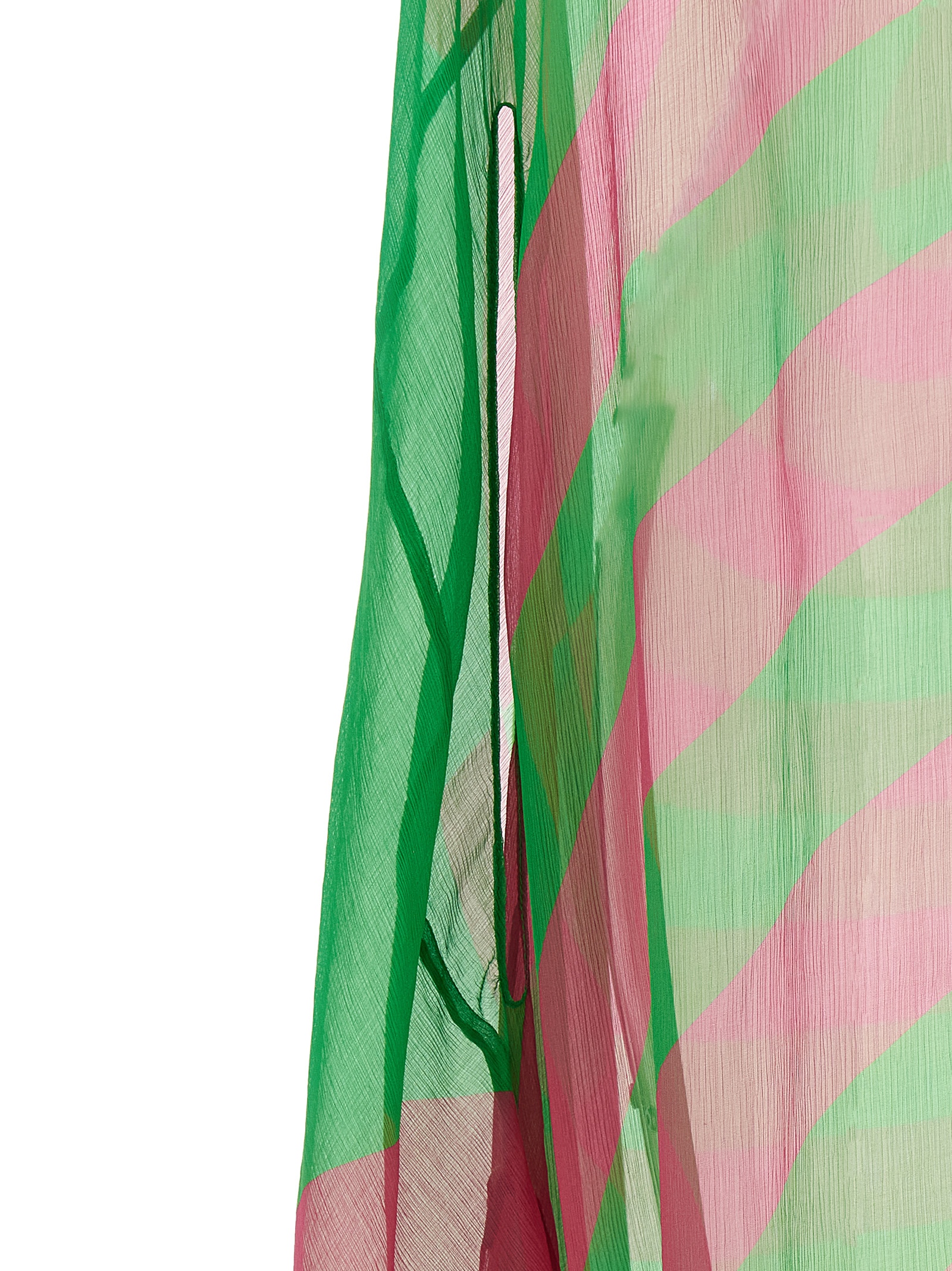 ‘Ducy’ midi dress in semi-transparent silk with crunchy patterned hand, neckline with front draping, sleeveless with dropped shoulder, asymmetrical hem with the possibility of adjusting the side flaps.