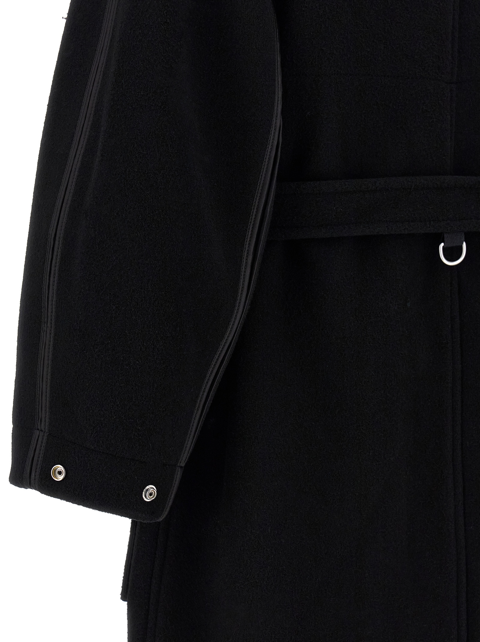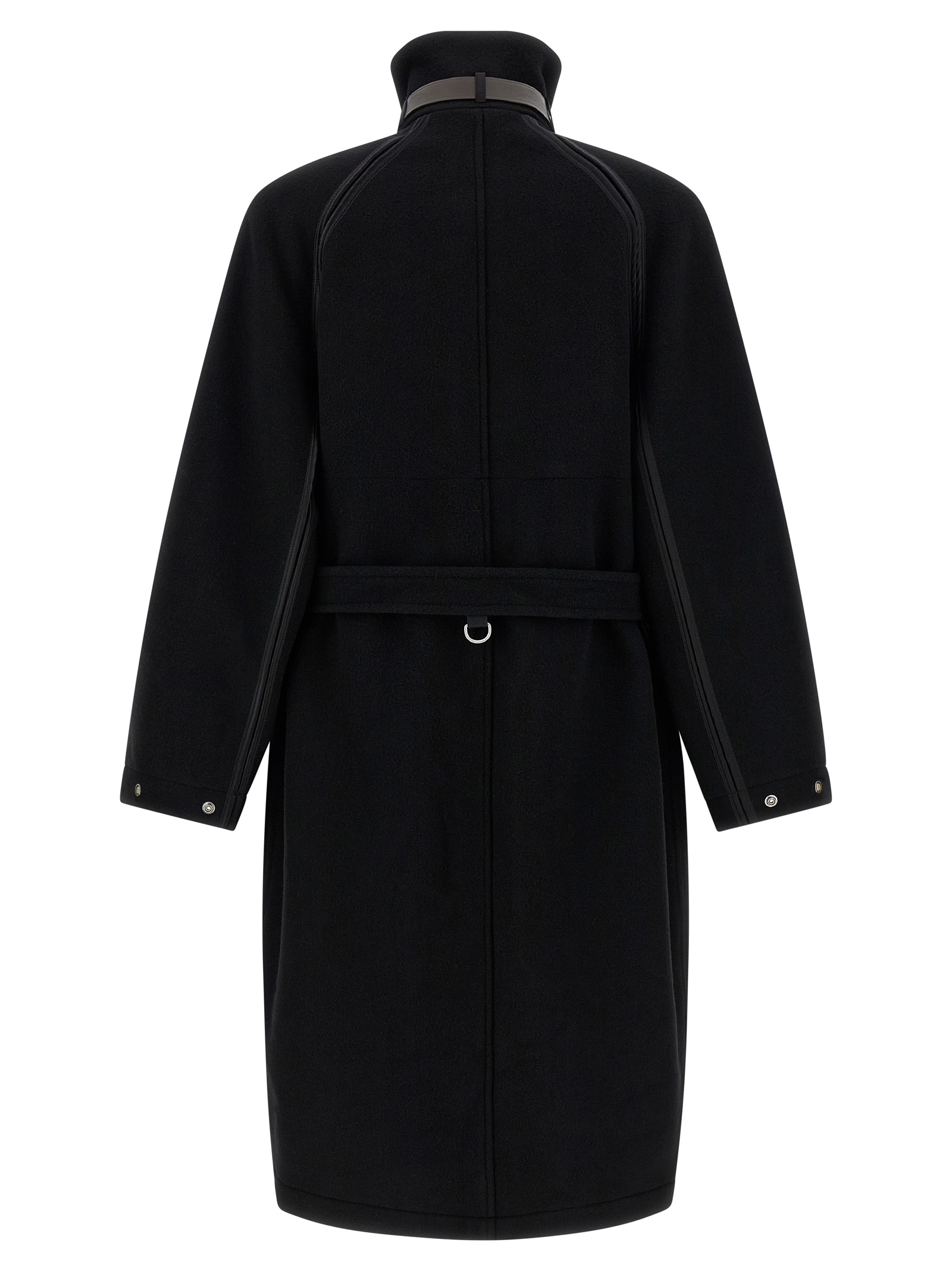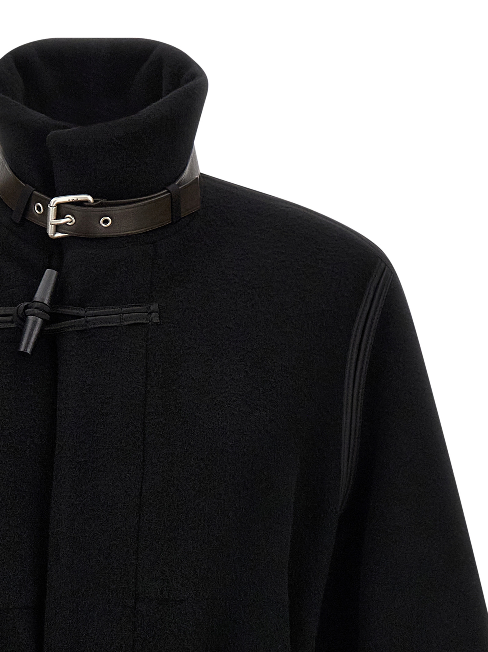 Duffle’ wool coat with glossy fabric piping, metal details, front closure with hanks, high neck with adjustable strap with buckle, adjustable waist belt with buckle, side pockets, long sleeves with snap buttons on the cuff.