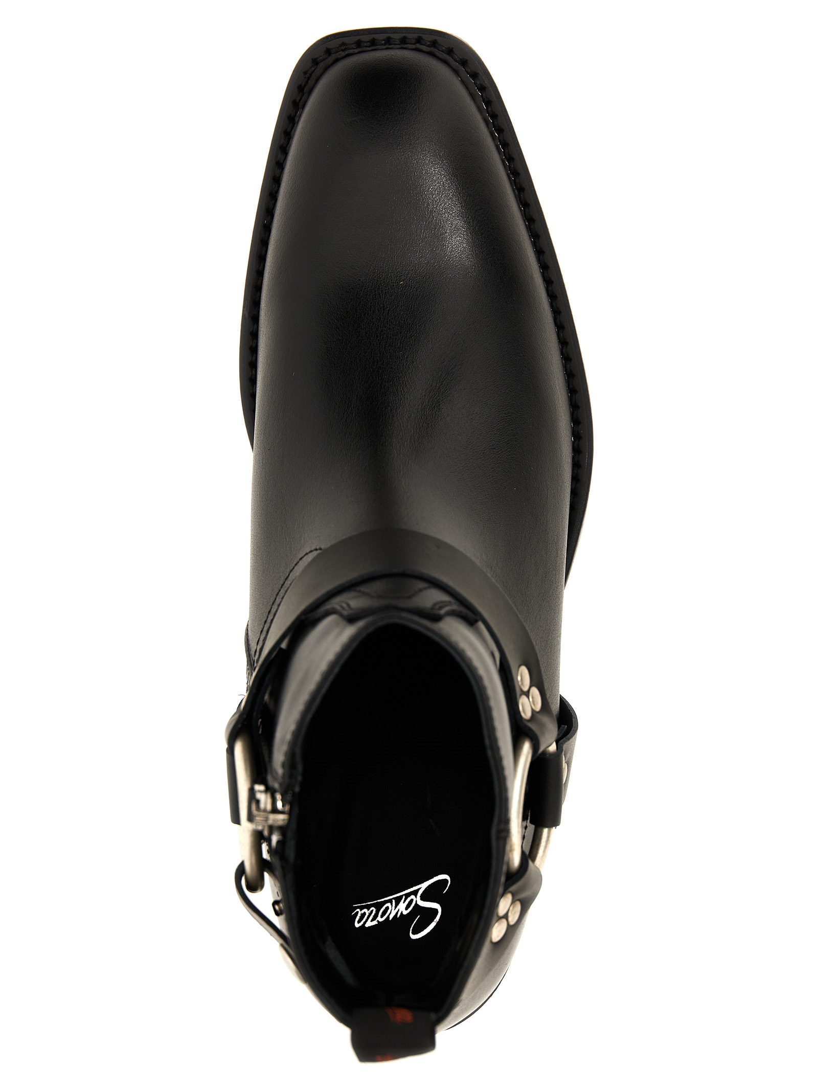 ‘Dulce Belt’ leather ankle boots with ankle strap detail, heel, side zip.
