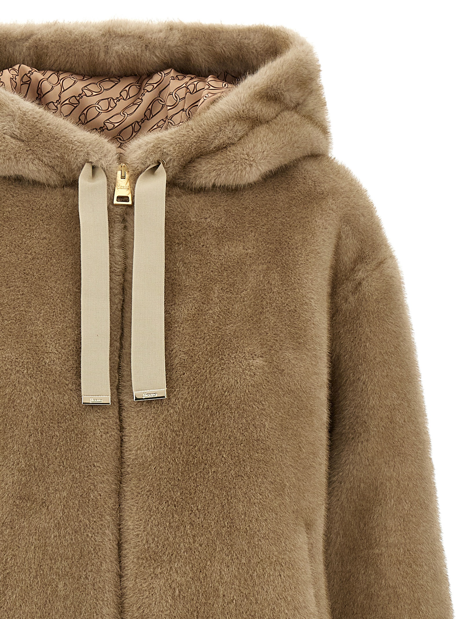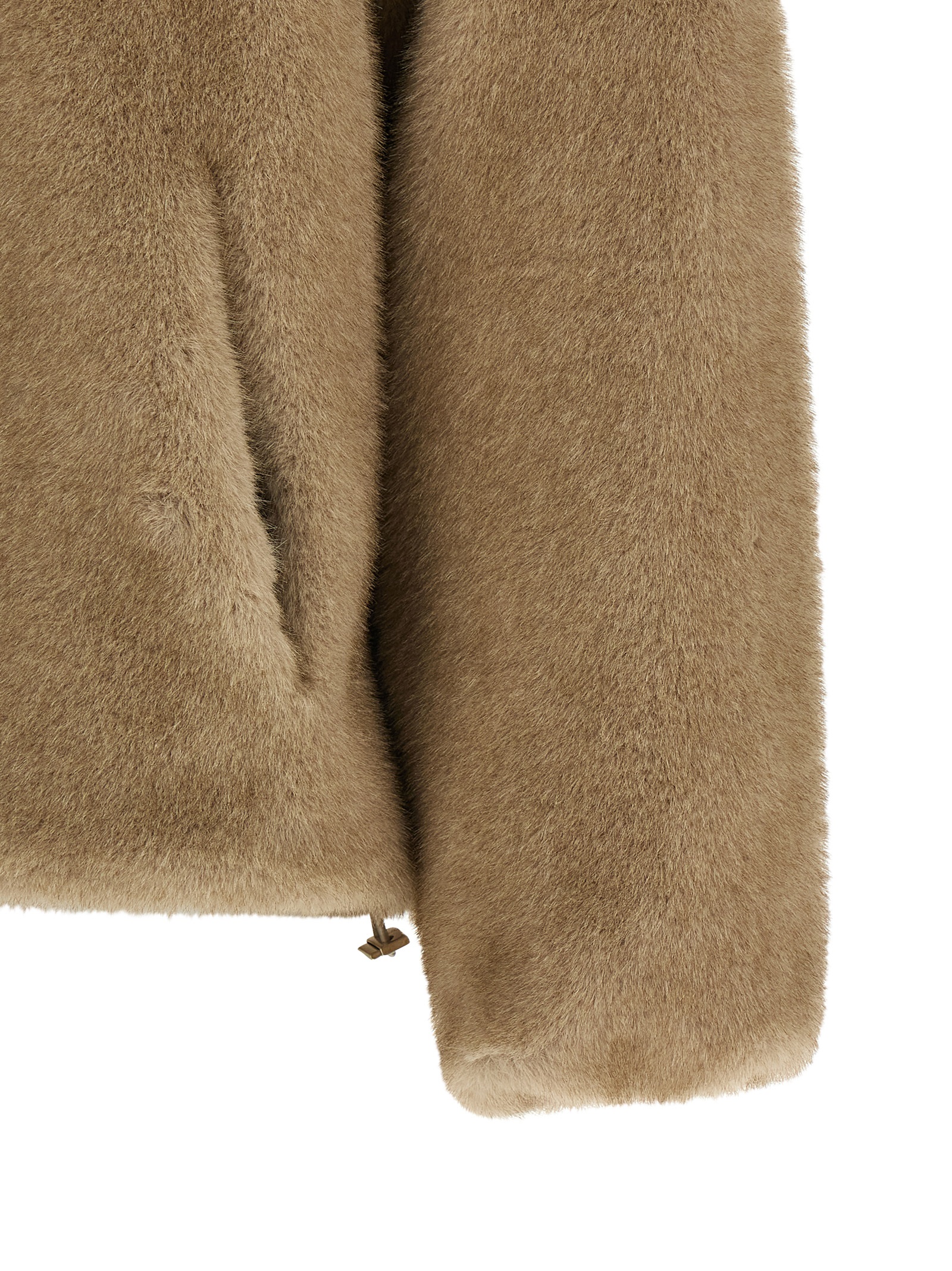 Short-haired eco fur coat with adjustable hood, front zip closure, pockets, long sleeves with elastic cuffs, drawstring at the hem, monogram fabric lining.